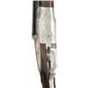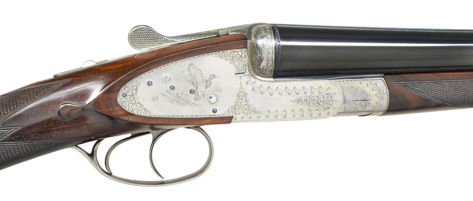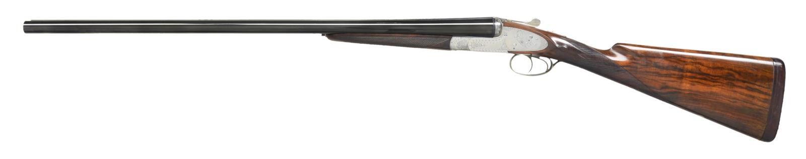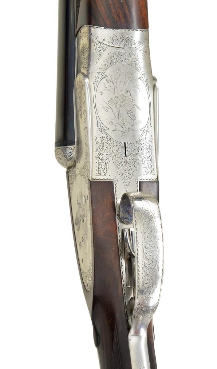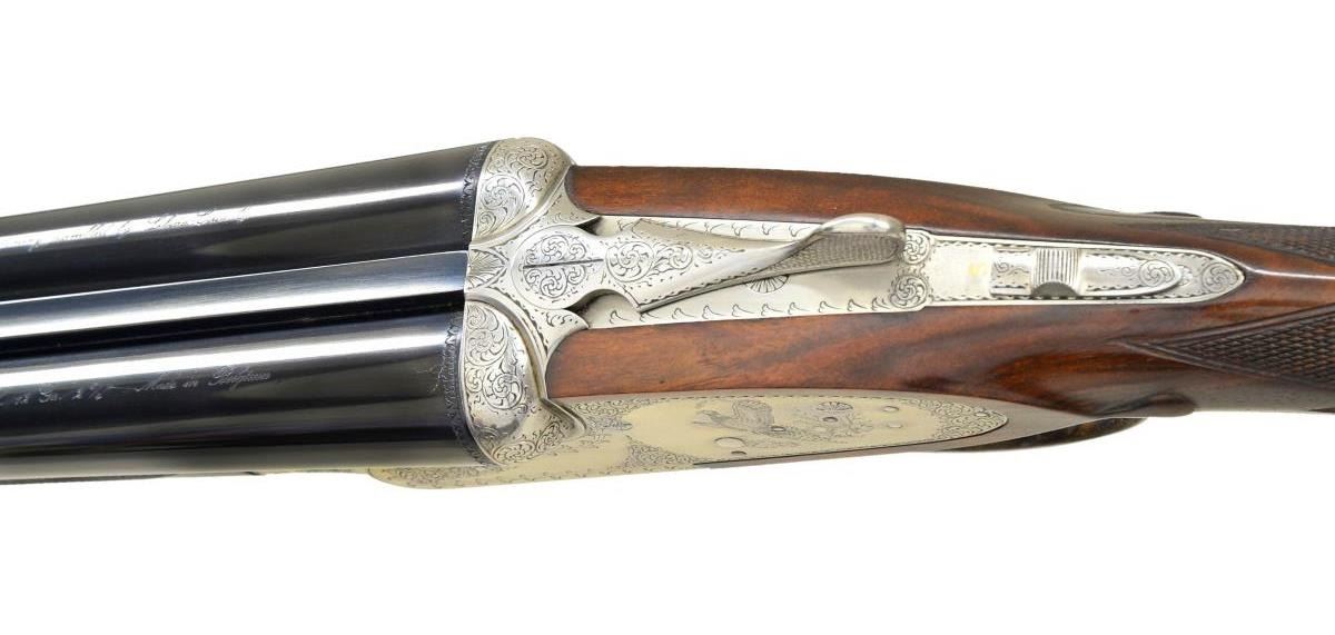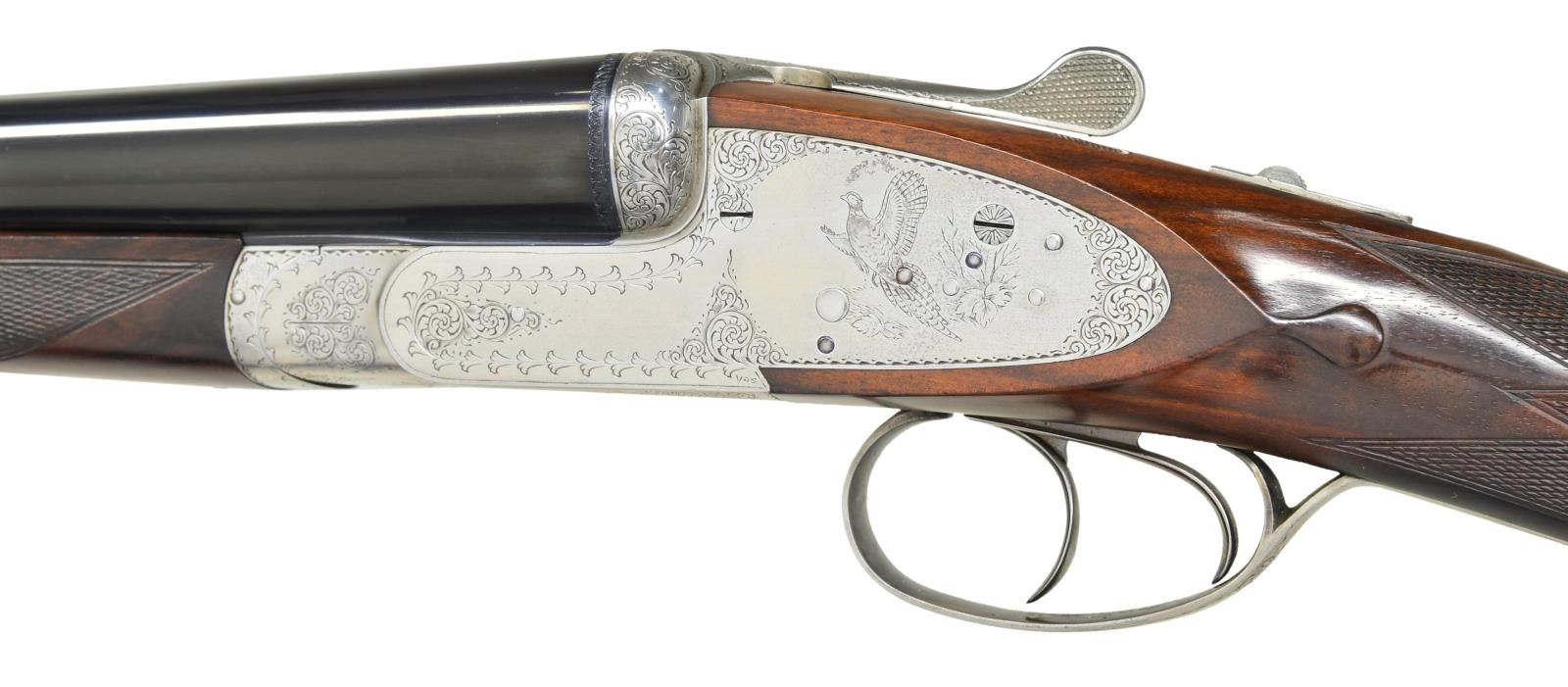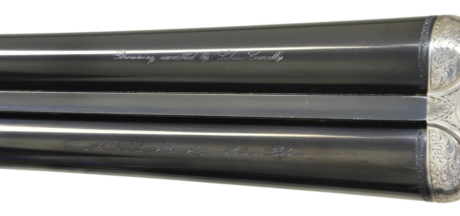 COURALLY. Cal. 12 Ga., 2 3/4". S# 918CS01060. Bbls. 28". Browning offered these fine guns through the custom shop until around 2006. At that time, the LC2 retailed for over $22,000. This gun has 28" chopperlump barrels fitted with narrow swamped game rib. Tops of barrels are engraved "Browning Assembled by Lebeau-Courally" "Mod. BSL 12 Ga. 2 3/4" Made in Belgium". Barrel flats are stamped with 1986 Belgian Nitro proofs for 2 3/4" chambers. Coin finished sidelock action features non-automatic safety ("S" inlaid in gold) and double triggers (front hinged). Belgian nitro proofs, serial number and importer's mark are on case hardened water table, otherwise action is not maker marked. Action is nicely filed and engraved with 80% coverage well cut scroll within scroll and geometric borders which surround scenes of game birds. A flushing pheasant is on left lockplate; a duck settles into marsh on right. Bottom of action is engraved with woodcock about to land under an alder tree. Engraver's signature "VOS" (Edouard Vos, noted Browning engraver) is on left side bottom rear of action. Trigger guard with scroll on bow has serial number on tang. Straight grip buttstock of attractively marbled and lightly figured dark European walnut measures 15 1/2" over brown leather covered pad. Nicely shaped drop points are behind lockplates; point pattern checkering with bead borders is at grip; and a vacant silver oval is on toeline. Matching splinter ejector forend has Anson release. MEASUREMENTS: BBLS: Bore Diameter: R .724", L .726". Restriction: R .016 (LIGHT MOD), L .024" (MOD). Min. Wall Thickness: R .033", L .032". STOCK: DAH: 2 5/8". DAC: 1 9/16". LOP: 15 1/2". CAST: neutral. WEIGHT: 7 lb. 1 oz. CONDITION: very fine, barrels retaining over 95% original blue with a few light scratches and assembly marks. Action and lockplates retain nearly all of their bright coin finish with evidence of cleaning and some light remaining frosting, mostly on left lockplate pheasant scene. Stocks retain over 90% of their original oil finish with a few minor handling marks, mostly on left side of butt. Checkering shows little wear. Bores are bright and shiny without any noted problems. Action is tight. Barrels are on face. Ejectors are in time. There is a 1/2" by 3/16" chip in wood in left barrel channel tip of forend and a small associated sliver which runs about 3/4" along barrel channel ridge. A very fine collaboration of two famous names in gun making. No Browning collection would be complete without one of these very hard to find high quality guns. (22-4530/MGM). MODERN. $10,000-20,000.