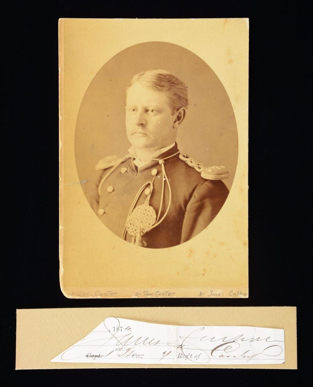 CALHOUN, KILLED AT LITTLE HORN, GEORGE CUSTER'S BROTHER IN LAW. Cabinet card of Lt. James Calhoun in 7th Cavalry dress uniform along with 1874 dated clipped autograph signed with rank in 7th US cavalry. CONDITION: good sharp image overall, light staining and darkening of board mount, good contrast. Signature is closely trimmed. PROVENANCE: Martin Lane Historic & Western Americana Lifetime Collection. (02-21893/JS). $800-1,200.