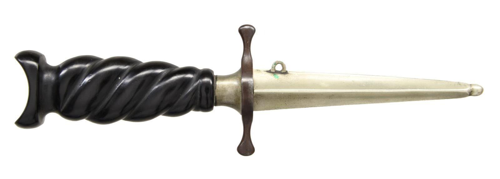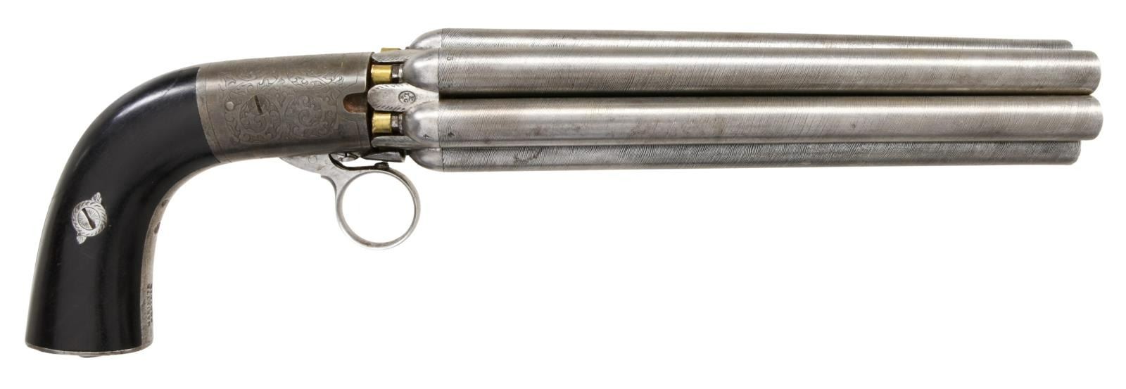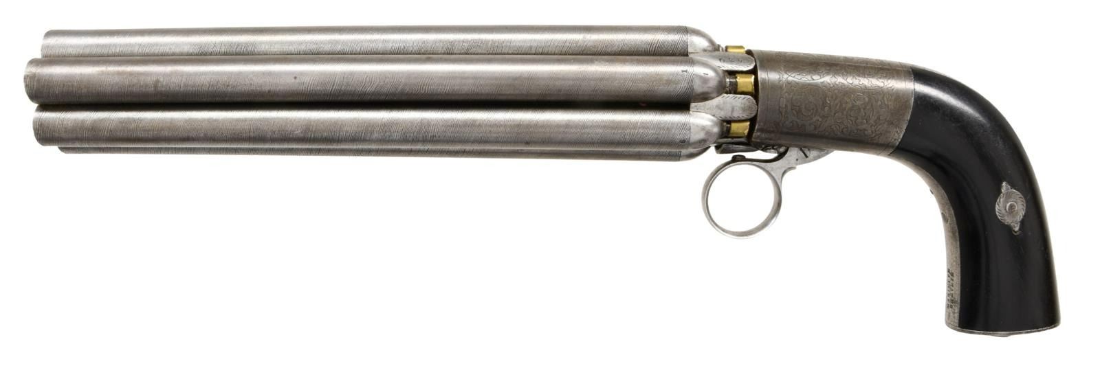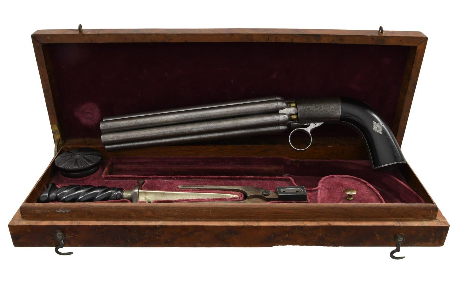 TRIGGER PEPPERBOX PISTOL WITH ACCESSORIES INCLUDING VERY FINE EBONY HANDLED DAGGER. Cal. 36. S# 430. The group of six 7-1/2" twist steel smooth bore barrels screw off of rotating breech section fitted with percussion nipples. Each barrel is numbered to its respective breech boss. Brass guards are in place on nipples. Breech section is stamped with Belgian proof and S#. Boxlock type, ring trigger, double action revolving mechanism is nicely engraved with open scroll. "MARIETTE" "BREVETE" is on front grip strap. Grips are of uncheckered ebony. Steel grip cap is engraved in spiderweb pattern. UNATTACHED ACCESSORIES: pistol is housed in its original birds eye burl walnut case with dual hook closure. Case is lined in burgundy velvet. There are a number of good quality accessories included: (1) a very fine dagger with 3-1/2" four fluted blade, iron cross guard and nicely rope carved ebony handle. Dagger retains its original German silver sheath. It was an original accessory and fits case perfectly. (2) an unmarked steel two cavity bullet mould and (3) carved ebony cap container. A covered compartment holds three cast balls. CONDITION: very good to fine. Metal mostly smooth gray patina retaining bright polish on ring trigger. Bores are lightly pitted. Mechanically fine. Case is fine retaining nearly all its original varnish on exterior. Interior cloth is dusty and shows rubs and compressions. Accessories are fine with heat discoloration on bullet mould and bright blade on dagger. (01-23956/MGM). ANTIQUE. $7,000-8,500.