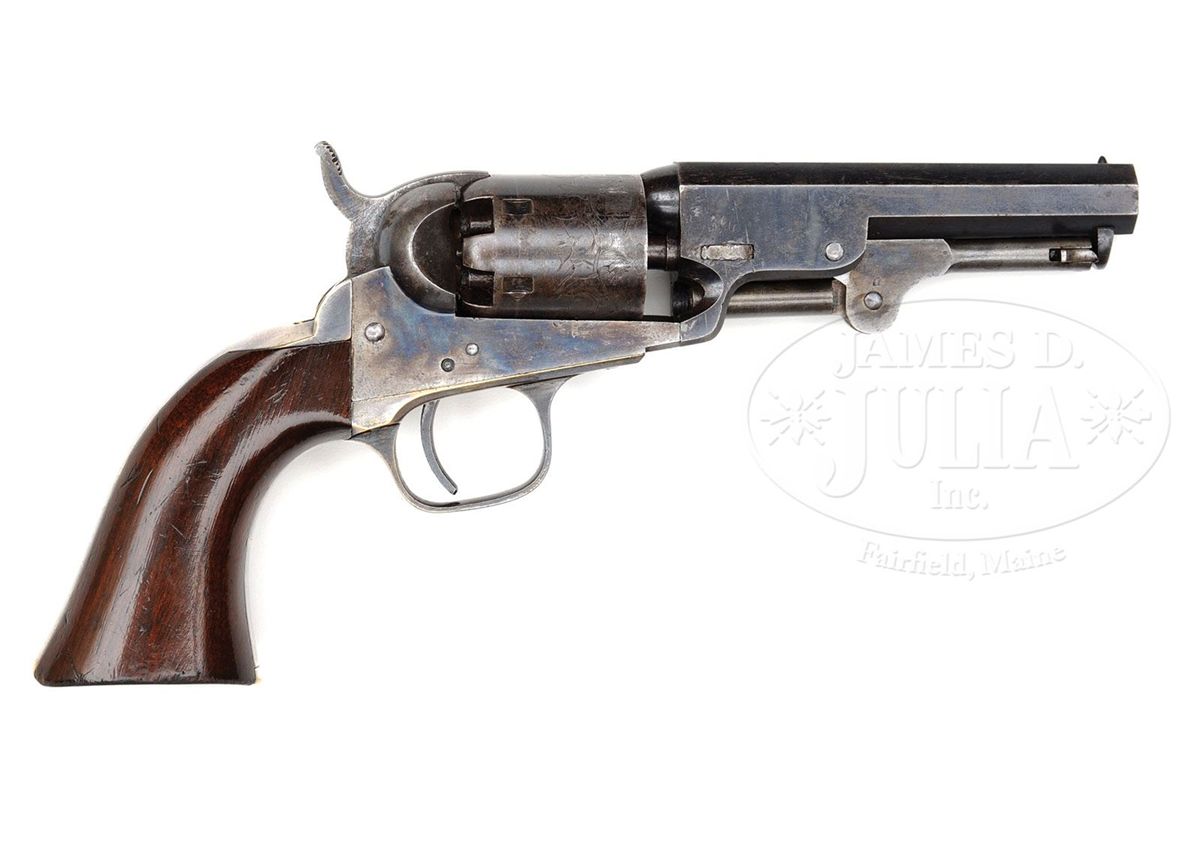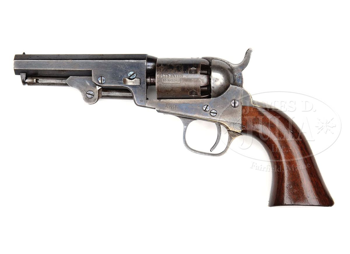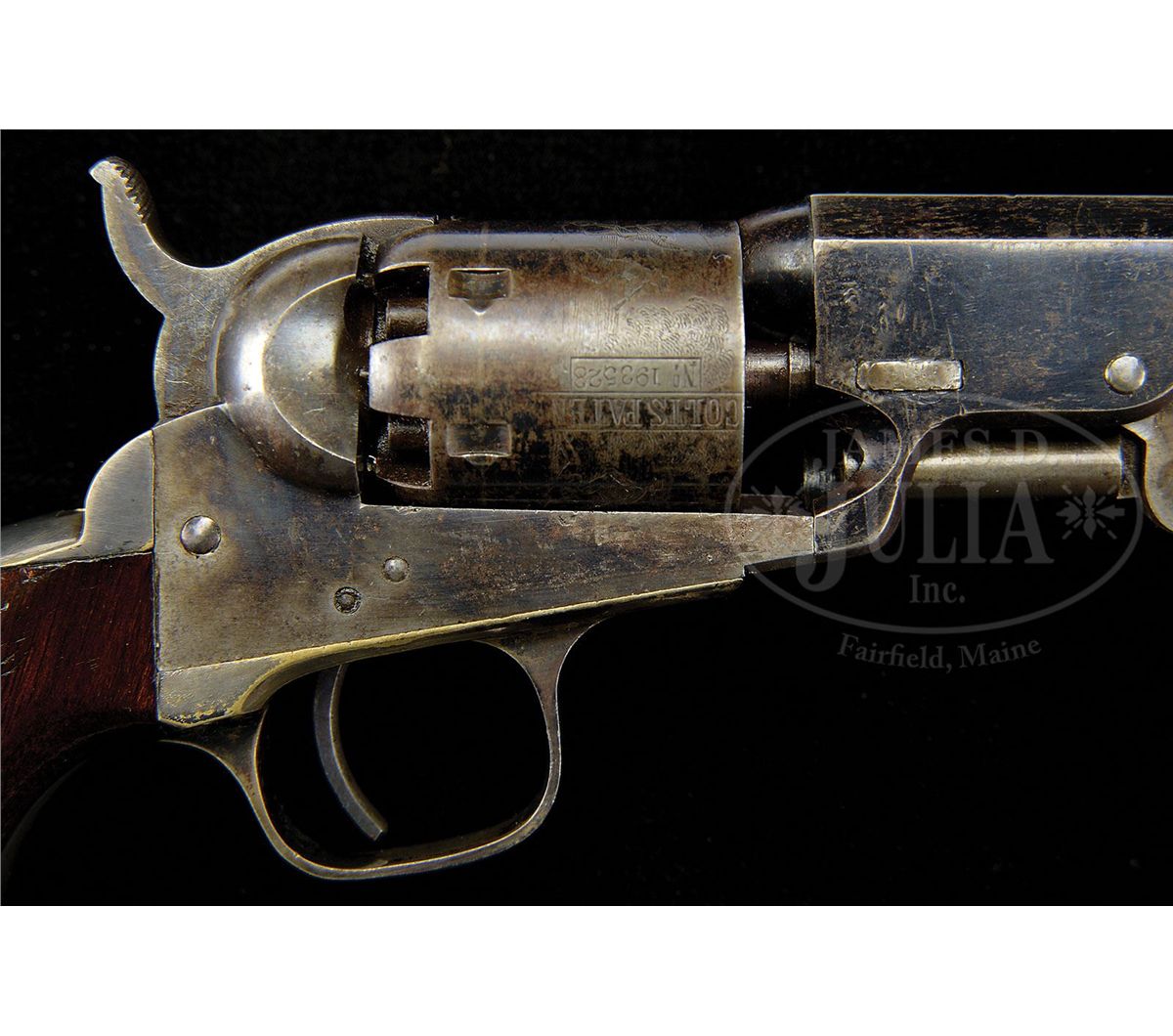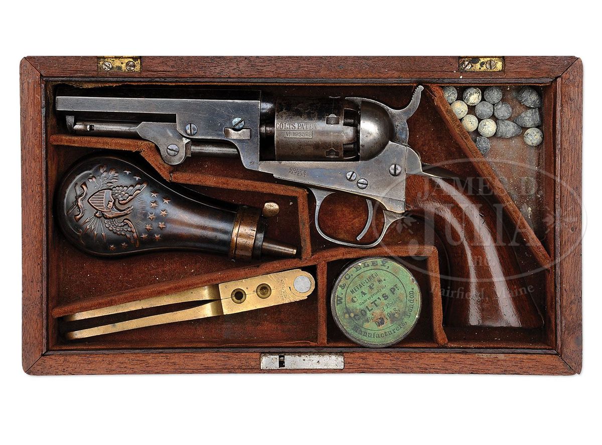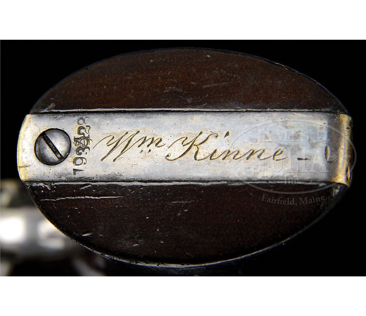 SN 193528. Cal. 31. Blue & color case hardened with 4" oct bbl, pin front sight and 1-line New-York U.S. America address. Left side of the frame has a small "COLTS PATENT" & the silver-plated brass trigger guard and backstrap contain a 1-pc walnut grip with last 4 digits of SN that appears to be "3428". Cylinder is 6 shots with stagecoach holdup scene roll marking and 4 of the safety pins prominent & serviceable. SN on all parts is "193528" or partial number thereof except trigger guard & buttstrap which were originally numbered "193428" and have "4" stamped over the "5" in these two locations. Buttstrap is inscribed in period script "Wm Kinne". William W. Kinne enlisted in the 90th NY Infantry as an assistant surgeon, commissioned by the governor of New York on Dec 20, 1861. The 90th NY was almost immediately dispatched to Key West, FL where it remained until late 1862. Surgeon Kinne apparently contracted a tropical type fever & petitioned to be reassigned to a more northern latitude. In May 1862, Surgeon Kinne was granted a 30 day leave of absence to return to New York in an attempt to recover his health. Instead, on June 29, 1862 he resigned and was honorably discharged. It is unclear if Surgeon Kinne actually was involved in any active fighting. Accompanied by an orig burgundy velvet lined Colt mahogany casing, compartmented in the bottom for the revolver, a single sided eagle & stars pocket size flask, a brass 2 cavity "COLTS PATENT" mold without sprue cutter & an early tin of Eley's caps. Also accompanied by a packet of information about Surgeon Kinne's service and the 90th NY Infantry along with 2 reproduced photos. PROVENANCE: Marlan Polhemus Collection. CONDITION: Fine to very fine, all matching as noted above. Bbl retains 85-90% strong orig blue with the loss areas flaked, not worn to a medium patina. Rammer and pivot retain strong case colors. Frame retains strong case colors on sides, turned silver on the recoil shields. Hammer retains strong case colors on the sides with pitting on the nose. Cylinder retains 60-70% thin orig blue and shows 96-98% stagecoach holdup scene. Trigger guard and backstrap retain most of their orig silver plating showing only light wear on the heel. Grip is sound with light edge wear & retains most of it's orig bright varnish. Mechanics are fine, bright shiny bore. Case has a couple of grain checks in the bottom and a circular stain on the lid with light handling & storage marks and retains most of its orig varnish. Interior is moderately to heavily faded with light staining inside the lid with one faded spot. Bottom is moderately to heavily soiled. Flask is fine with a few small dents and retains about 75% of it's orig finish. Mold has a few small dings on the sides & top with crisp, bright cavitities. Cap tin is fine. 4-48746 JR84