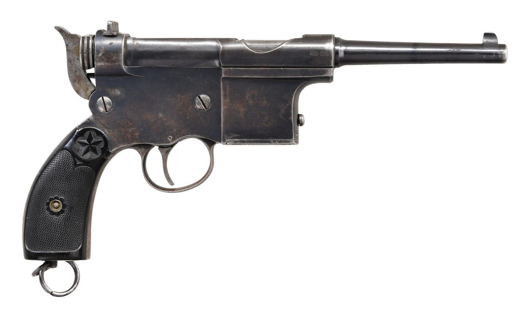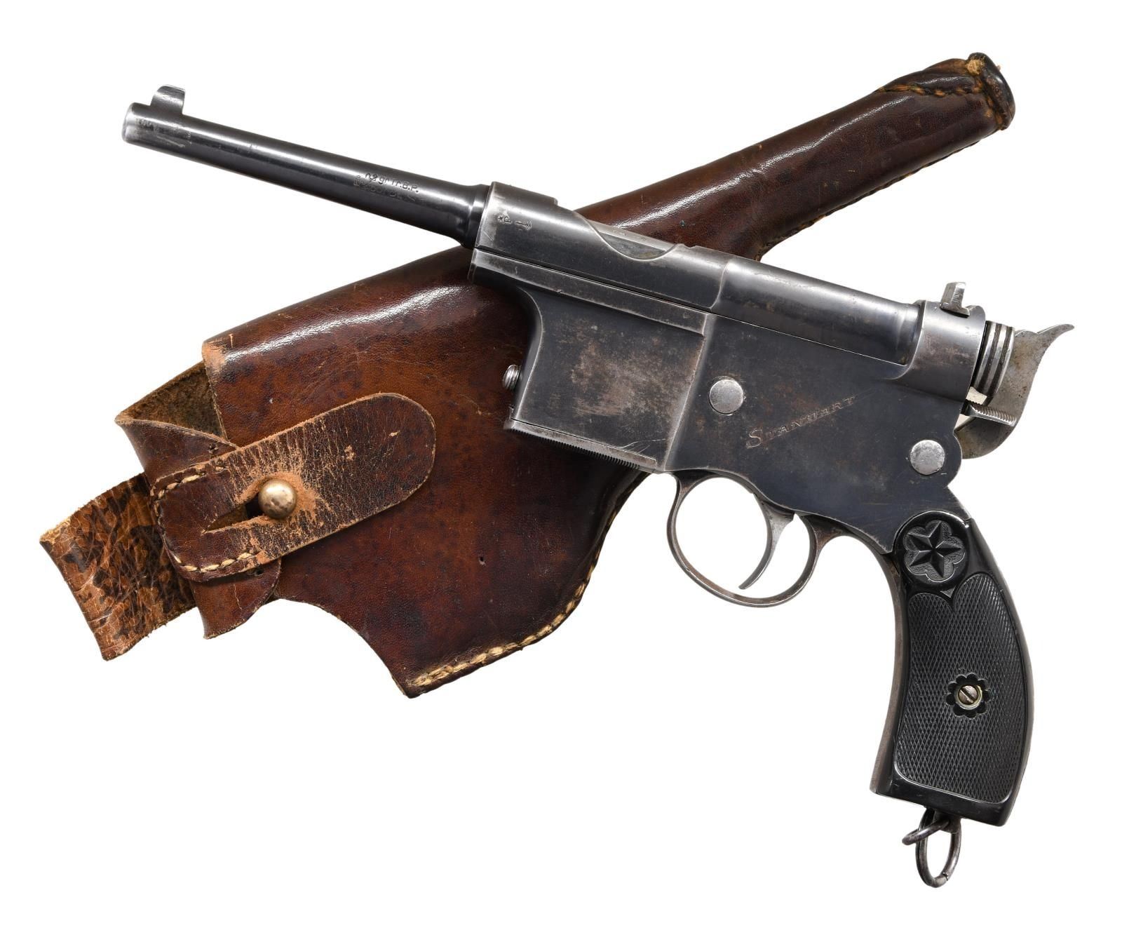 Cal. 5mm Clement. S# 2359. Bbl. 4". Blade front sight. U-notch rear sight. Scarce Spanish designed pistol that is similar to the famous C96 Mauser Broomhandle. Later production model assembled in Liege. Bbl. & right side of frame have German "BU" proofs. Left side of frame has Belgian Perron proof & "STANDART" marking. Blued finish. Checkered black hard rubber grips w/ five pointed star logo. Oddly a small piece of wood is present under grips. UNATTACHED ACCESSORIES: period brown leather holster. CONDITION: grips show a couple chips, some checkering wear, dings & handling marks. Metal retains 50% original blue w/ scattered fading to gray, dings, some scratches & oxidation. Fair bore w/ scattered frosting & oxidation but evident rifling. (01-25352/MJC). CURIO. $800-1200.