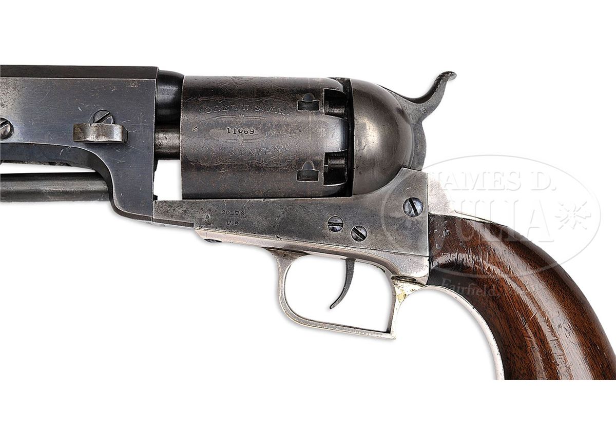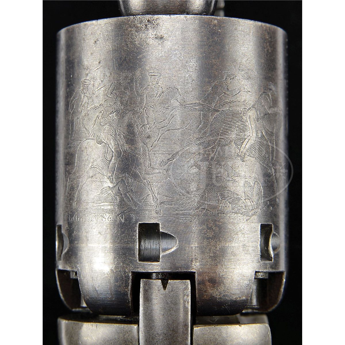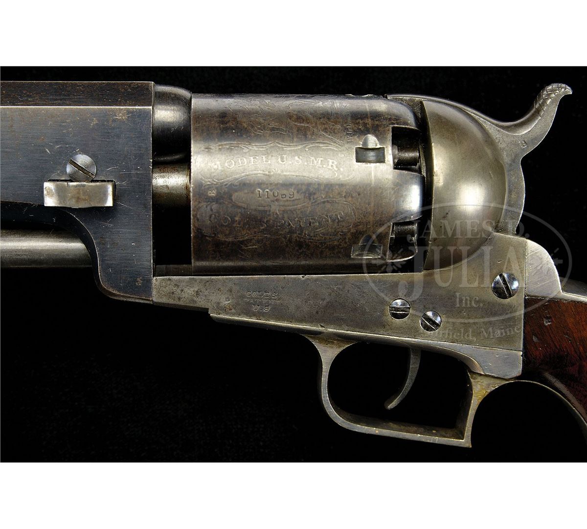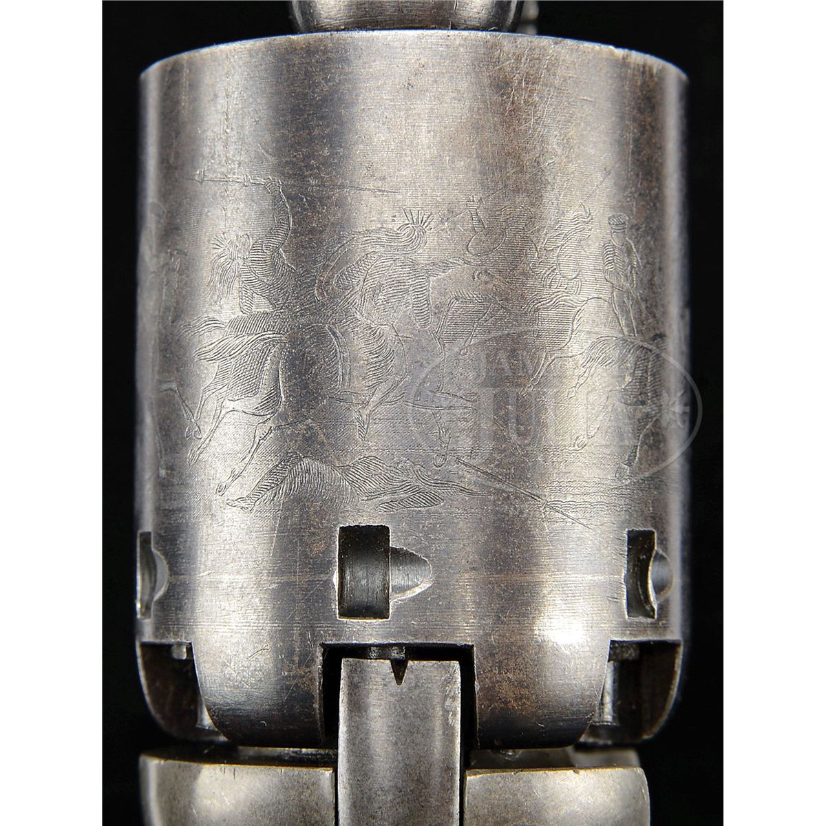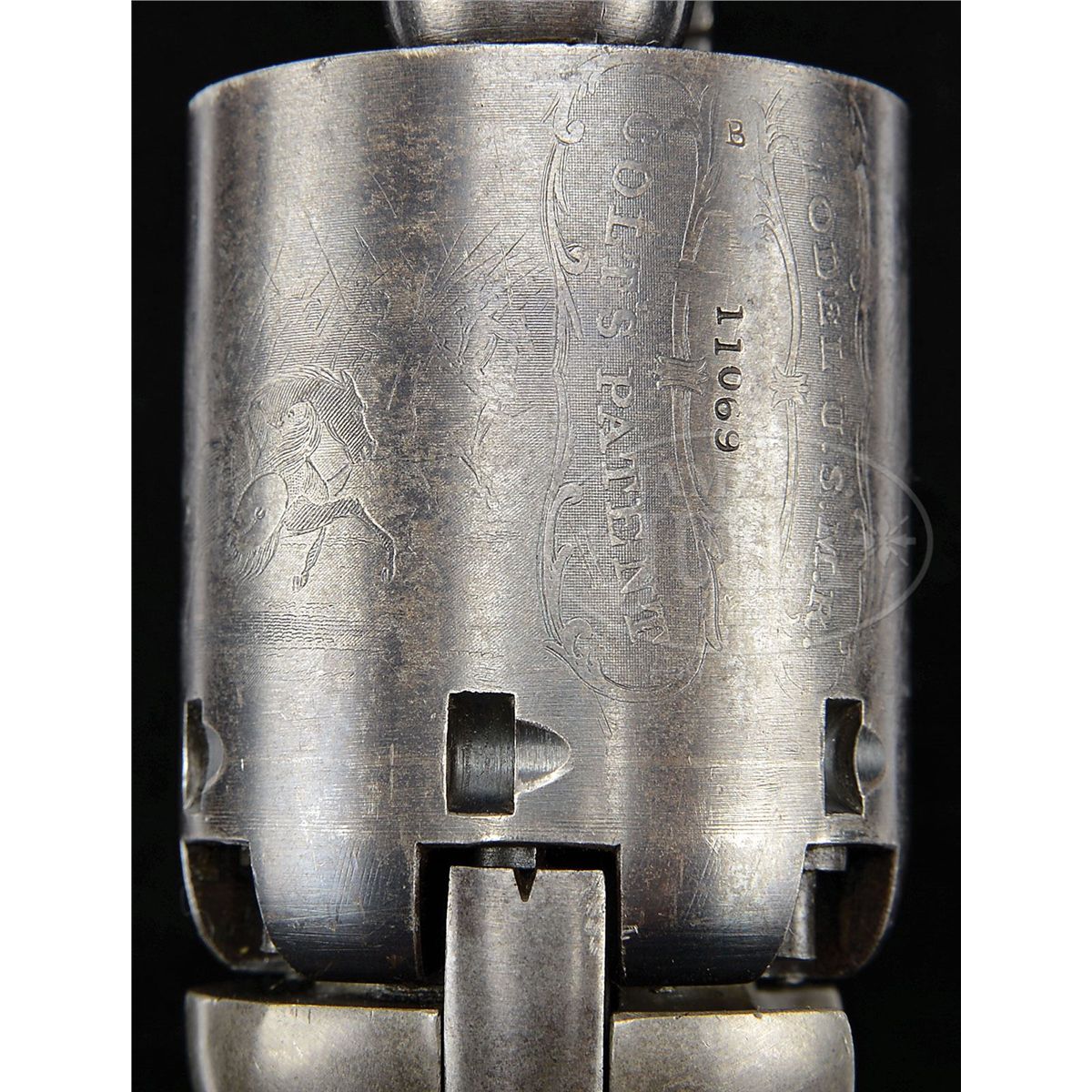 SN 11069. Cal. 44. Blue & color case hardened with 7-1/2" oct to rnd bbl, German silver front sight and New York City address with brackets. Left side of frame is marked with a tiny "COLTS PATENT" over a tiny "U.S." The silver plated brass trigger guard & back strap contain a varnished 1-pc walnut grip numbered "11059" in the back strap channel, obviously an assembler's mistake. Cyl is usual 6-shots with Dragoon/Indian fight scene roll marking and "MODEL U.S.M.R. / COLT'S PATENT" panels around the SN. Hammer spring is flat style. According to Flayderman's Guide to Antique American Firearms there were only about 2,700 2nd Model Dragoon revolvers produced in the period 1850-1851, making them the lowest production of all the Dragoon revolvers and the most scarce to find, especially with high orig finish. Dragoon revolvers were much sought after as sidearms for use on the American frontier and continued throughout the Civil War and post-war years during the great westward expansion. They usually saw hard & continuous service with very limited maintenance and are very rarely encountered, especially with any orig finish. PROVENANCE: Dr. John Pickup Collection. CONDITION: Extremely fine plus, all matching except grip as noted which is, obviously, an assembler's mistake as this grip is a perfect fit and has matching condition. Bbl retains 93-95% strong orig blue with sharp edge wear, some minor flaking and a small cleaned rust spot on the right side near the muzzle; rammer & handle retain dark case colors as is typical of Colts of this era; frame retains most of its orig muted case colors, turning silver on recoil shields; hammer retains about 75% orig case colors with some minor pitting on hammer nose; cyl retains a thin blue/brown patina and shows about 95% Dragoon/Indian fight scene roll marking with fully legible panels around SN; trigger guard & back strap retain virtually all of their orig silver plating. Grip is sound with good edges, a few nicks & scratches and retains most of its orig varnish. Hammer is not solid in half cock notch, otherwise mechanics are fine, brilliant shiny bore with a few scattered spots of pitting. An exceptional and rare Dragoon. 4-46442 JR54