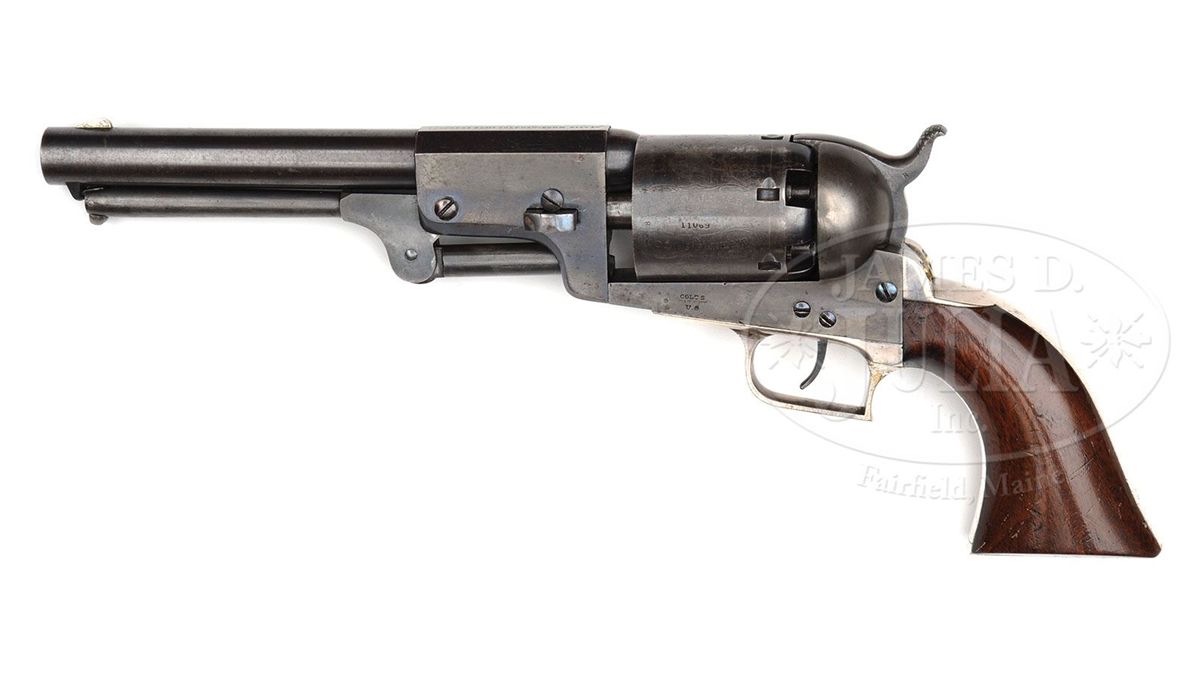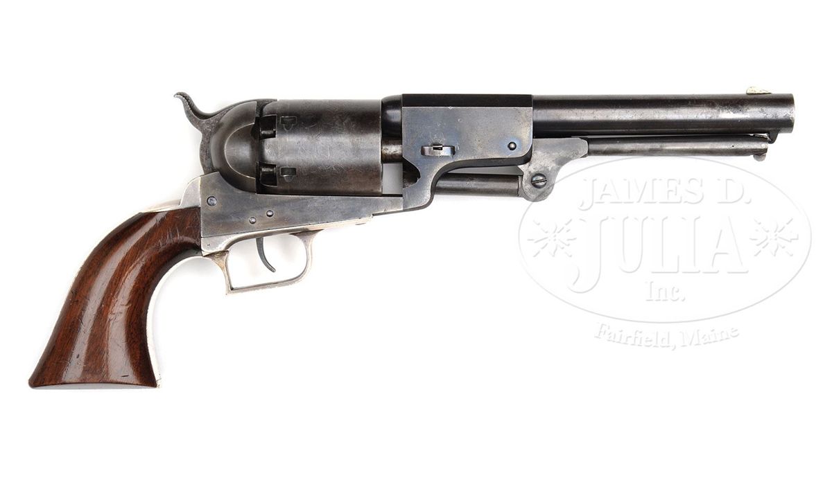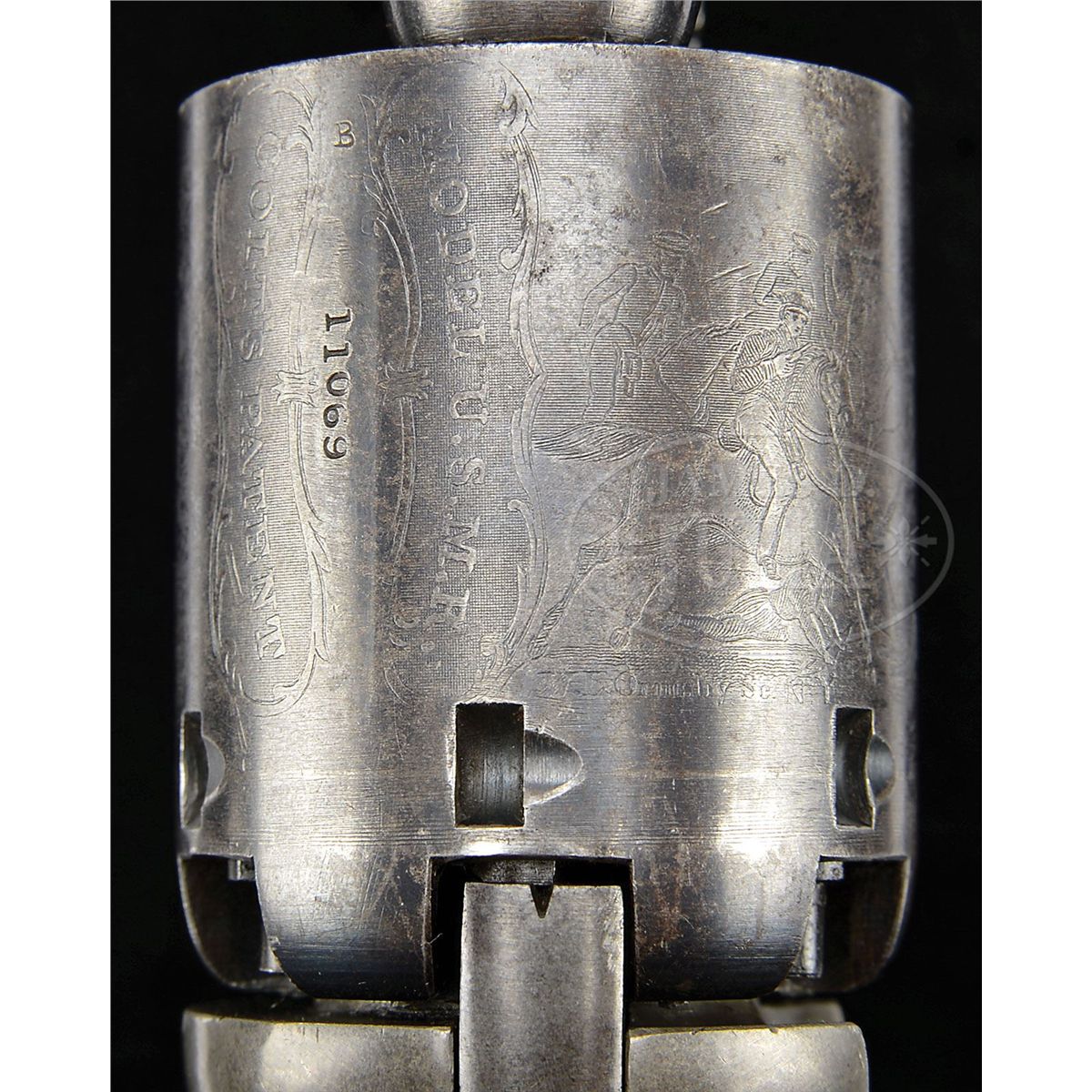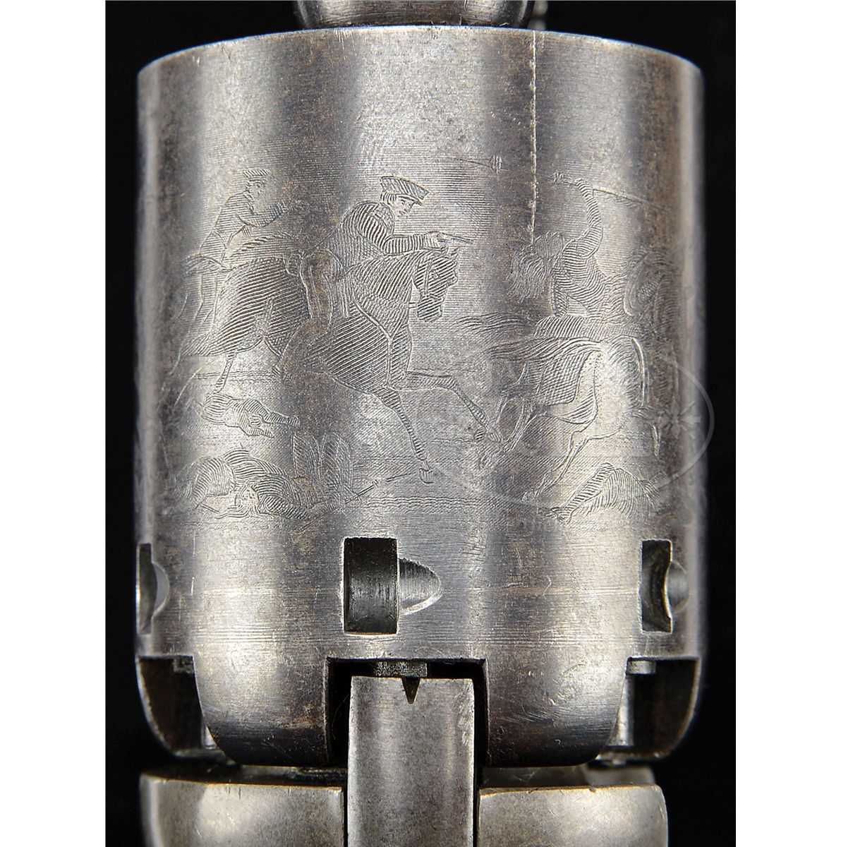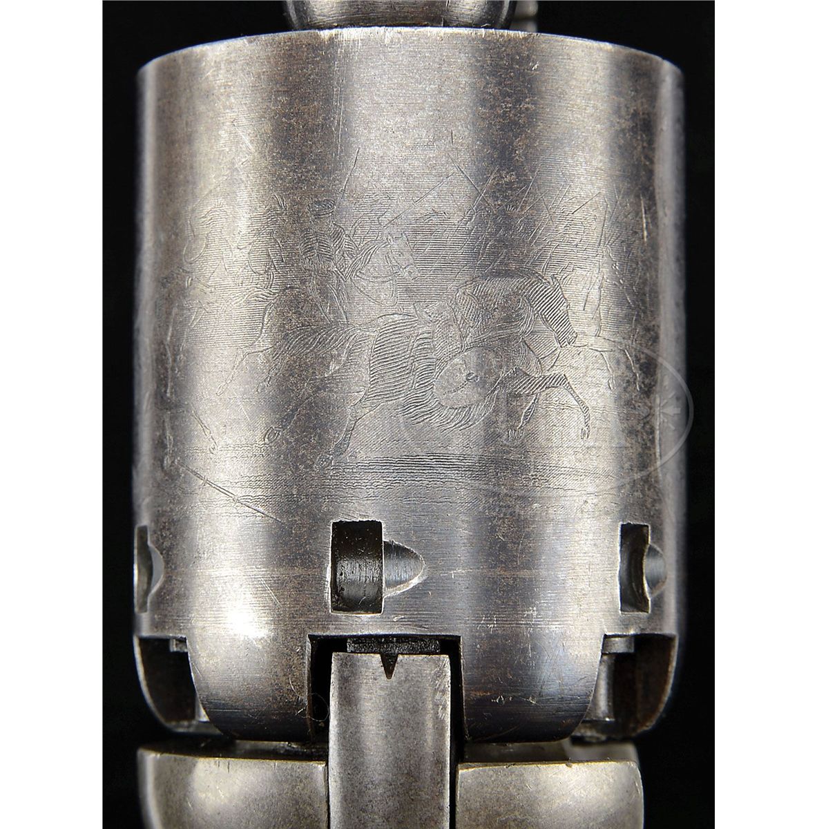 SN 11069. Cal. 44. Blue & color case hardened with 7-1/2" oct to rnd bbl, German silver front sight and New York City address with brackets. Left side of frame is marked with a tiny "COLTS PATENT" over a tiny "U.S." The silver plated brass trigger guard & back strap contain a varnished 1-pc walnut grip numbered "11059" in the back strap channel, obviously an assembler's mistake. Cyl is usual 6-shots with Dragoon/Indian fight scene roll marking and "MODEL U.S.M.R. / COLT'S PATENT" panels around the SN. Hammer spring is flat style. According to Flayderman's Guide to Antique American Firearms there were only about 2,700 2nd Model Dragoon revolvers produced in the period 1850-1851, making them the lowest production of all the Dragoon revolvers and the most scarce to find, especially with high orig finish. Dragoon revolvers were much sought after as sidearms for use on the American frontier and continued throughout the Civil War and post-war years during the great westward expansion. They usually saw hard & continuous service with very limited maintenance and are very rarely encountered, especially with any orig finish. PROVENANCE: Dr. John Pickup Collection. CONDITION: Extremely fine plus, all matching except grip as noted which is, obviously, an assembler's mistake as this grip is a perfect fit and has matching condition. Bbl retains 93-95% strong orig blue with sharp edge wear, some minor flaking and a small cleaned rust spot on the right side near the muzzle; rammer & handle retain dark case colors as is typical of Colts of this era; frame retains most of its orig muted case colors, turning silver on recoil shields; hammer retains about 75% orig case colors with some minor pitting on hammer nose; cyl retains a thin blue/brown patina and shows about 95% Dragoon/Indian fight scene roll marking with fully legible panels around SN; trigger guard & back strap retain virtually all of their orig silver plating. Grip is sound with good edges, a few nicks & scratches and retains most of its orig varnish. Hammer is not solid in half cock notch, otherwise mechanics are fine, brilliant shiny bore with a few scattered spots of pitting. An exceptional and rare Dragoon. 4-46442 JR54