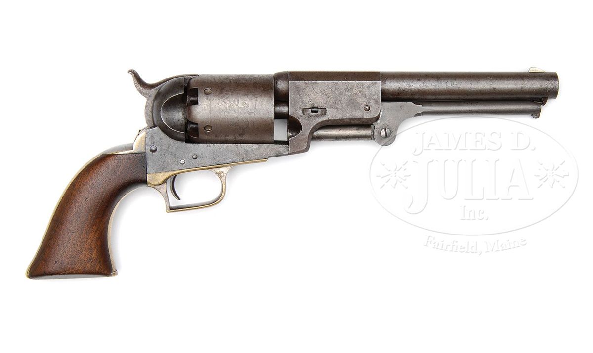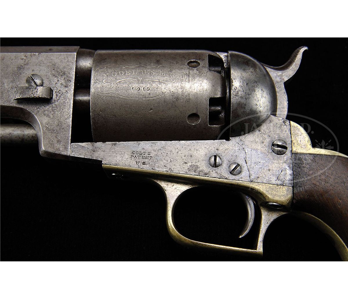 SN 1915. Cal. 44. Usual configuration with 7-1/2" oct to rnd bbl, German silver front sight and 1-line New York City left hand address. Left side of frame is marked with a tiny "COLT'S PATENT" over a tiny "U.S." The square-back brass trigger guard and backstrap contain a 1-pc walnut grip with last 3 digits of matching SN visible in the buttstrap channel. Cyl is usual 6-shots with a distinctive pressure ridge, oval cyl stop notches and the Dragoon/Indian Fight Scene roll-marking. SNs are of the very tiny Walker style. Rammer handle is marked with assembly number "35" with matching number on the bottom of bbl just forward of the rammer cut. According to Flayderman's Guide to Antique American Firearms there were about 7,000 of these scarce revolvers produced in the period 1848 to about 1850. These early 1st Model Dragoons received immediate acceptance by both the military and civilian markets and usually saw extensive hard service on the American Frontier under extreme adverse circumstances with little maintenance and are rarely found today in orig configuration with any orig finish. CONDITION: Very good to fine, all matching, including wedge, cyl and grip. Overall retains mostly a smooth gray brown patina with scattered pinprick pitting; frame has a casting flaw/hairline crack on left side, vertically between the trigger and hammer screws which does not effect operation at all; cyl is a matching patina with 2 areas of pinprick pitting, apparently from long term storage in a holster, and shows about 40-50% Dragoon/Indian Fight Scene with legible panels surrounding the SN; trigger guard and backstrap retain silver plating in sheltered areas, being mostly a medium mustard patina; grip has chipped toes, otherwise is sound, showing heavy wear and a hand worn patina; mechanics are fine; strong bright bore with moderate pitting. 4-47545 JR178