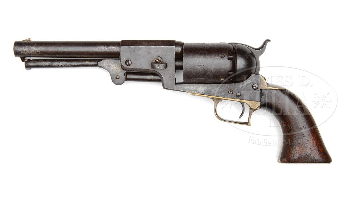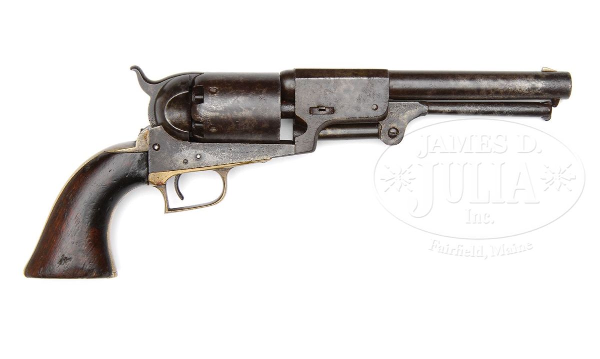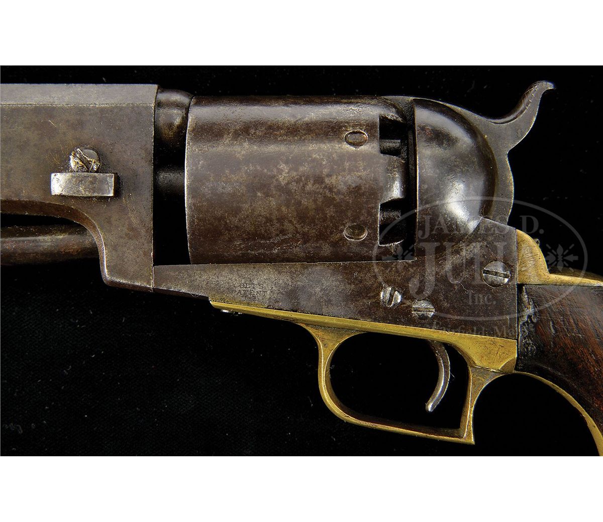 SN 5865. Cal. 44. Usual configuration with 7-1/2" oct to rnd bbl, German silver front sight and left hand New York City 1-line address. Left side of frame has a tiny "COLT'S PATENT" over a tiny "U.S." The square back brass trigger guard and backstrap contain a 1-pc walnut grip whose backstrap and buttstrap channels are dark and oil stained, obscuring any numbers present. Cyl is usual 6 shots with oval stop notches and traces of orig Dragoon/Indian Fight Scene roll-marking along with traces of a pressure ridge. According to Flayderman's Guide to Antique American Firearms there were about 7,000 of these scarce revolvers produced in the period 1848 to about 1850 with the majority of them seeing hard service on the American Frontier and later throughout the Civil War, usually under harsh circumstances with limited or no maintenance, and are rarely found today in orig configuration with any orig finish. CONDITION: Good to very good. Overall retains a mottled blackish brown attic finish with scattered pitting on right side; it is all matching except the wedge and grip, grip as noted above and the wedge has the number "351" in a matching size font indicating an orig equipment period of use replacement; cyl has a line of deep pitting with some scattered fine pitting; grip has chipped toes and shows heavy wear with traces of orig finish and retains a dark hand worn patina; mechanics are fine; worn dark pitted bore. 4-47543