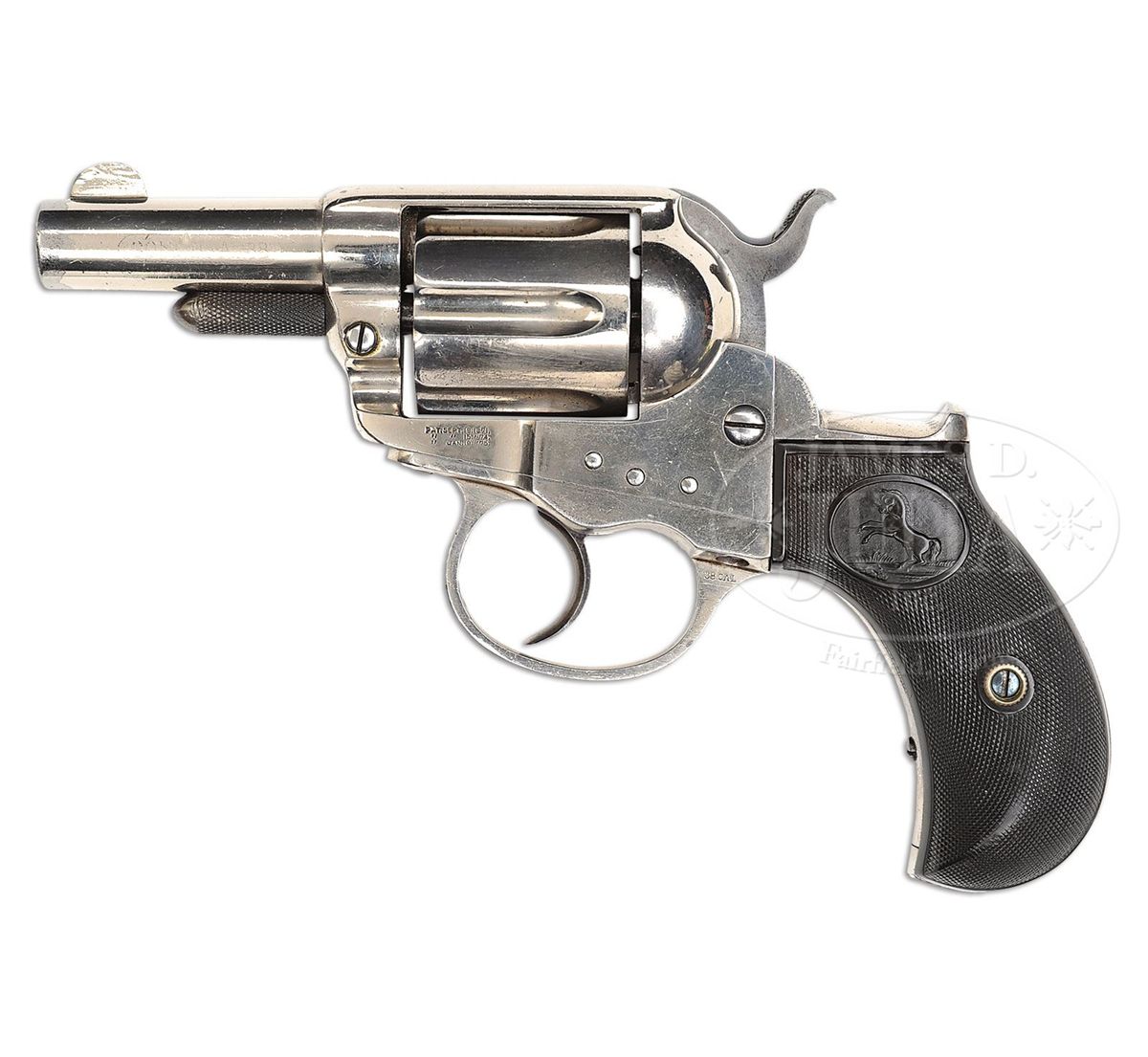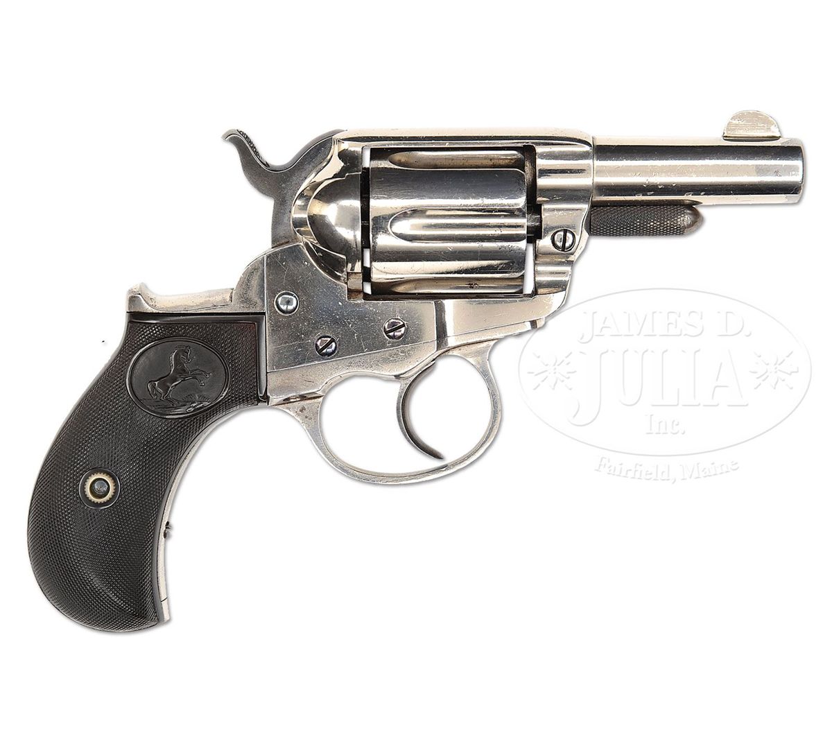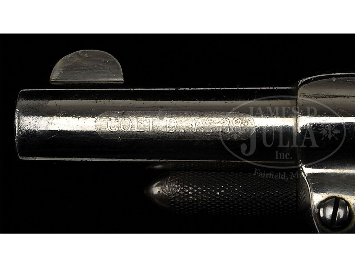 SN 23536. Cal. 38 Colt. Nickel finish with 2-1/2" bbl. Half moon on front sight and 2-line address with etched panel "COLT D.A. 38" on the left side. Left side of the frame has 3-line patent dates and it is mounted with 2-piece Rampant Colt hard rubber grips. Left rear web of trigger guard has the caliber marking. Cylinder is usual 6 shots with long flutes. Accompanied by a Colt Factory Letter that identifies this revolver in 38 cal. with 2-1/2" bbl, nickel finish and rubber grips, shipped to Hartley & Graham, NY, NY on March 1, 1880 in a 75-gun shipment. Lightning revolvers are not terribly uncommon but Sheriff model configuration is quite scarce and those with etched panels are rare. CONDITION: Extremely fine. Overall retains virtually all of its strong orig nickel finish and most of the blue on the screws. Grips are sound and show light diamond point wear. Mechanics are fine. Bright, shiny bore. 4-49411 JR303