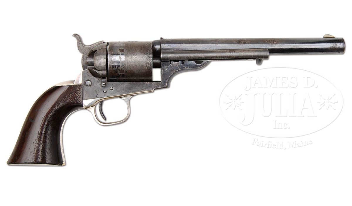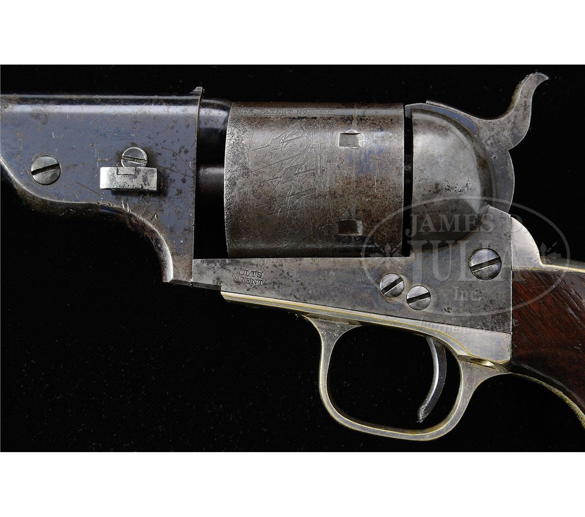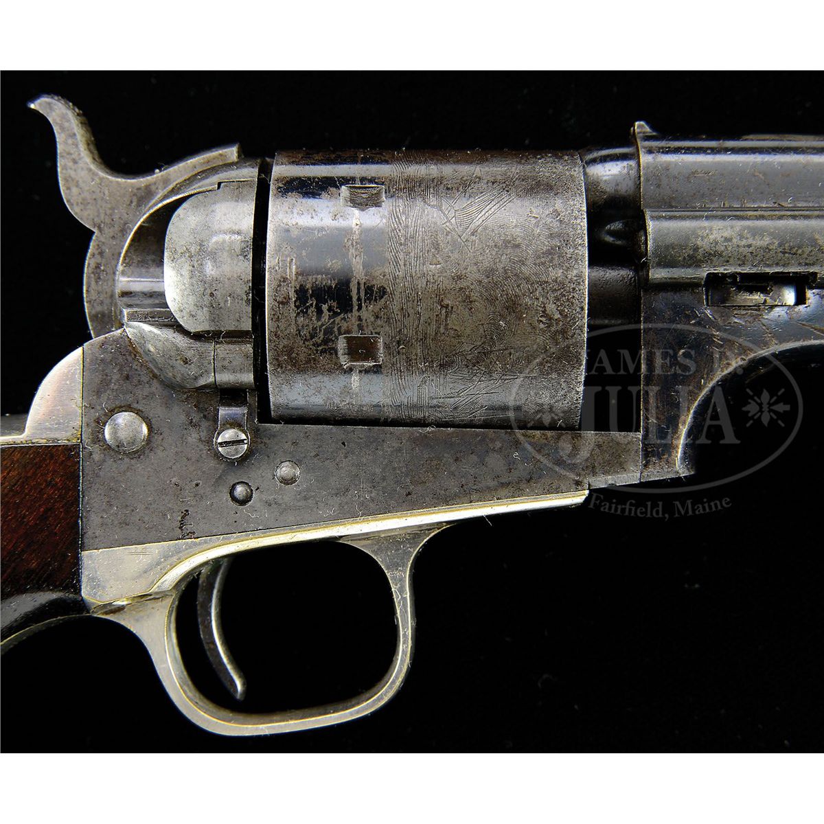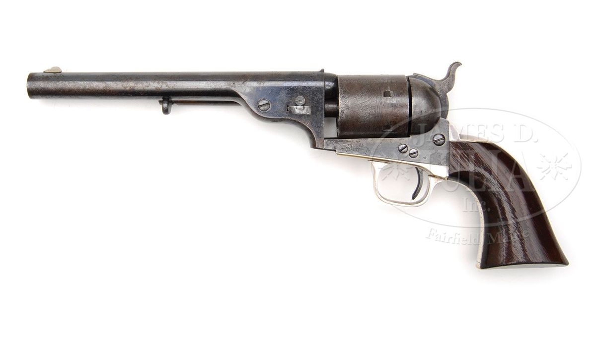 SN 127. Cal. 42 Stetson (44 RF Henry Flat). Usual configuration with 7-1/2" rnd bbl, German silver front sight and 1-line New-York U.S. America address with a fixed rear sight on breech end of bbl. Right side of bbl lug is mounted with an ejector housing with bull's eye ejector rod head. Left side of frame is marked "COLT' PATENT". Cyl is straight, unfluted, with Ormsby Naval battle scene roll marking. The silver plated brass trigger guard & backstrap contain a Navy-sized 1-pc walnut grip with matching SN in backstrap channel. The confusion regarding the actual caliber of these revolvers relates to the orig Stetson's Patent of the 44 rimfire cartridge. In 1871 when Mr. Stetson was granted the patent for his cartridge it was known as the 42 caliber Stetson because the land diameter of the bore of the revolver was actually .420" whereas the groove diameter is .440". In fact, p. 280 of A Study of Colt Conversions and Other Percussion Revolvers, McDowell, illustrates the Stetson cartridge and in the right hand column lists a factory letter for this exact revolver which states "Caliber .42 for Stetson cartridge". The barrel length, finish and stocks are not listed, "sold and shipped to Spies, Kissam & Co., New York, NY on July 18, 1872 in a 20-gun shipment." And thus creates the confusion in the actual caliber of this revolver. A physical test disclosed that a 44 RF Henry flat cartridge will chamber precisely. PROVENANCE: Dr. John M. Pickup Collection. CONDITION: Fine to very fine, all matching except wedge which is properly unnumbered. Bbl retains about 60-65% glossy orig blue with the losses primarily from flaking & cleaned spots which also have fine pitting resembling blood pitting; ejector housing is mostly a blue/brown patina; frame & hammer retain most of their orig case colors, turning dark and faded on the recoil shield & loading gate; trigger guard retains 95-96% strong orig silver and the backstrap/buttstrap retains about 85% orig silver; cyl retains 20-25% orig blue with the balance a brownish patina and light pitting around the front edge and shows about 75-80% Ormsby Naval battle scene. Grip is sound showing light edge wear, a few nicks & scratches and retains most of its orig varnish. Mechanics are fine, bright shiny bore with scattered moderate pitting. 4-46458 JR107