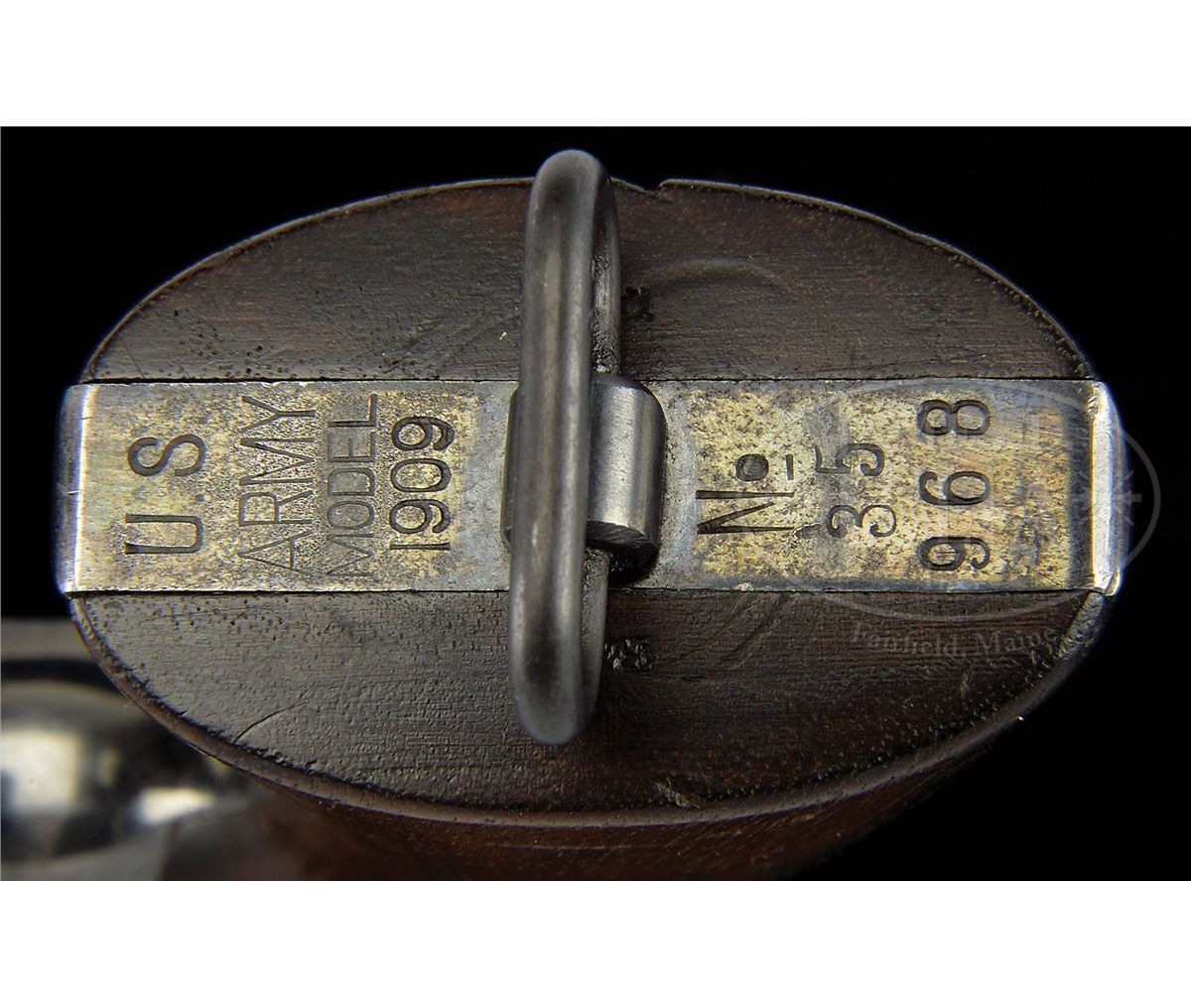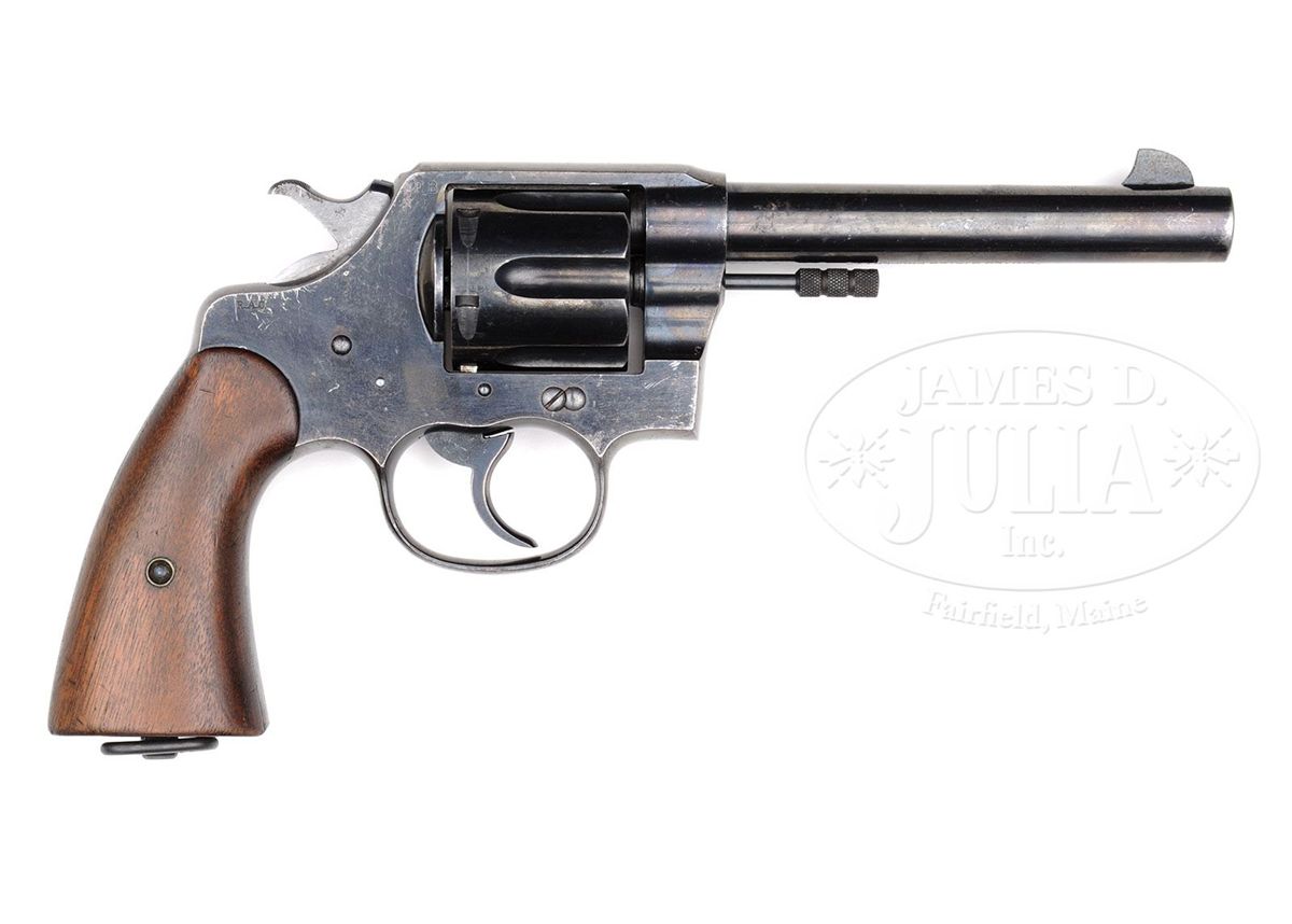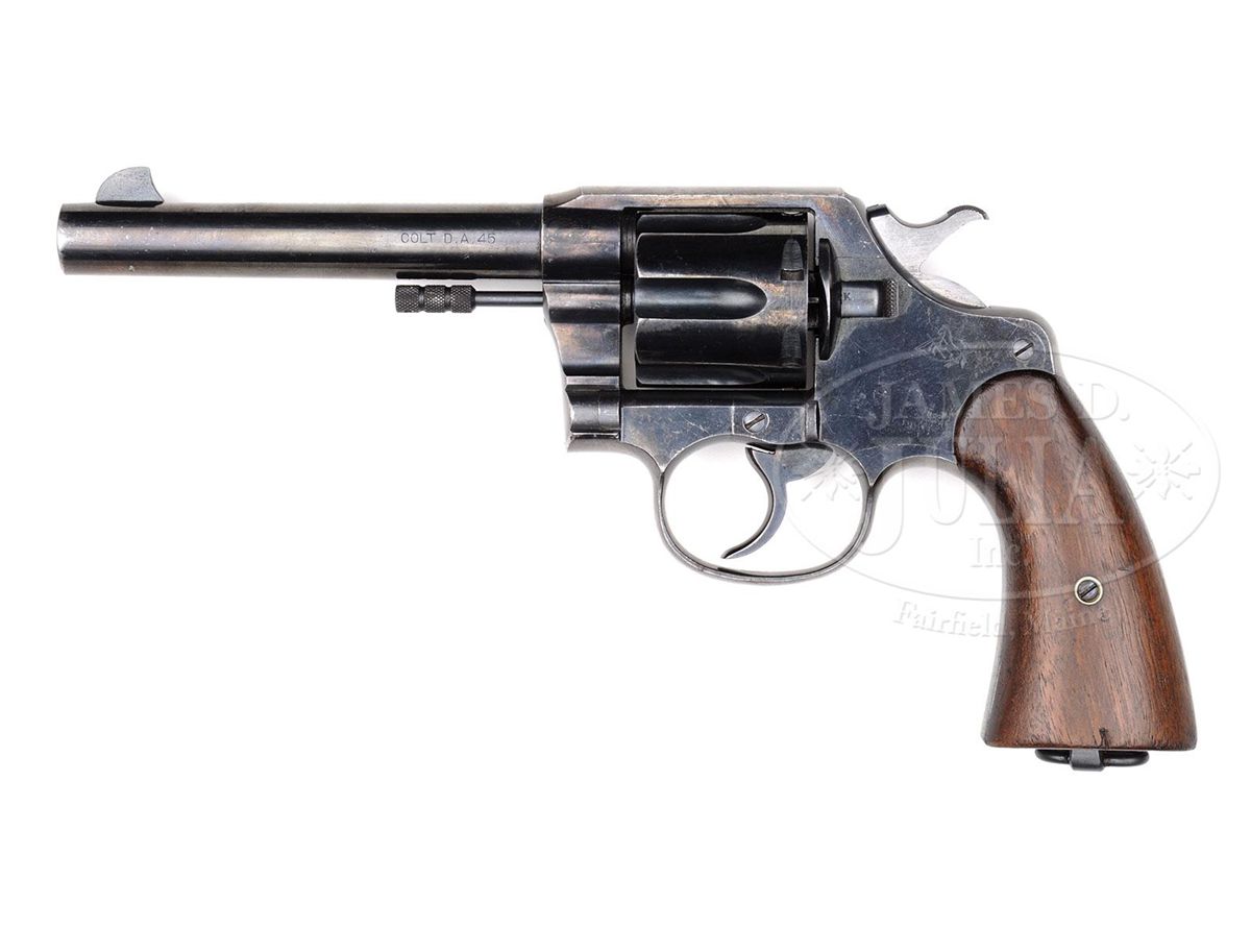 SN 35968. Cal. 45 Colt. Blue finish with 5-1/2" bbl, full front sight and 2-line address with caliber marking on the left side. Bottom of the bbl is marked "UNITED STATE PROPERTY". Side plate has the hook cylinder latch with rampant colt in a stylized "C". Buttstrap is marked "U.S. ARMY MODEL 1909" and the SN. Right rear side of the frame has the inspector initials "R.A.C." (Rinaldo A. Carr). Mr. Carr's initials also appear on the bottom edges of the grips, bottom of the bbl & rear face of the cylinder. These fine, big bore revolvers were ordered by the Army, Navy & Marine Corps after the .38 Colt cartridge was proven to be completely ineffective as a "man stopper" in the Philippine insurrection against the Moros. According to The Book of Colt Firearms, Wilson, there were approximately 18,600 of these revolvers produced for the Army & Navy and 1,400 for the U.S. Marine Corps. Although they were produced in substantial numbers they are rarely ever encountered with high orig finish having served from their 1909 issue dates throughout WWI & even into WWII. CONDITION: Very fine plus. Overall retains 92-94% strong orig blue with sharp edge wear and a few light scratches. Backstrap is slightly dulled and thin. Grips have a couple minor chips in the edges and show moderate wear with a fine hand worn oil finish. Mechanics are crisp. Brilliant shiny bore, may be unfired. 4-48339 JR93