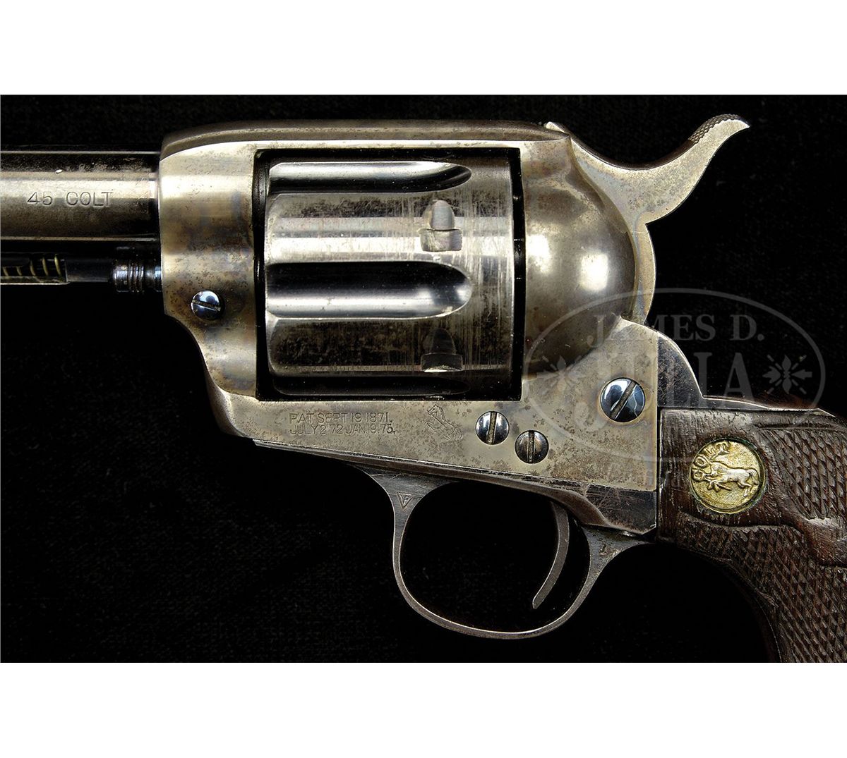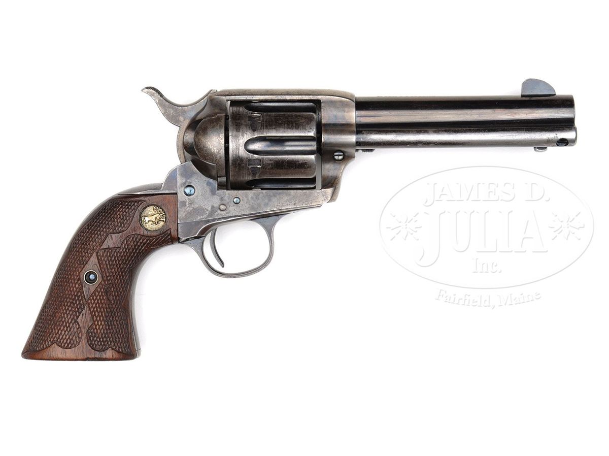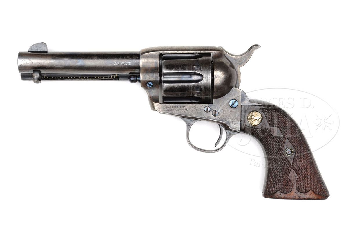SN 331060. Cal. 45 Colt. Blue & color case hardened with 4-3/4" bbl, slightly reduced front sight and 2-line address with caliber marking on left side. Left side of frame has 2-line, 3-patent dates and rampant Colt. Mounted with left & right, Colt silver medallion, diamond & fleur-de-lis carved, 2-pc walnut grips. Cyl is one of 1,478 Model 1878 DA Frontier cyls that Colt assembled in their Single Action revolvers from 1913-1915. After the Model 1878 was discontinued in 1905 these cyls remained in storage until 1913 when Colt, being the frugal enterprise they were known to be, decided to recycle them by cutting stop notches and approaches on the outer diameter and reworking the ratchet. All of these long flute Single Actions appear in the serial range 330001-331479 plus eight others reported outside of this serial range. This information was extracted from A Study of The Colt Single Action Army Revolver, Graham, Kopec & Moore. This revolver will letter in caliber 45 with 4-3/4" bbl, blue finish, type of stocks not listed and shipped to Krakauer, Zork & Moye Co., El Paso, TX on Sept. 18, 1914 in an 8-gun shipment. Special features shows that it was "Furnished with a double action cylinder of long flute configuration". While there were a significant number of these long flute Single Actions produced they are rarely encountered today. CONDITION: Fine. Bbl retains 75-80% glossy orig blue showing holster wear on the left side; ejector housing retains 70-75% orig blue in the gullets, mostly a silver/blue patina on outer radius; frame retains strong case colors in the most sheltered areas being mostly turned silver; hammer retains very bright case colors on the sides & rear edge, turned dark on top edge; trigger guard & backstrap retain bright blue in sheltered areas with the front & back straps a blue/brown patina; cyl retains bright blue in the flutes with strong blue on the front & rear faces, thin on outer diameter. Checkering on grips has been freshened on the left side with a ding on the right side and overall show moderate to heavy wear. Mechanics are crisp, brilliant shiny bore. 4-48780 JR349