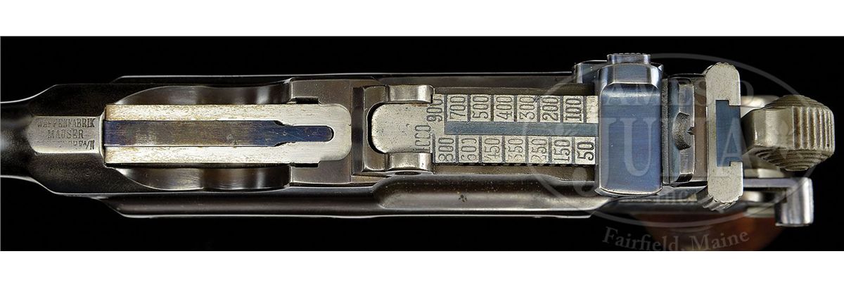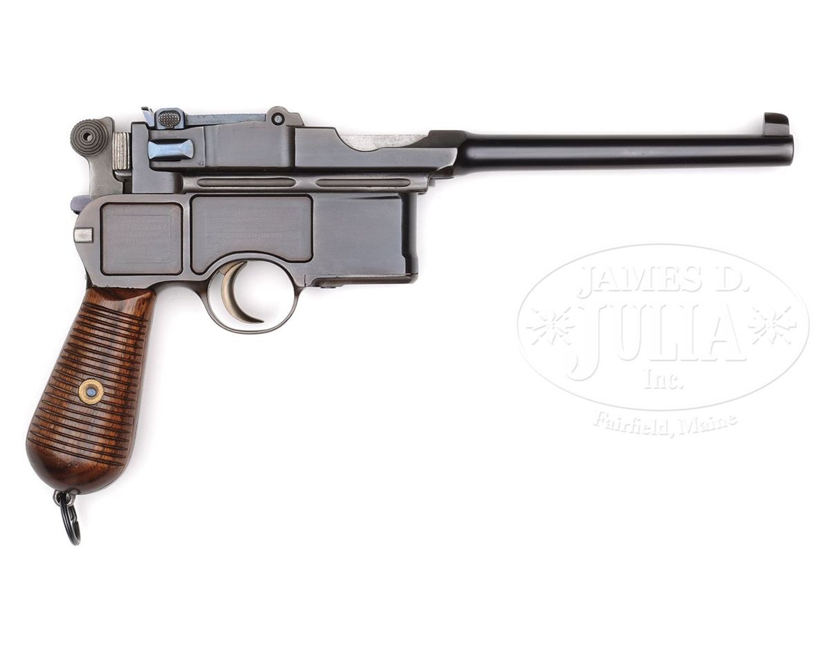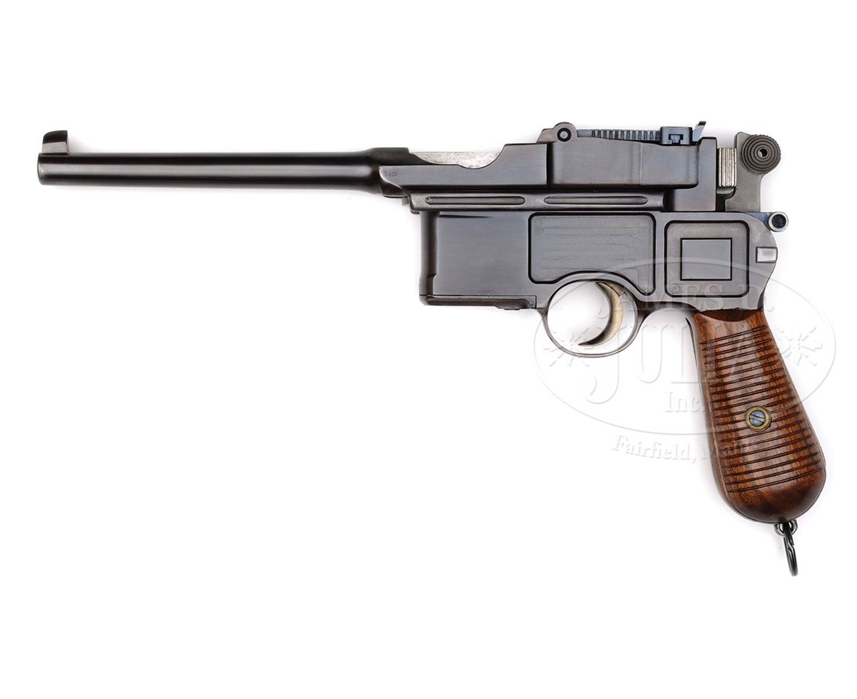 SN 7220. Caliber 7.63mm. Only a few six shot Conehammers had an adjustable sight. This one has a 5.5" bbl and slip-in 50-1000 rear sight. Standard chamber address with full serial number on left chamber flat. Small Crown U mark on left side of bbl extension. Antler proof on right side. Unusual in having a slip-in rear sight as most Conehammers in this serial range would have had a pinned 1-10 sight. The manner of serial numbering the bbl extension and this later rear sight suggest an out-of-sequence assembly or repair by Mauser. Full serial number marked under the sight bar, on the firing pin retainer, the frame above stock slot, and under the floorplate. All matching numbers on disassembly except for firing pin number 4429 and the unnumbered replaced grips that are unnumbered. PROVENANCE: Joseph J. Schroeder, Jr. Collection. CONDITION: 99% restored blue with minimal wear. Thinned markings with minor imperfections under the blue, consistent with a restored arm having been used hard in China. Small parts have been reheat treated to a fire blue with partial aging. Worn bore with barely discernible rifling. Nicely varnished replacement grips and replacement lanyard ring. 4-48552 LMA10
