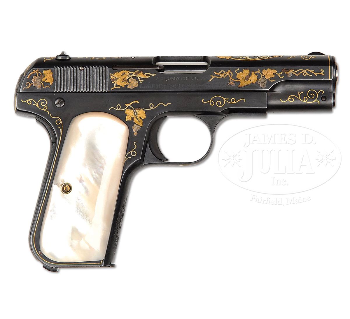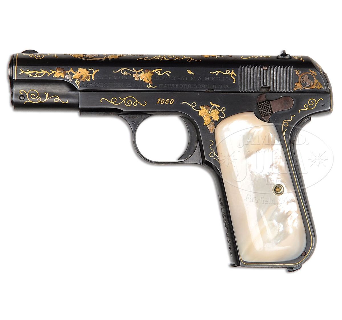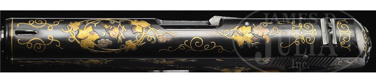 SN 1060. Cal. 380 ACP. Spectacular Gino Cargnell engraved pistol with 3-3/4" bbl, bbl bushing at the muzzle end of slide, fixed sights and custom, smooth 2-pc pearl grips. Pistol is wonderfully engraved by Gino Cargnell and signed on left front web of trigger guard. Frame and slide are very tastefully engraved with highly detailed raised gold inlays of grape leaves, vines and clusters of grapes along with flat gold wire inlays on both sides on the grip safety and over the slide. Leaf & grape cluster inlays are in 2-color gold. Top of slide is also inlaid with a spectacular 3-color gold tiny goldfinch. Left rear side of the slid has the Rampant Colt and circle inlaid in 2-color gold. Accompanied by a spare bbl that has British proofs and is probably the orig bbl to this pistol as left rear side of the frame also has a tiny British proof. Apparently the proof mark on the slide was covered by the gold inlay. Gino Cargnell was an engraver employed at Fabrique Nationale in Belgium when his friend and mentor Angelo Bee immigrated to the United Sates and set up his own business. Mr. Bee convinced Mr. Cargnell to also come to the U.S. and work with him, which he did, to great success. Mr. Cargnell is one of the premier engravers in recent years and has created numerous, fantastic works of art on firearms. CONDITION: Extremely fine. Overall retains virtually of its fine custom blue. Grips are extremely fine, mechanics are crisp, bright shiny bore in both bbls. 4-49181 JR248