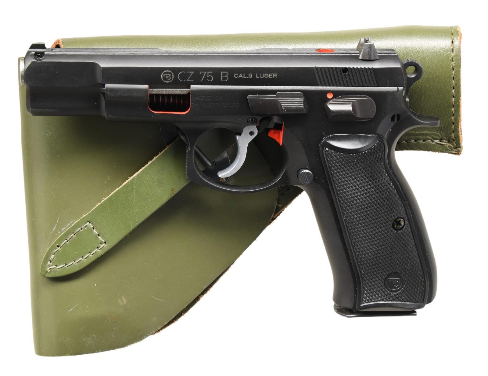 Cal. 9mm Luger. S# 9-2558. Bbl. 4 1/2". Three dot sights. Factory cutaway CZ75B pistol w/ Kansas City import marking. Left side of frame has two cuts the first to see recoil spring & the other to see rear of trigger. Left side of gun has five cuts one to see bbl., two for grip area & two at rear of frame. Trigger & safety mechanism still function as they would on normal CZ75B pistol. Black poly coat finish. CZ checkered black grips. MAGS: 1-10 round w/ segmented body. UNATTACHED ACCESSORIES: right hand green military holster & dummy cartridge. CONDITION: all aspects near excellent. PROVENANCE: From the Working Reference Collection of Military Arms Instructor, Master Sergeant Vincent Pestilli. (23-7522/MJC). MODERN. $500-900.