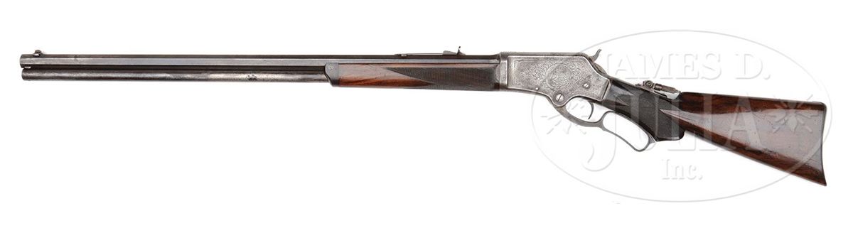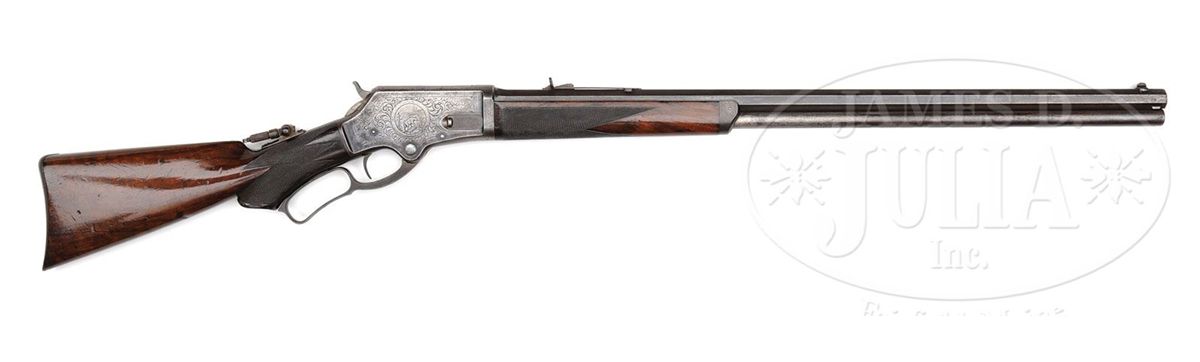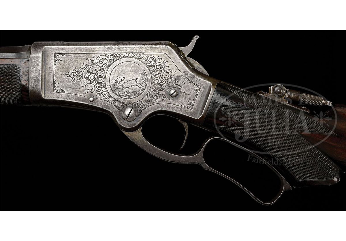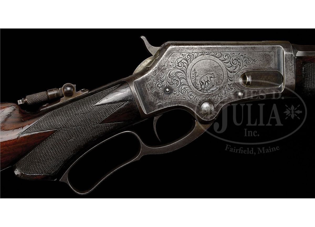 SN 13804. Cal. 40 (40-60). Fine deluxe '81 Marlin with 28" oct bbl, full magazine, Jack front sight with missing bead, Marlin semi-buckhorn rear sight and Lyman combination tang sight. Mounted with very nicely figured European walnut with early style checkered forearm and serpentine grip buttstock that has smooth steel Marlin buttplate. Left side of upper and lower tangs are marked with matching SN which is also found on front face of buttstock and inside buttplate. Receiver is engraved in #2-style probably by Conrad Ulrich with a vignette of a running bull elk on the left side and a standing grizzly bear on a promontory in a mountain scene on right side. Both vignettes are surrounded by foliate arabesque patterns. Top of receiver, dust cover, and bottom of receiver are engraved to match. This rifle is consecutively numbered to another, non engraved Marlin Model 1881 deluxe rifle being sold elsewhere in this auction. CONDITION: Very good, all matching. Bbl retains a thin blue/brown patina with a cleaned area over the bbl address and some scattered pitting forward of the bbl address. Magazine tube retains about 60% blue/brown patina with one spot of pitting adjacent to that on the bbl. Receiver is a mottled silver/brown patina with scattered fine pitting. Lever hammer & buttplate are a dark patina with a couple spots of heavy pitting and moderate to heavy pitting on buttplate. Stock has a hairline back of top tang, otherwise wood is sound with nicks & scratches and retains about all of an old restored finish. Mechanics are fine, strong bore with good shine, frosty in the grooves. 4-49340 JR251