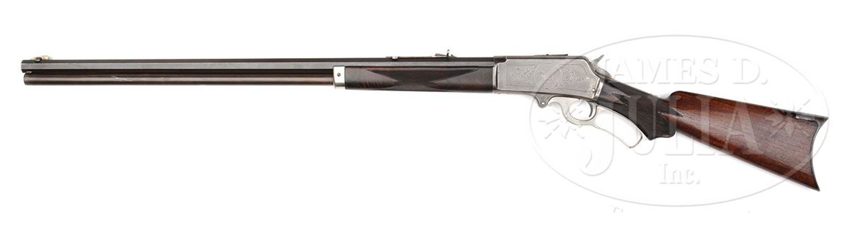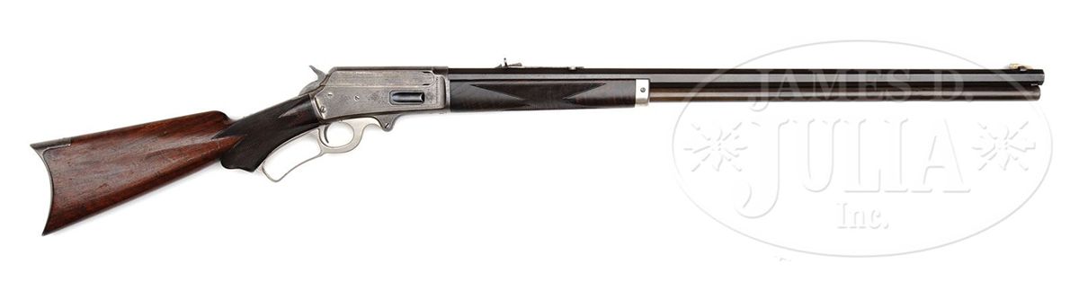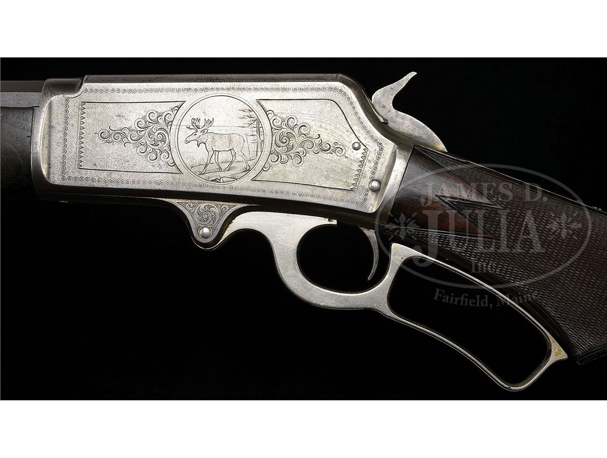 SN 141137. Cal. 38-56. Unusual big bore Marlin with 28" oct bbl, full magazine, German silver Rocky Mountain front sight and Marlin semi-buckhorn rear sight. Mounted with streaky straight grain American walnut that has B-style checkered forearm and serpentine grip buttstock with crescent buttplate. Left side of upper tang is marked with the matching SN, which is also found in the top tang channel of buttstock and inside toe of buttplate. Receiver is engraved in #1-style by one of the Ulrichs, with the vignette of a walking bull moose on the left side, surrounded by light foliate arabesque patterns with matching patterns on right side and light border patterns. Rifle is extremely unusual in that it is 1/2 nickel finish with nickel platted receiver lever, forend cap and buttplate. This configuration is occasionally seen on rifles used by trick shot artists and wild west performers, but is impractical as hunting rifle. The Model 1895 is one of the more scarce Marlins with only about 18,000 produced in the period 1895-1917 in 7 different calibers, both standard and deluxe rifles and carbines. Engraved rifles in this model are quite rare. CONDITION: About fine. Bbl retains 93-95% plummy blue/brown patina with sharp edge wear, a few spots of light surface discoloration and some light nicks on the top edges. Magazine tube has a 1/4" dent about mid-point with several smaller repaired dents further toward the muzzle and overall retains a thin plummy brown patina. Receiver retains traces of orig nickel, being mostly a gray metal patina. Hammer retains smoky case colors. Lever retains just about all of its nickel finish. Buttplate retains a mottled cleaned metal patina. Wood is sound with usual nicks, dents and scratches with the buttstock retaining most of an old restored finish and the forearm a dark hand worn patina. Forearm checkering has been freshened. Mechanics are fine, strong sharp bore, dark in grooves. 4-49335 JR252