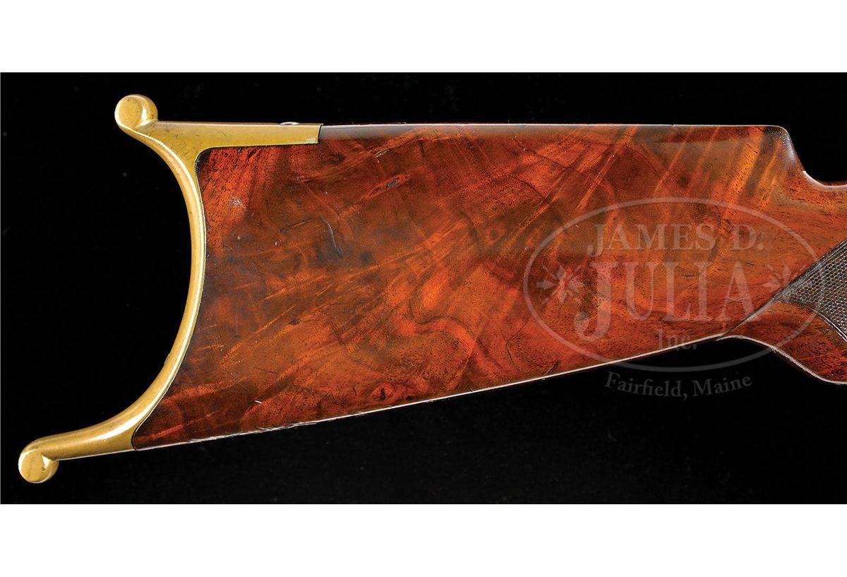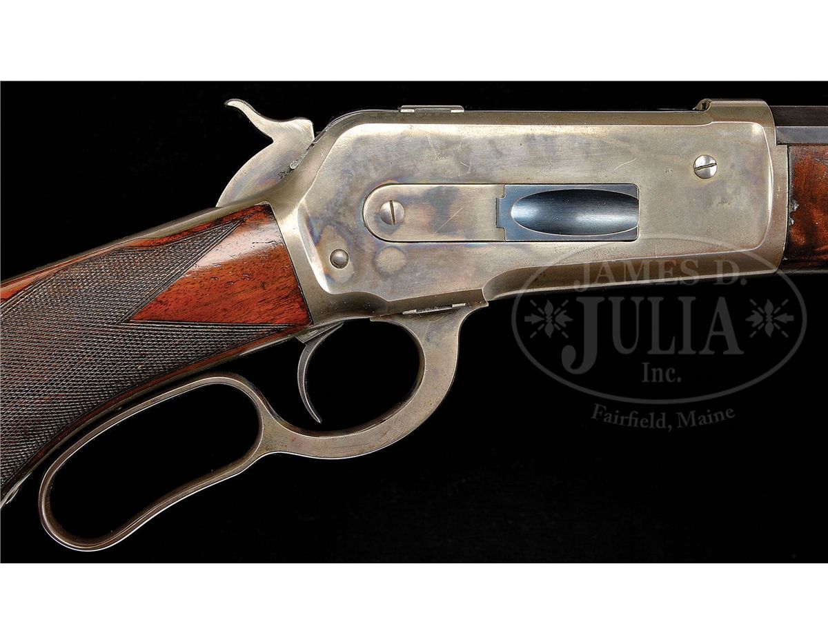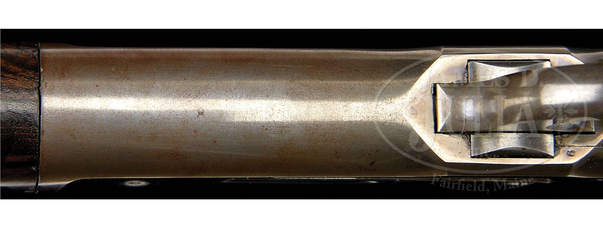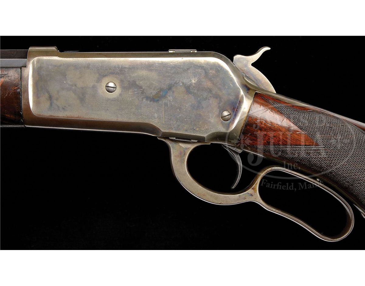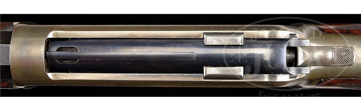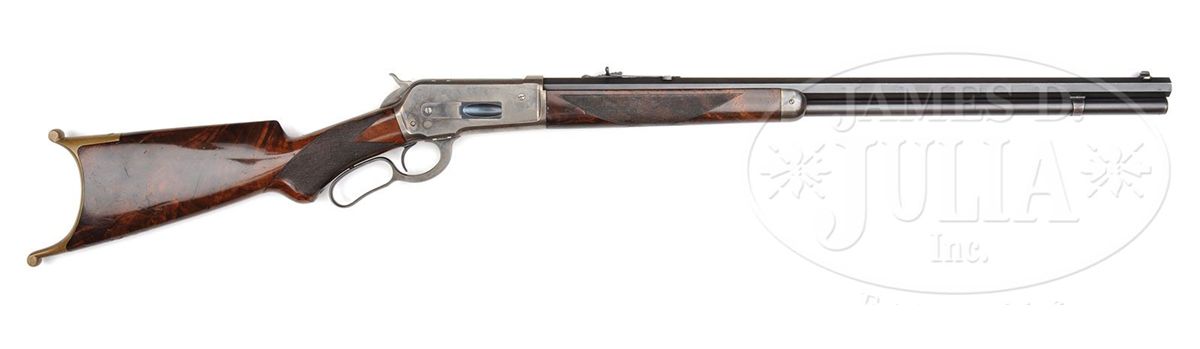 SN 77640. Cal. 38-56. Special order deluxe '86 with 26" oct bbl, full magazine, Lyman ivory bead front sight & semi-buckhorn rear sight. Mounted with very highly figured, 2-3X American walnut with H-style checkered forearm & black insert, serpentine grip buttstock that has a brass Swiss buttplate. Left side of the lower tang is marked "XX" & the assembly #731. Matching assembly number is also found in top tang channel of buttstock & inside center of buttplate. Buttplate is without trap although stock is milled for a trap. PROVENANCE: Woody Frey Collection. CONDITION: Very fine. Bbl & magazine tube retain 97-98% strong orig blue, turning slightly plum on magazine tube. Receiver retains bright case colors in the most sheltered areas and overall 60-70% faded case colors with the top and bottom edges turned silver. Hammer retains strong case colors on the sides, mostly turned silver. Lever retains case colors in the most sheltered areas, mostly turned silver. Buttplate retains silver on the inside with the outside a dark brass patina. Wood is sound with usual light nicks & scratches in the finish & a series of small gauges around the toe & overall retains most of it's bright, orig piano varnish finish, slightly dulled on forearm. Checkering shows moderate wear. Mechanics are crisp. Bright, shiny bore. 4-48428 JR176