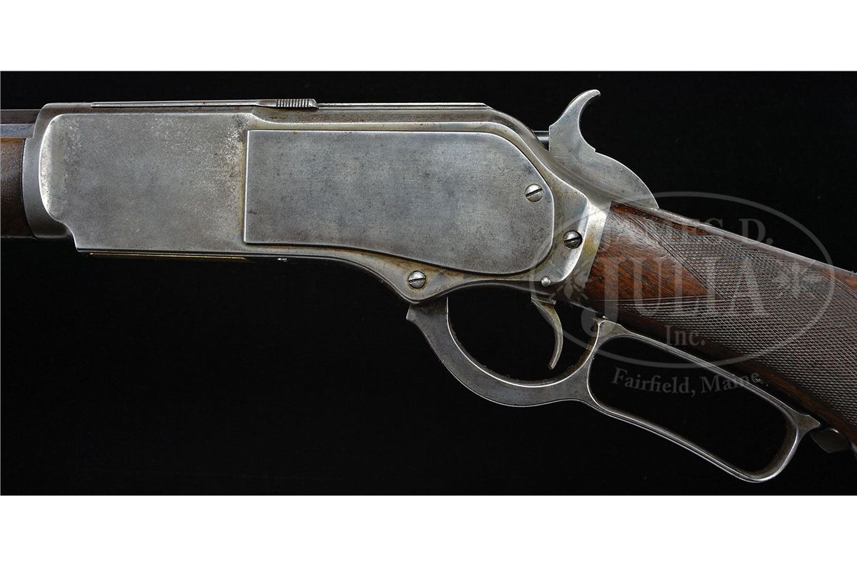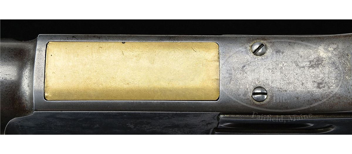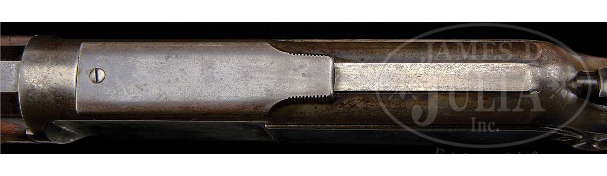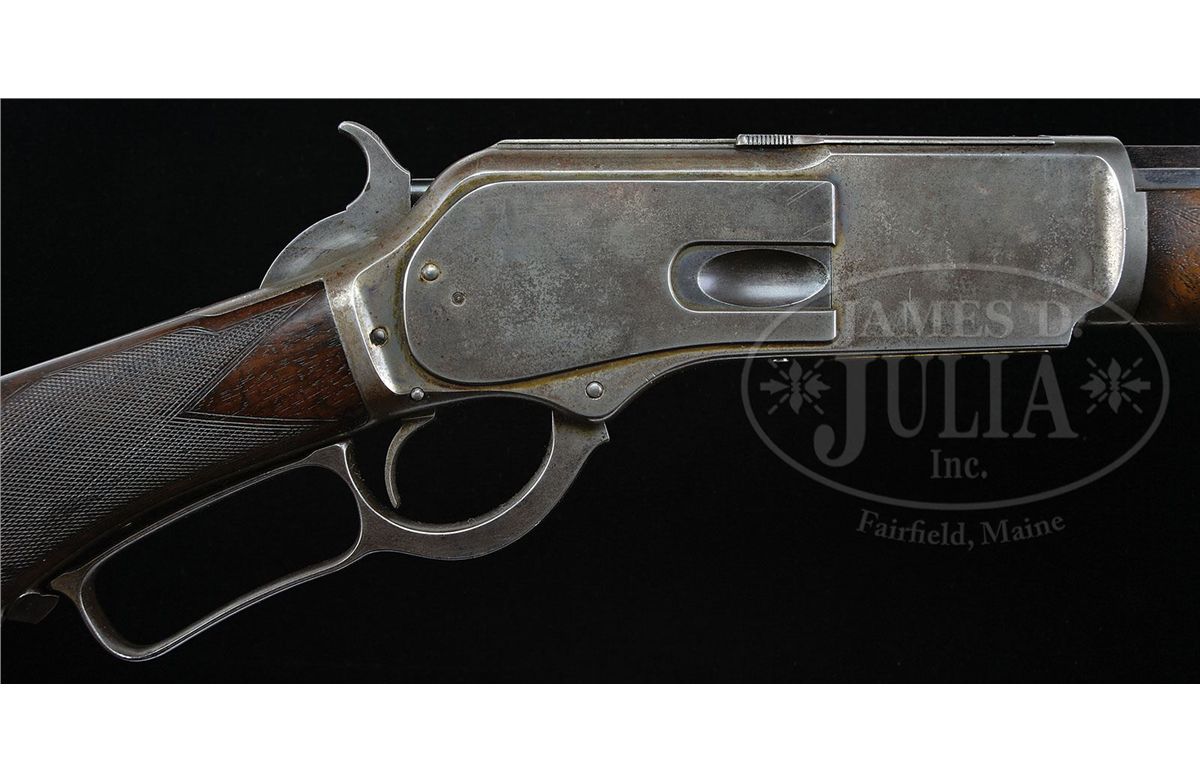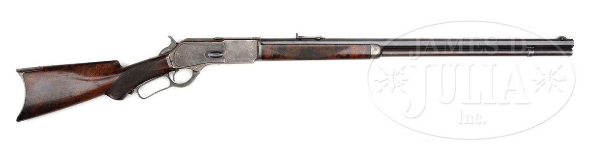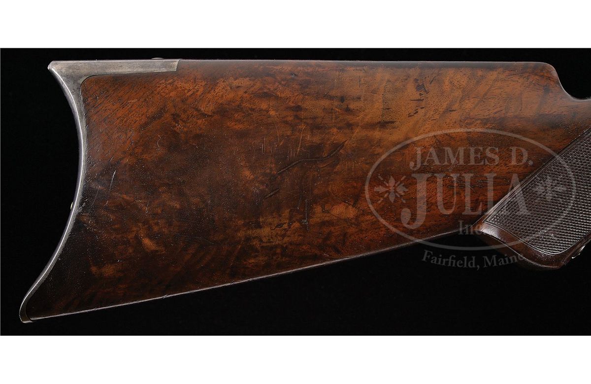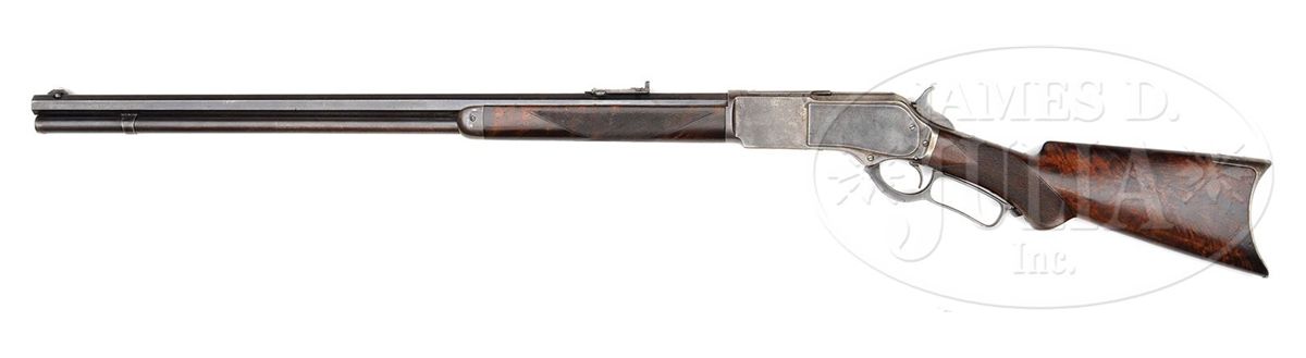 SN 37802. Cal. 45-75. Fine deluxe rifle with 28" oct bbl, full magazine, Freund silver top front sight and "1876" marked ladder Freund "More Light" rear sight with sliding aperture that has checkered edges and a sleeved standing aperture with small peep hole and a very fine notch. Receiver is third type with machined dust cover rail and plain dust cover. Mounted with very highly figured, about 3X, flame grain American walnut with H-style checkered forearm and black insert, serpentine grip buttstock that has crescent buttplate with trap containing a 5-pc brass & steel cleaning rod. Left side of lower tang is marked "XXX" and with the assembly number "1733" which number is also found in top tang channel of buttstock and inside toe of buttplate. Accompanied by a Cody Firearms Museum letter which identifies this rifle with oct bbl, plain trigger, case hardened & checkered stock with pistol grip, received in warehouse Oct. 4, 1883 and shipped next day with one other Model 1876 to Order #7474. Also accompanied by a copy of the Winchester shipping records for this rifle which also identifies SN 37803 as the rifle on the same order shipped the same day. Standard bbl length for the Model 1876 rifles was 28". CONDITION: Fine to very fine, all matching. Bbl & magazine tube retain strong orig blue in sheltered areas, thinning over top flats of bbl and turning a little plum on magazine tube; forend cap is a silver/gray patina; receiver, lever & hammer retain smoky case colors, mostly faded to silver; buttplate is a gray patina. Wood is sound with usual nicks & scratches, showing moderate to heavy diamond point wear and retains 75-80% orig varnish on buttstock; forearm is dark & worn on bottom with a hand worn patina towards the front. Mechanics are crisp, bright shiny bore. Very likely this was a western rifle with its Wyoming Armory Freund sights. It could have been used in the buffalo trade shooting the Northern herd. 4-47877 JR130