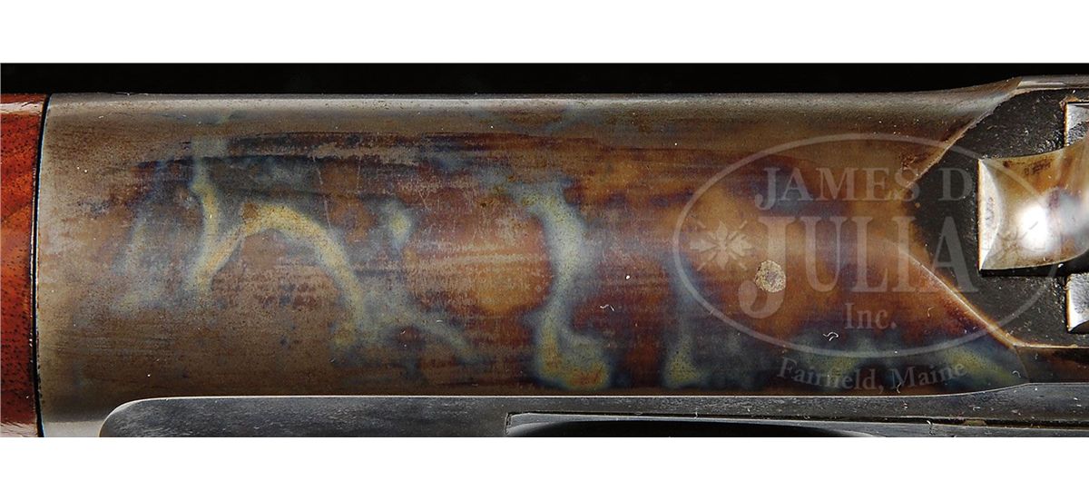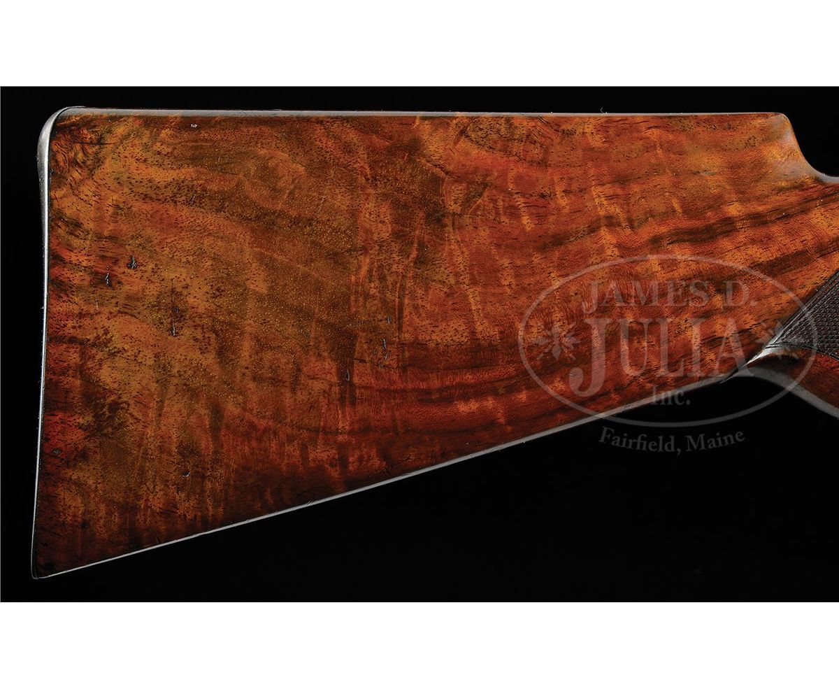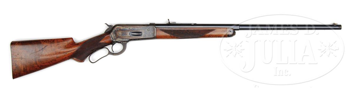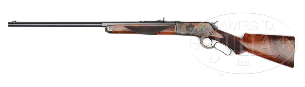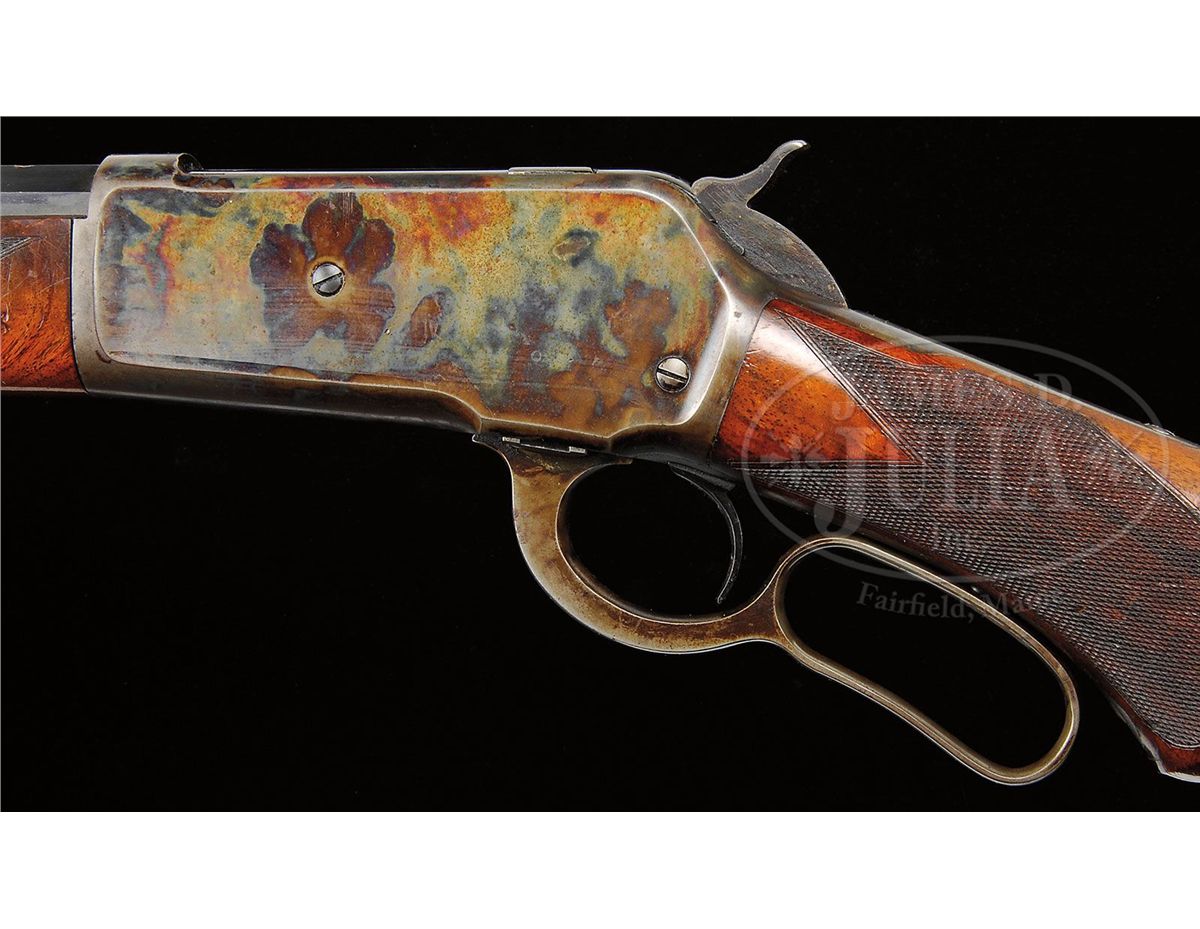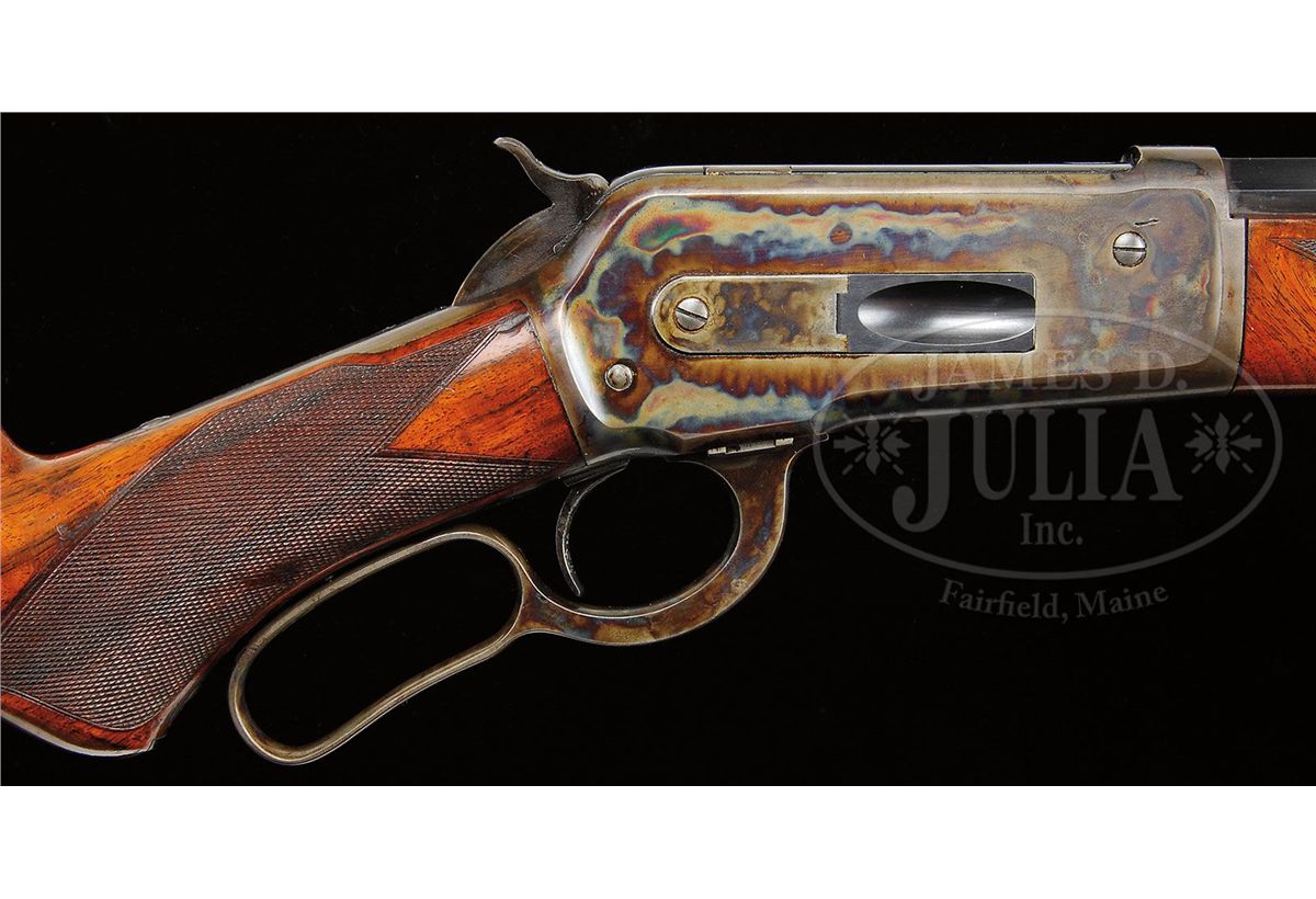SN 56199. Cal. 45-90. Fine Deluxe '86 with 26" oct to rnd bbl, button magazine with gold washed combination front sight and a platinum line 3-leaf express sight. Top flat has the usual 2-line address with caliber marking over chamber area. Top left flat by chamber area has the hand-stamped initials "GAM". Mounted with very highly figured burl & flame grain American walnut with "H" style checkered forearm and serpentine pistol grip stock with black triangle inlay & smooth steel shotgun buttplate. Left side of lower tang is stamped with assembly number "56", "S" and "XX". Matching assembly number is found in top tang channel of buttstock and inside buttplate which also is stamped "S". Buttstock, under buttplate, is stamped with intials "GAM". Accompanied by a Cody Firearms Museum letter which identifies this rifle in caliber 45-90 with half oct bbl, plain trigger, checkered stock with pistol grip, Winchester express sight, half magazine & shotgun butt, received in warehouse May 16, 1891 and shipped May 22, 1891 to Order #4375. PROVENANCE: Wes Adams Estate Collection. CONDITION: Extremely fine, all matching. Bbl retains 96-98% strong orig factory blue with a few minor chemical spots toward the muzzle & some fine sharp edge wear with a few scattered pin pricks of pitting; right side of bbl by the rear seat has a nick on sharp edge with corresponding nick on forearm; receiver, lever & hammer retain about all of their factory case colors, brilliant on receiver & hammer, turned a little dark on top edge; lever has lightly faded case colors on outer face; receiver has a short deep scratch by front guide screw on right side and the lever has some light rust on inside face; forend cap retains most of its brilliant factory case colors; buttplate retains about 70% thin blue; wood is sound with a few light nicks, scratches & dings and overall retains about all of its strong piano varnish finish. Mechanics are crisp, brilliant shiny bore. 4-44496