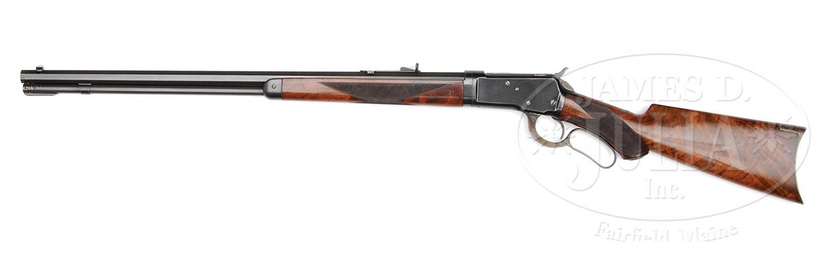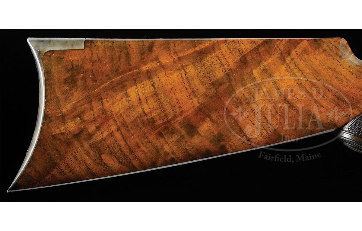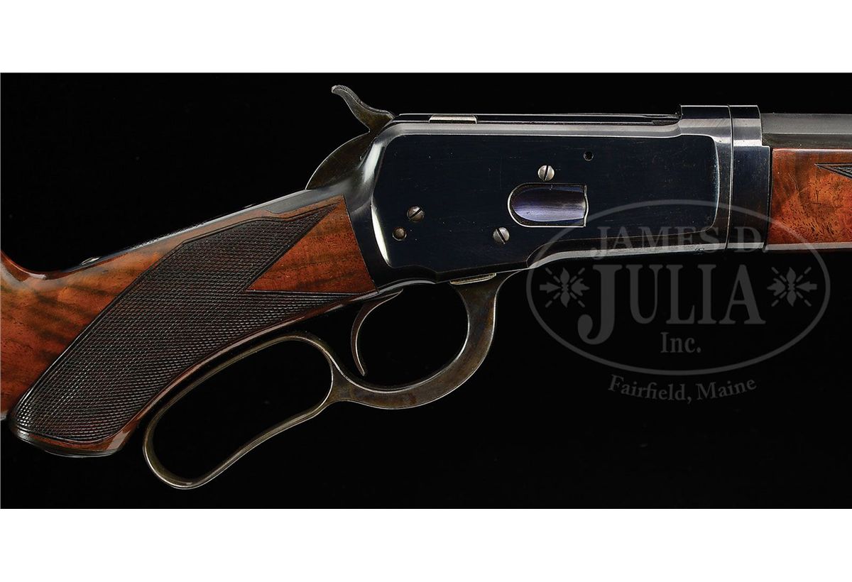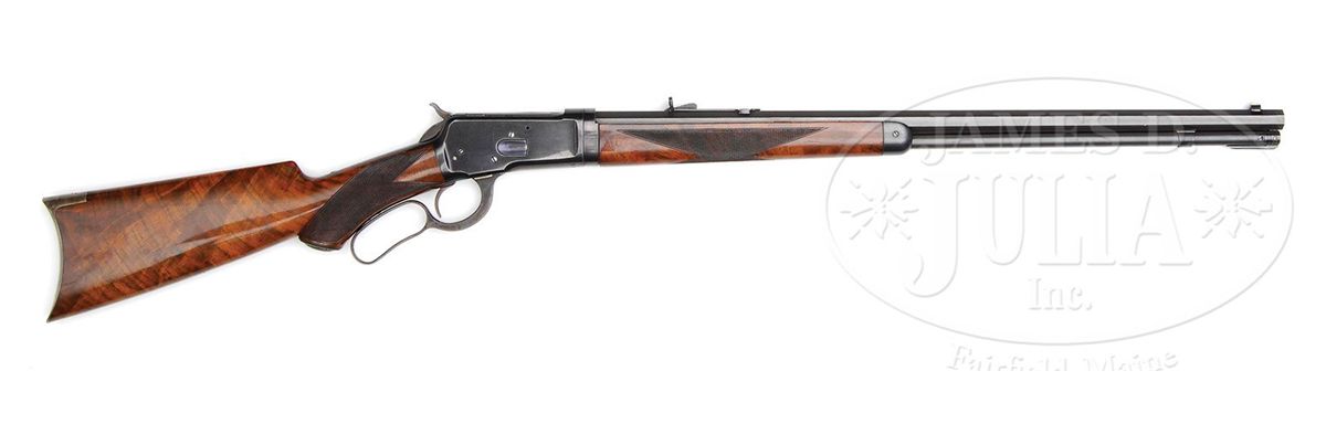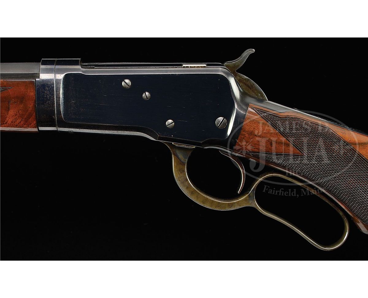SN 96883. Cal. 25-20. Beautiful deluxe '92 with 24-1/4" oct bbl, full magazine, half nickel front sight and semi-buckhorn rear sight. Mounted with about 3X, center crotch, shell grain American walnut with H-style checkered forearm and capped pistol grip stock with crescent buttplate. Left side of lower tang is marked with assembly number "5801" and "XXX". Rear face of buttstock, under the buttplate, has the matching assembly number and "92". Matching assembly number is also found inside toe of the buttplate. Accompanied by a Cody Firearms Museum letter which identifies this rifle, as found, received in warehouse Oct. 4, 1898 and shipped next day to Order #8259. PROVENANCE: Wes Adams Estate Collection. CONDITION: Extremely fine. Bbl retains 97-98% strong orig factory blue with only a couple of minor nicks & faint sharp edge wear; magazine tube retains about 95-96% orig blue, turning a little plum, with scratches from being taken down; takedown ring & forend cap retain about all of their orig blue with some fine flaking on the takedown ring; receiver retains 95-97% strong, bright orig blue with sharp edge wear and a few small spots of fine flaking; lever & hammer retain strong case colors, faded on outer faces of lever; buttplate retains faded case colors. Wood is sound with a few very minor nicks & scratches and overall retains virtually all of its bright piano varnish finish. Mechanics are crisp, brilliant shiny bore, shows very little evidence of having been used. 4-44599 JR48
