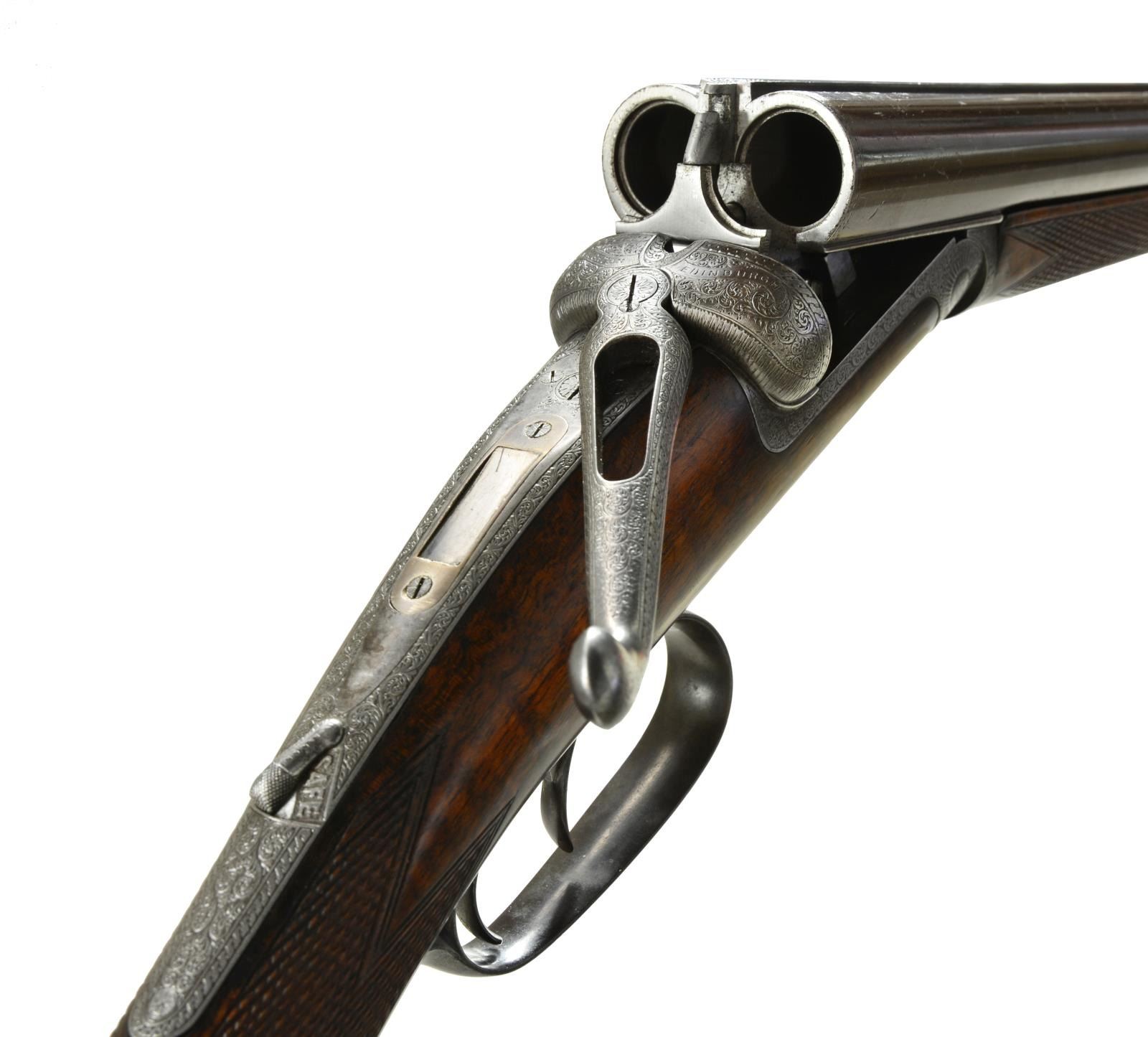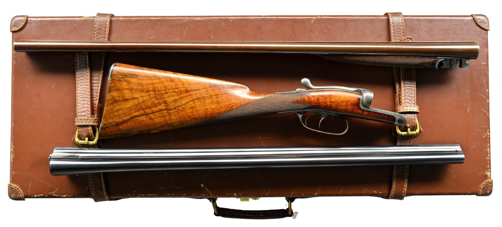 SKELETON ACTION GAME GUN W/ LATER 20 GA. BBLS. Cal. 16 Ga., 2 5/8" / 20 Ga. S# 835 (early range pre 1894). 30" Damascus bbls. have narrow game rib engraved w/ MacNaughton name & Hanover St. Edinburgh address. Bbl. flats stamped w/ London black powder proofs for 17 bore & "NOT FOR BALL". Bottoms of bbls. stamped "MACNAUGHTON" & w/ S#. Rnd. body trigger plate lever cocking MacNaughton action has most of the action bar cut away & stock extends into this area in usual "skeleton" style as was done by MacNaughton on a limited number of early guns. The action is patent use #33 & features long top lever w/ central opening to view tumblers under a glass window to determine whether the gun was cocked or not. Action also features pivoting 3rd fastener, usual MacNaughton toggling safety, double triggers & long extended trigger guard for use w/ gloved hand in cold weather. Action engraved w/ full coverage well cut shaded scroll, w/ line & knot work borders. Tops of fences are engraved "MACNAUGHTON EDINBURGH". Trigger plate engraved to match & S# is on tang. Nicely streaked & figured European walnut straight grip buttstock measures 14" over checkered wood butt w/ engraved steel heel & toe plates. A vacant gold oval is on toe line. Grip checkering is point pattern w/ mullered borders. Matching splinter forend w/ inlet horn tip has Deeley release. UNATTACHED ACCESSORIES: relatively new set of 26 5/8" 20 Ga. bbls. by E. A. Lander. These bbls. have 3" chambers & top rib is engraved w/ MacNaughton address. MEASUREMENTS: ORIGINAL BARRELS: Bore diameter: R 661 L 679. Restriction: R .010 (IC) L .018 (MOD). Min. Wall Thickness: R .030 L .017 in a 6 to 7" area on outer edge between 5 & 11" from muzzle on left side & bottom, remainder mostly over .020. 20 GA. BARRELS: Bore Diameter: R 615 L 615. Restriction: R .040 L .045. STOCK DIMENSIONS: LOP: 14 3/8". DAC: 1 9/16". DAH: 2". Cast: 1/4" off. WEIGHT: 6 lbs. 16 oz. Also included is a brown leather case w/ leather corners lined in burgundy felt for gun w/ extra bbls containing 3 piece rosewood & brass cleaning rod, crystal oil bottle, a BGI powder measure capper, broken case extractor, wad punch & a small brass container along w/ a pull through field cleaning kit in brown leather wallet. CONDITION: good as mostly refinished. Bbls. retaining over 90% chocolate rebrown w/ fair definition to pattern over numerous light marks & a few pits. Makers name & address almost unreadable. Action is nearly all a pleasing pewter silver to gray, engraving remains clear. Stocks have been refinished in oil & retain nearly all of that finish over some staining & a few marks, & this finish has subsequent marks. Checkering recut & is a bit coarse & haphazard. Bores are shiny but have scattered pitting mostly toward breech ends. Left bbl. w/ some riveling at thin portion. Action is loose, bbls. are off face (this should be put right before any firing). 20 Ga. bbls. retain nearly all of their blue, fit action well & are tight & on face. Gun handles quite well when these bbls. are installed. Case is good, leather scuffed, access. good. A classic Scottish gun, examples are quite hard to find. Usable "as is" w/ 20 Ga. bbls. Original bbls. in need of some work which is well worth doing. (01-18169/MGM1). ANTIQUE. $6,000-10,000.