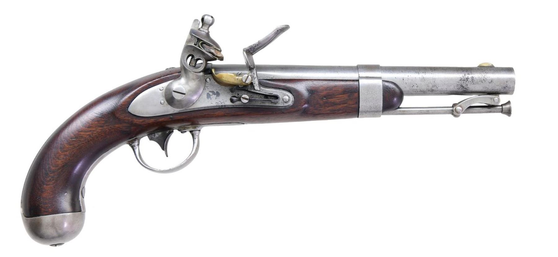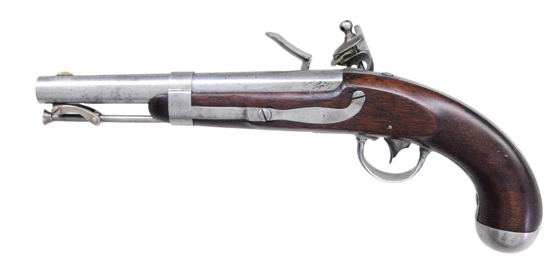 FLINTLOCK PISTOL. According to Sam Smith and Ed Bitter in their 1985 text "HISTORIC PISTOLS, AMERICAN MARTIAL FLINTLOCK 1760-1845" only about 20 of this variant model 1836 have surfaced, all made with surplus government inspected barrels. The 8" barrel on this gun has the typical breech proofs: "U.S. / JH / P". Like the other surviving examples, there is no final government inspection in the stock only sub inspector initials on most parts. The lock is marked only with a unique American eagle with shield in its breast forward of cock. These pistols were studied and are similar but not identical to the Johnson and Waters contracts that are so well known. This group of survivors are thought to have been made by an unknown contractor for a private horse troop, unknown militia, or possibly even for private sales. Regardless, this is a very scarce variation which is rarely offered. UNATTACHED ACCESSORIES: copy of pages from "HISTORIC PISTOLS, AMERICAN MARTIAL FLINTLOCK 1760-1845" which detail this scarce variant. CONDITION: very good overall, appears original throughout, metal is cleaned, gray/bright overall with areas of pitting, markings all discernible, well fit stock, mechanically fine, clear smooth bore. Pistol is accompanied by vintage "J" shape gun tool, vent pick & brush combination, and a paper cartridge. PROVENANCE: The Collection of Edward Scott Meadows. (01-24713/JS). ANTIQUE. $1,000-1,500.