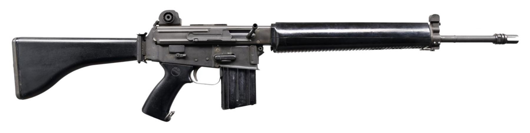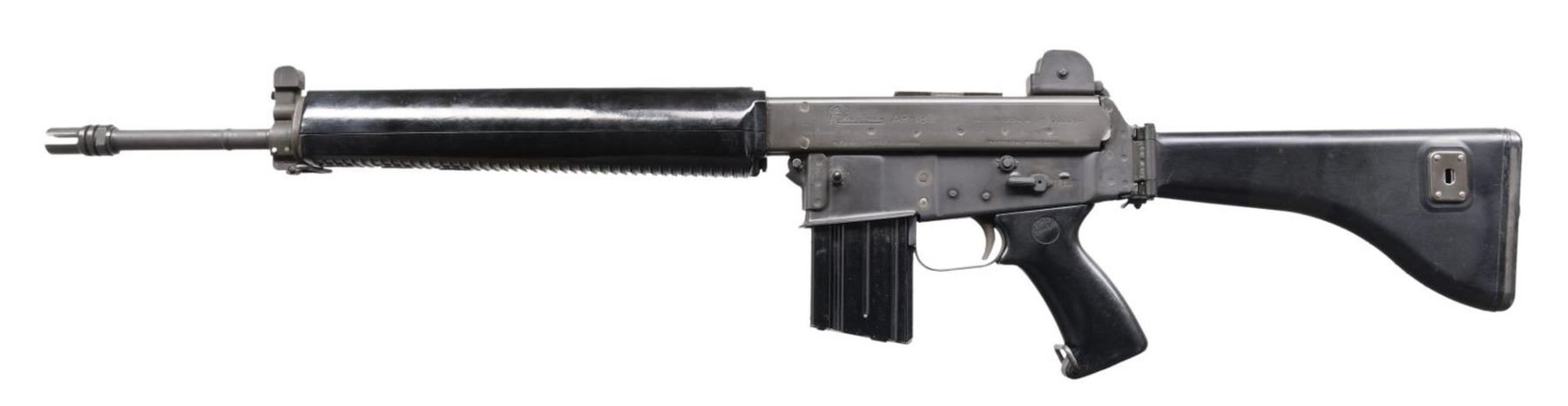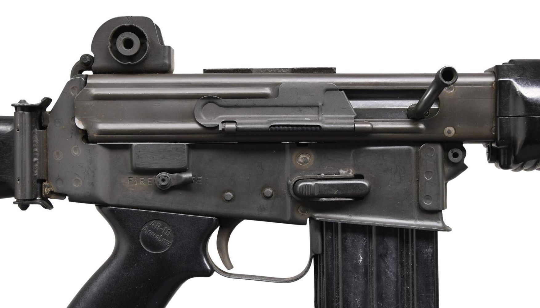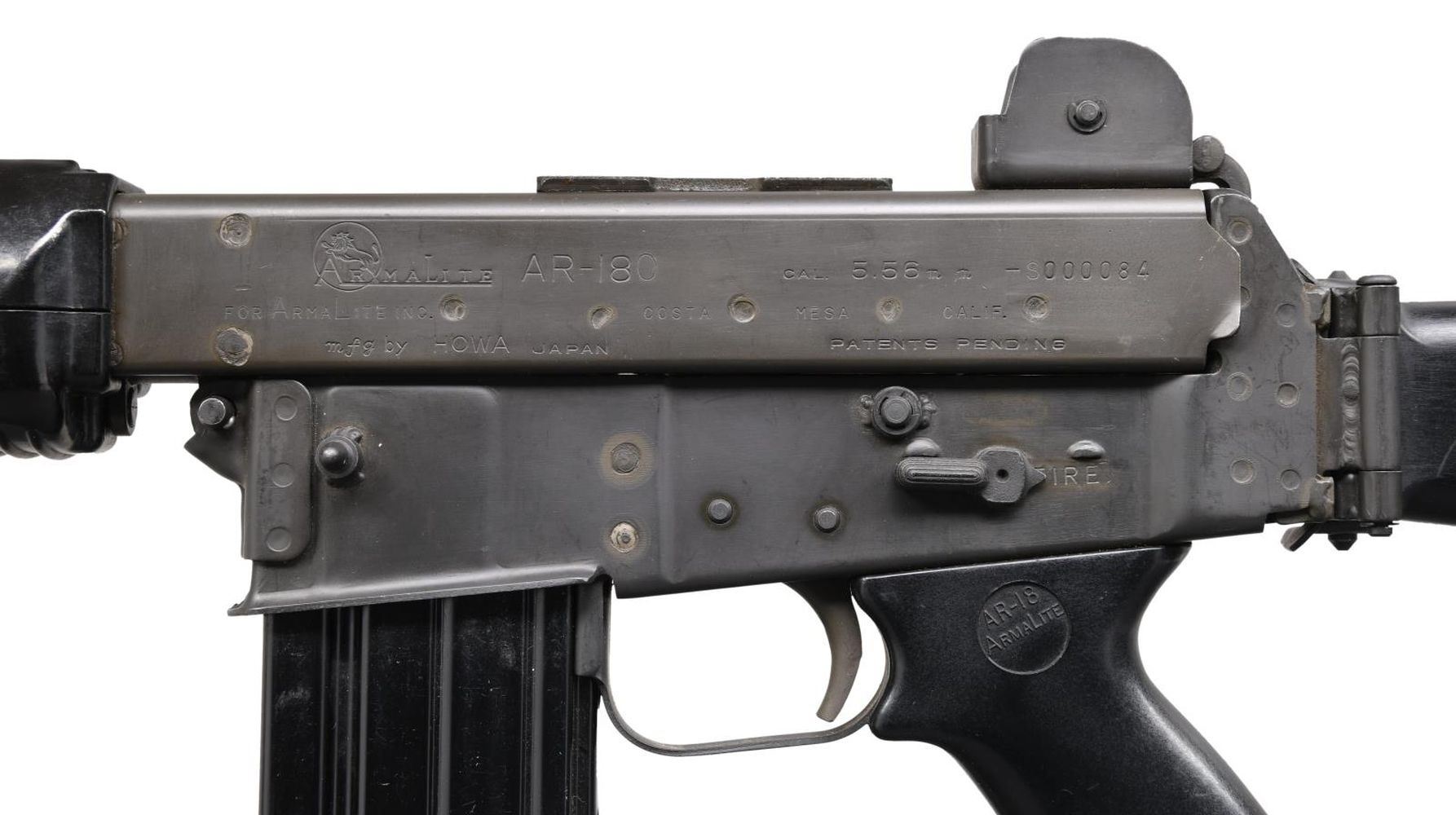Cal. 5.56mm. S# S000084. Bbl. 18" w/ flash hider. Post front sight w/ protective ears. Adjustable aperture rear sight. Early AR180 made by Howa in Japan under Armalite license. This gun has the 180 degree safety, matching numbered flash hider & serial number on upper left side. It is debated when these Howa made AR180s were made, some sources say between 1970 & 1974. Other sources state they were made between 1966 & 1967 before Japan forbade ex portion of arms to nations in active conflict like the US in Vietnam. Parkerized finish. Black synthetic furniture w/ folding butt stock. Bottom mounted sling swivels. MAGS: 1-20 rd. black enamel finish & marked "AR-18 ARMALITE INC". CONDITION: furniture shows scattered light scuffing & handling marks. Metal retains 93% original parkerized finish w/ scattered light silvering & edge wear. Very good plus bright bore. PROVENANCE: Lifelong Collection of Terrance McCarty. (24-103/MJC). CURIO. $1,500-2,000.