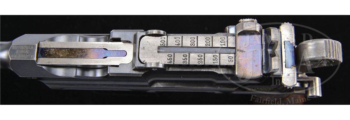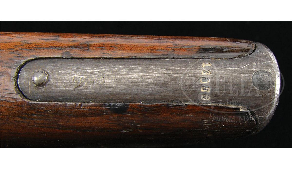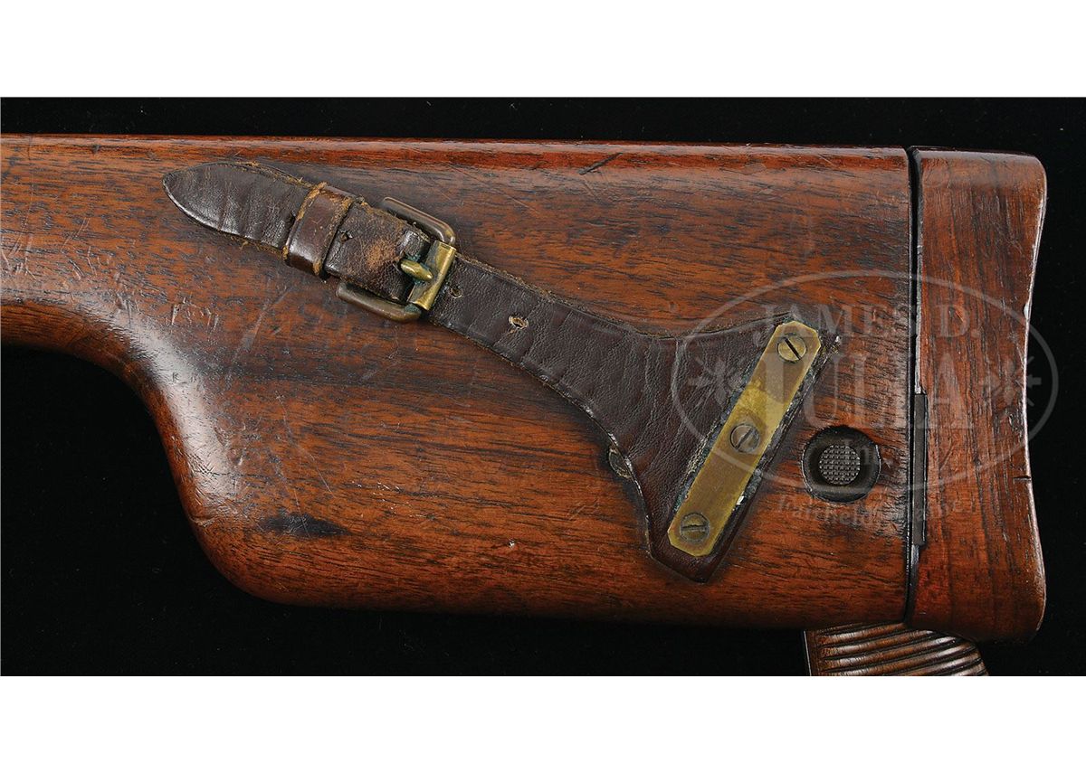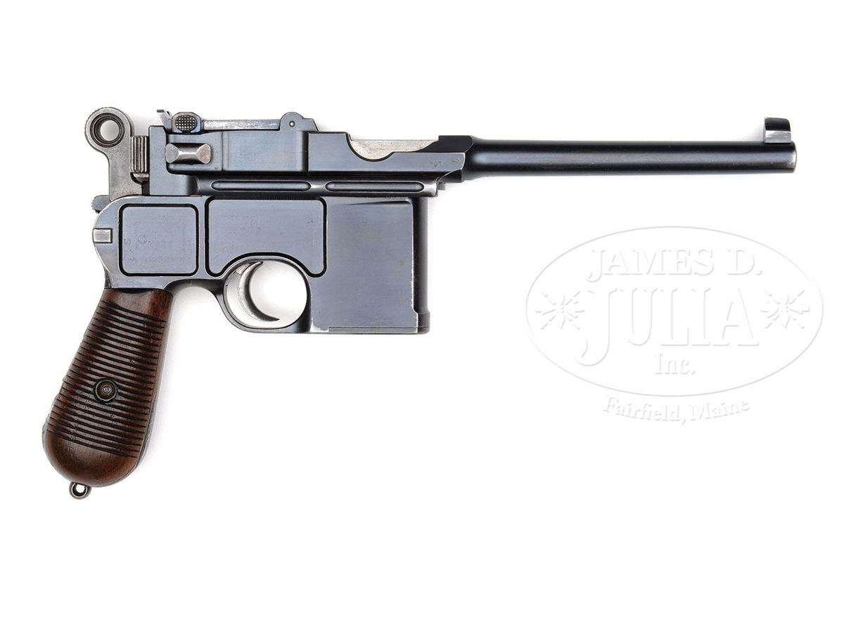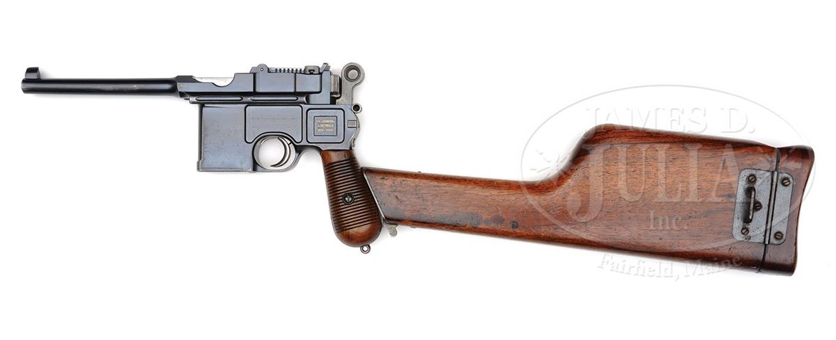 SN 13036. Caliber 7.63mm. Early Large Ring Transitional having many Conehammer features with 5.5" bbl and pinned 50-500 rear sight. Standard chamber address with Crown U marking on left side of bbl extension. Antler proof on right side adjacent to bogus Waffenamt stamp. Left side of frame marked "Von Lengerke & Detmold New York". Long extractor and independently secured firing pin. The extractor, cursor, bolt stop, firing pin retainer and grip screw are fire blued. Disassembly shows all matching serial numbers including the grips and shoulder stock that has an added leather loop attached to the right face. PROVENANCE: Joseph J. Schroeder, Jr. Collection. CONDITION: Original 90-95% bright blue with light wear on the sides of the bbl and magazine well where in contact with the stock. Slight fading under the trigger guard and on the front and backstrap from handling. Comparable condition fire blue on the small parts. Each of the grip panels is missing a small sliver near the frontstrap measuring roughly 1" x 3/16". No lanyard ring. Stock with original varnish and scattered handling dings. A leather loop has been attached to the right side of the stock with four screws. The lug is untouched though most of the fire blue from the upper arm has faded to a gray. Excellent original hinge. The lid had a longitudinal hairline crack neatly repaired, largely corresponding to a hammer related fracture. Bright bore with strong rifling and only minor oxidation. Perfect mechanics. Overall, an excellent Early Large Ring Transitional with a matching stock that would enhance any collection. 4-48559 LMA11