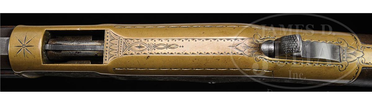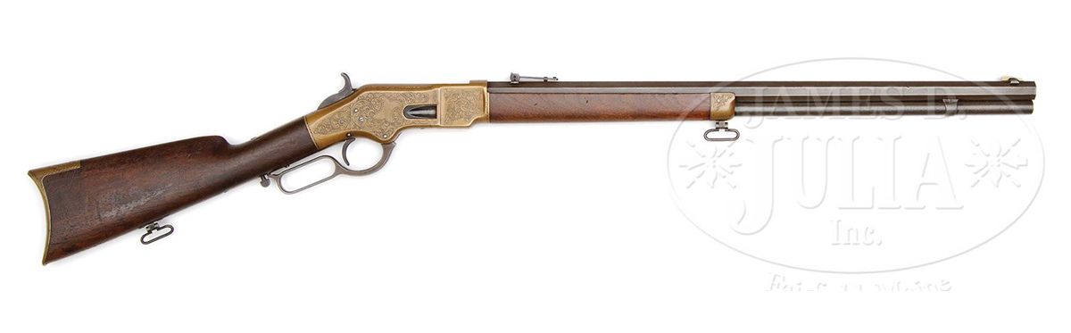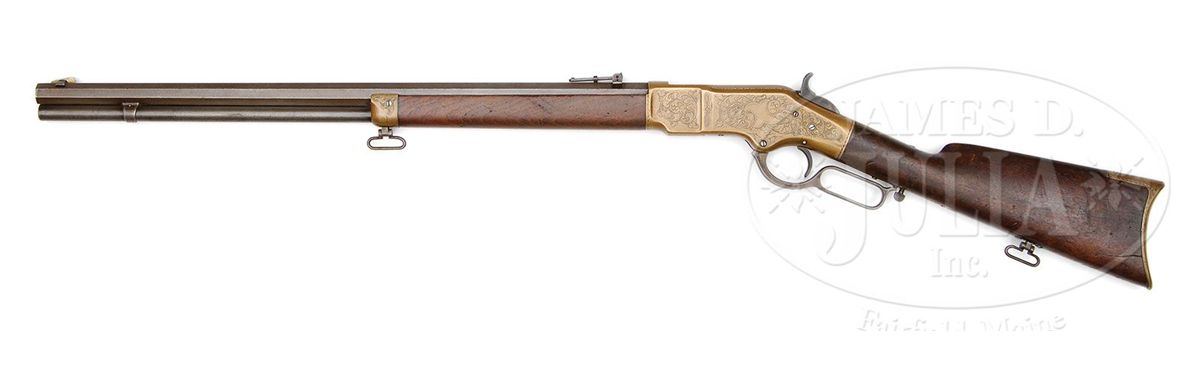 SN 37512. Cal. 44 RF Henry. Usual configuration with 24-1/4" oct bbl. Early style full mag, German silver Rocky Mountain front sight and 900-yd Henry ladder rear sight. Mounted with uncheckered, straight grain American walnut with straight stock and crescent buttplate with trap containing an original 4-pc brass & iron cleaning rod. Forend cap and bottom of stock have factory sling swivels. SN is found on the bottom tang with matching number. in the top tang channel of the buttstock and the last 4 digits of matching SN inside toe of buttplate. Receiver is beautifully engraved, by master engraver L.D. Nimschke in his distinctive style of flowing foliate arabesque patterns on both sides with an open counter-point panel on each sideplate. Left sideplate additionally has Mr. Nimschke's chimera animal head and another scroll terminates in his demon bird head. Right sideplate also has this demon bird head. Engraving extends over the top of the receiver, top and bottom tangs with foliate and border patterns around the hammer slot. He also incorporated a matching dash & dot border around the top seam of the sideplate/receiver. Top front of receiver is engraved with a fine hunter's star. Bottom of receiver is engraved with a large sunflower between the timing screws and also has Mr. Nimschke's trademark flower blossom on the bottom of the carrier, which also has a dash & dot border. The dash & dot borders are also found around the front & rear edges of the receiver and around both tangs. Forend cap and buttplate tang are engraved to match. Pg. 121 of the 1985 edition of The Winchester Book, Madis, pictures another Model '66 rifle, SN 21123, with the exact same engraving patterns found on this rifle. PROVENANCE: Barnes Family Collection. CONDITION: Very good. No original finish remains on the steel parts. They appear to have been cleaned to bare metal a long time ago and now have a thin silver-brown patina with darker patina on the lever and hammer. Receiver, forend cap and buttplate retain a dark mustard patina with the receiver showing moderately worn edges and slightly softened engraving patterns. Stock has a repaired crack through the toe screw hole, otherwise wood is sound with usual handling and use, nicks, scratches and dings with the buttstock retaining traces of original finish and the forearm a cleaned hand-worn patina. Lever tension springs may be dislocated or broken otherwise mechanics are fine; strong bore with moderate pitting. 4-47656 JR235