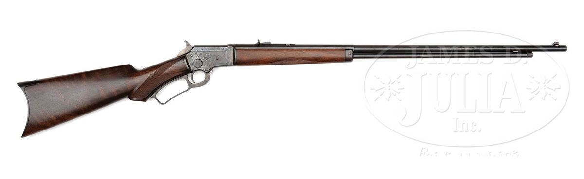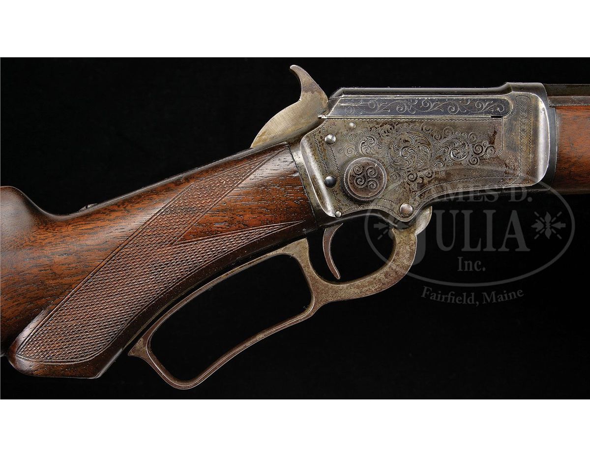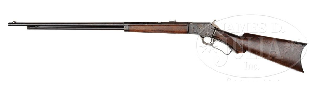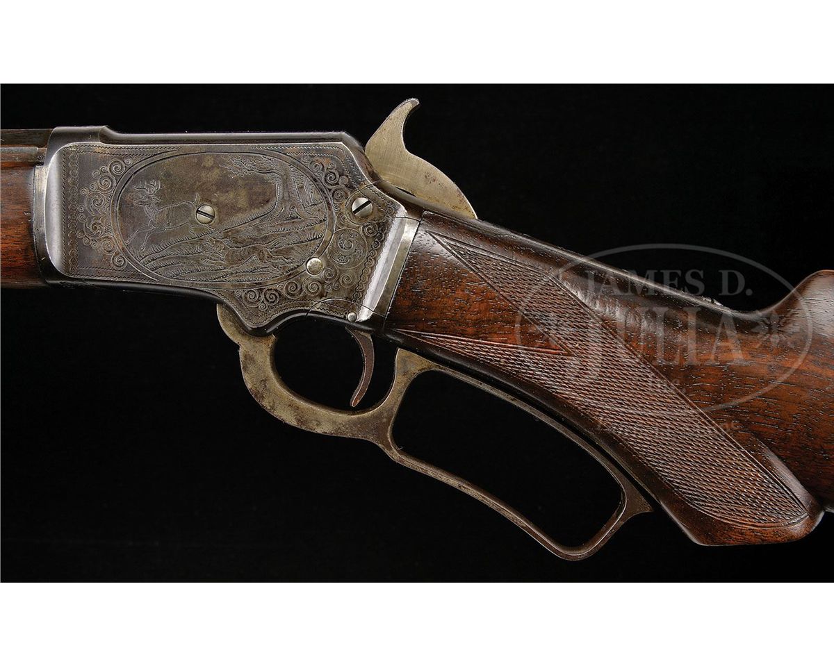 SN 275496. Cal. 22. Scarce little Marlin with 26" oct to rnd tapered lightweight bbl, 7/8 magazine with Lyman front sight, missing its bead and Marlin semi-buckhorn rear sight. Rnd top receiver is marked "MARLIN SAFETY" and the tang "MODEL / 1897". Mounted with nicely figured, tiger-striped American walnut with A-style checkered forearm and serpentine grip buttstock with crescent buttplate. Left side of upper tang, under the wood, is marked with last three digits of matching SN. Full SN is found in top tang channel of buttstock and inside buttplate. Receiver is engraved in #2 style on left style which consists of the large vignette of a running whitetail buck being chased by hound through woodland scene surrounded by light arabesque patterns. Right side is engraved in #1 style consisting of foliate arabesque patterns with a couple of very deep engraving cuts. Matching patterns extend over top & bottom of receiver & top tang. Engraving is probably by Conrad Ulrich. The Model 1897 Marlin was in production for about 20 years, 1897-1917, with about 125,000 rifles produced. They were mostly considered to be a boy's or lady's rifle and are very rarely found embellished in any way. Engraved '97s such as this are very rare. CONDITION: Fine. Bbl & magazine tube retain about 60-65% orig blue with the balance turned plum with a few scattered small spots of rust and a small cleaned area about mid-point on the bbl; receiver retains 20-30% dark case colors with the balance a dark patina; bolt retains strong orig blue with a small shim installed in bottom edge; lever & hammer are mostly case colors turned silver, dark on outer faces of lever. Wood is sound and retains about all of a restored finish with freshened checkering. Mechanics are fine, bright shiny bore. 4-49508 JR396