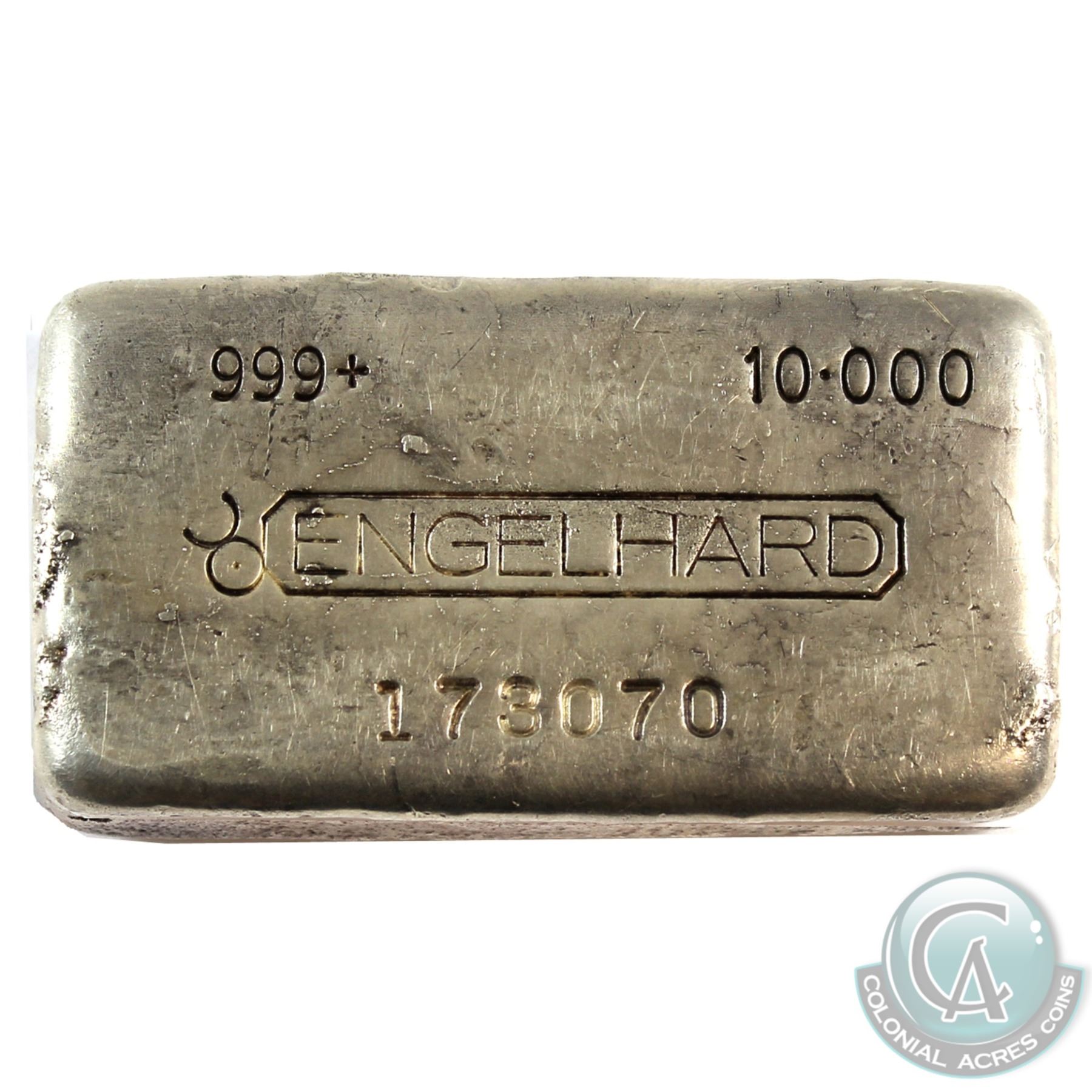 SCARCE! Engelhard 10oz '4th Series' Fine Silver Bar (TAX Exempt). Serial # 173070. This bar contains the dimensions of the 4th Series Canadian Production bars. Contains the center decimal on weight class as well as the dot in Bull logo.