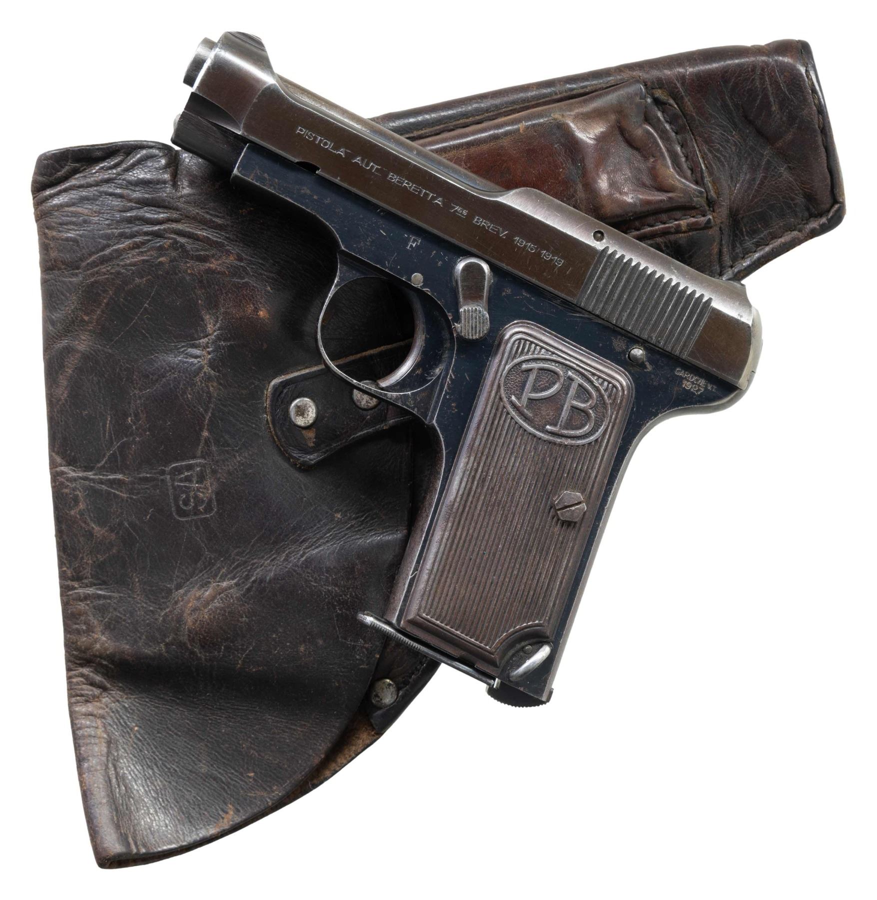 PISTOL WITH FINNISH MARKED HOLSTER. Cal. 7.65mm. S# 223328. Bbl. 3 5/16". Model 1919 (commonly referred to as the "Model 1915-1919" or "Model 1922") semi-automatic pistol mfg. by Beretta in 1927 and subsequently sold to Finland. A combined total of approx. 1,500 Model 1917 and Model 1922 semi-automatic pistols were purchased by Finland from Beretta in 1940. The left side of the slide is marked "PISTOLA AUT BERETTA 765 BREV. 1915 1919". Left side of the frame is marked "GARDONE V.T./ 1927", with a Finnish square boxed "SA" proof marked on the right. Metal components exhibit a blue finish overall, with the slide and upper rear portion of the frame exhibiting a plum coloring. Frame is mounted with 2-piece grooved steel grips, with an encircled "PB" at the top of the panels. Left grip screw is an incorrect replacement. Fixed blade front sight and V-notch rear sight. All serialized parts are matching and include the frame, slide, and bbl. (right side of lug). MAGS: 1 8-rd. mag. with transverse indicator windows. 1 .32 ACP blued mag. marked "MEXICO" on the toe of the floorplate. UNATTACHED ACCESSORIES: a rare Finnish brown leather Beretta pistol holster marked with a boxed "SA" on the closure flap. Rear of holster features a single wide black leather belt loop, which appears to be arsenal added. CONDITION: metal components retain large amounts of their blue finish, exhibiting mild edge wear and thinning, scattered handling marks, and some spots of light to mild surface oxidation overall. Grip straps exhibit moderate wear and thinning fading to gray patina, with mild pitting/surface oxidation. Right side of slide (above and just forward of serrations) exhibits heavy striations from prior cleaning, with the rear of the slide and top rear of the frame exhibiting heavy prior cleaning. Bore exhibits consistent moderate pitting, while retaining strong rifling throughout. Proper manual mechanics. Grips show a gray patina, with some scattered spots of light oxidation and pitting. Holster remains malleable, exhibiting moderate wear and creasing, as well as some age related cracking and crazing, but otherwise remains sturdy and serviceable. A scarce example of a seldom encountered Finnish Model 1919 (M1922) semi-automatic pistol, complete with a Finnish marked holster. (25-4088/MLW). CURIO. $1,200-1,800.