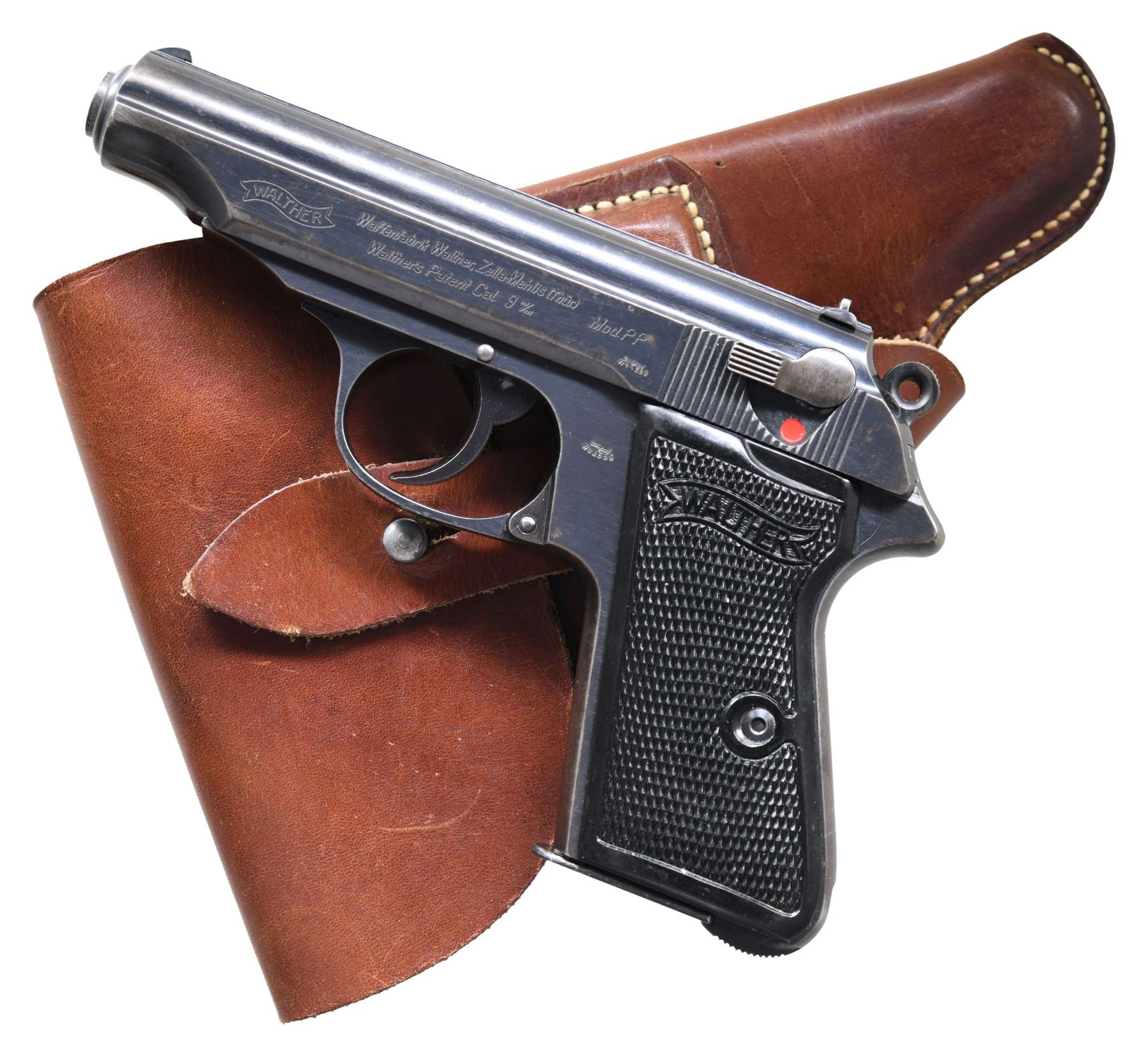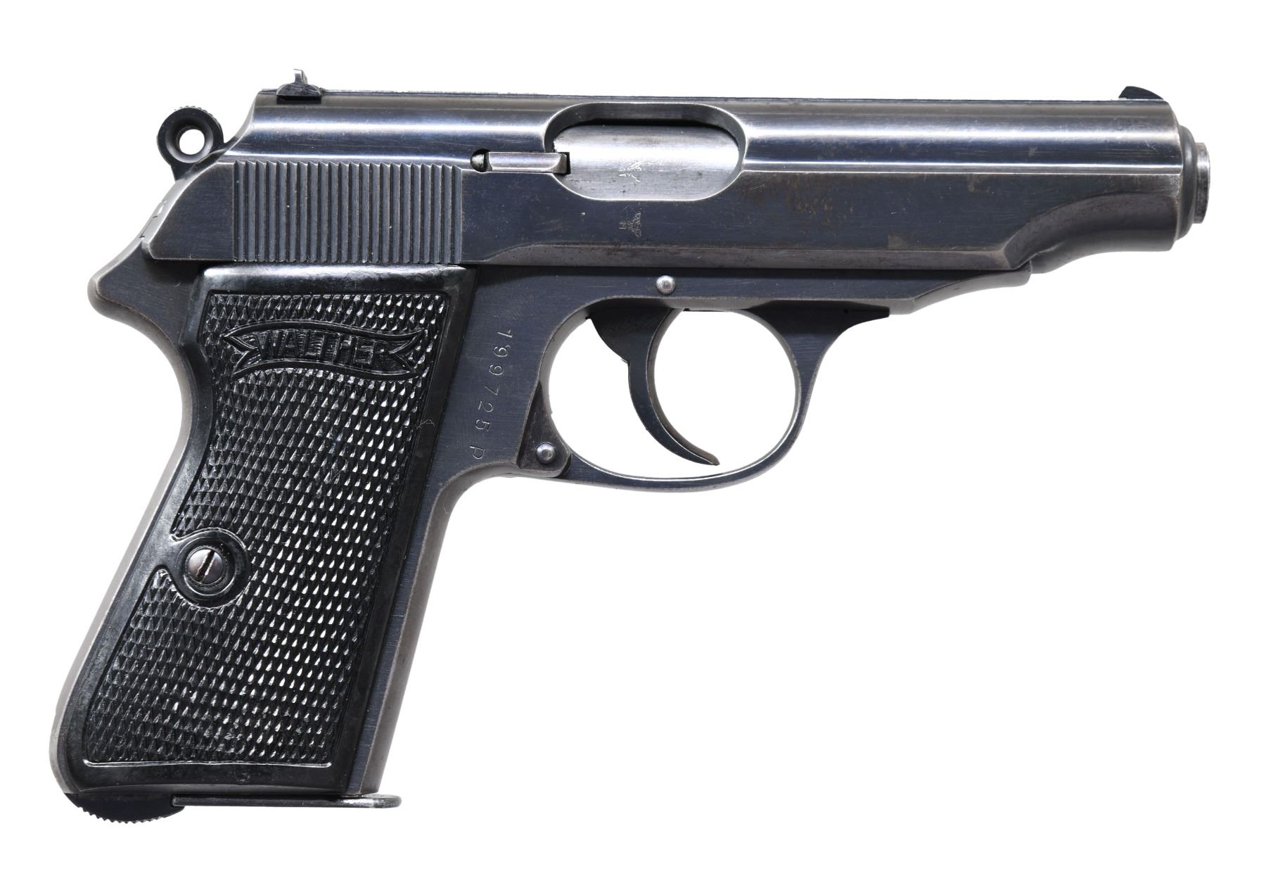 9MM KURZ SEMI-AUTOMATIC PISTOL WITH HEEL MAGAZINE RELEASE & HOLSTER. Cal. 9mm Kurz. S# 199725P. Bbl. 3 7/8". 1 of only approx. 1,500 9mm Kurz Model PP semi-automatic pistols mfg. by Walther for the German army during World War II. According to Rankin, these pistols were serialized within a 5,000 S# block, with Jan C. Still indicating that an estimated 1,500 were procured for the army from 1940-1945. The left side of the slide is marked with the Walther banner logo, followed by Walther's mfg. information, as well as the model and cal. designations. Left side of the frame and slide exhibit an Eagle/WaA359 acceptance proof. Right side of slide and bbl. exhibit a German Eagle/N commercial nitro proof. Metal components exhibit a blue finish overall, save for on the chamber, which is polished in-the-white. Frame is mounted with 2-piece Walther banner checkered black synthetic grips. Slide features a grooved rib, with a fixed blade front sight and dovetailed U-notch rear sight. Frame features a heel mag. release. Interior of slide is matching to the frame via the 3-digits of the S# "725", which are inscribed on the left slide wall, parallel to the ejection port. MAGS: 2 blued 7-rd. 1 mag. is blank, with the other marked with the Walther banner logo above "Cal. 9 m/m" on the left side. Unmarked mag. has been modified at one time, with a small half-circle cut made on the forward right edge of the body, a circular incision made on the left and right sides of the body, and with the right incision having been filled in. UNATTACHED ACCESSORIES: brown leather holster marked "hsy" on the rear of the belt loop. CONDITION: metal components retain the majority of their original factory blue finish, exhibiting some areas of light to mild wear and thinning, as well as scattered spots of light surface oxidation and pitting overall. Grip straps exhibit mild to moderate wear and thinning that shows through to a gray patina. Mirror bore, exhibiting a few scattered spots of light to mild pitting, while retaining well defined rifling throughout. Safety lever decocker functions appropriately when cycled by hand. Grips are very good, showing some smoothing, as well as a few superficial marks from handling and storage. Holster remains malleable, exhibiting some wear and some scattered marks from handling and storage. (24-6811/MLW). CURIO. $2,000-3,000.