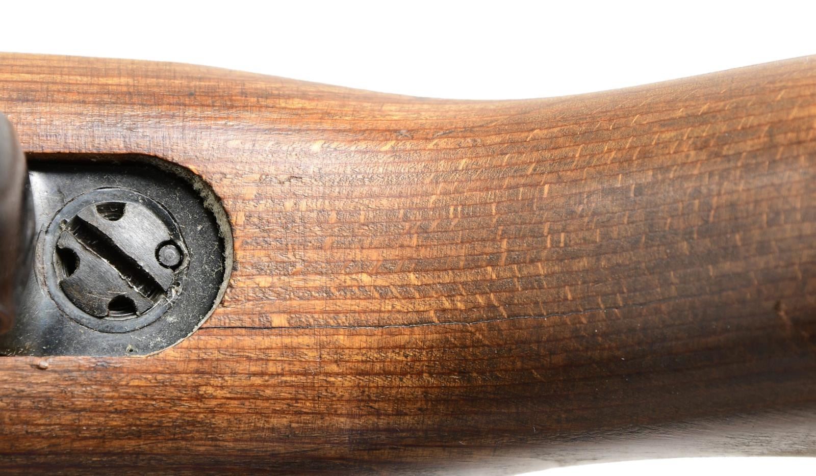 Cal. 8mm Mauser. # 9370b. Bbl. 21 3/4" threaded. Blade front sight w/ hood. Rear sight ladder is missing. Scarce Gustloff made G43 WW2 rifle assembled at Buchenwald. The Buchenwald facility was destroyed by an RAF raid in August 1944 ceasing production. Left side of rear sight base is marked w/ a star, "bcd", serial number & "G43". Stamped matching numbers on bolt carrier, stock, bolt body & firing pin housing. Matching electro pencil numbers on locking lugs & gas piston. Blued & phosphate finishes. Laminated stock set w/ left side sling provisions. Left side of butt has two eagle "749" Waffenamts. Underside of butt has one eagle "749" Waffenamt behind serial number. No cleaning rod present. MAGS: 3-10 rd. Two mags are coded "gcb" & one is coded "aye". CONDITION: handguard shows a few long laminate cracks, stock set otherwise shows a few chips, a couple laminate cracks behind trigger guard, scattered dings & handling wear. Metal retains 60% phosphate & blue w/ some tool marks on nosecap, scattered thinning, edge wear, fading & light oxidation. Very good bright bore w/ strong rifling. PROVENANCE: Lifelong Collection of Terrance McCarty. (24-340/MJC). CURIO. $1,500-2,500.