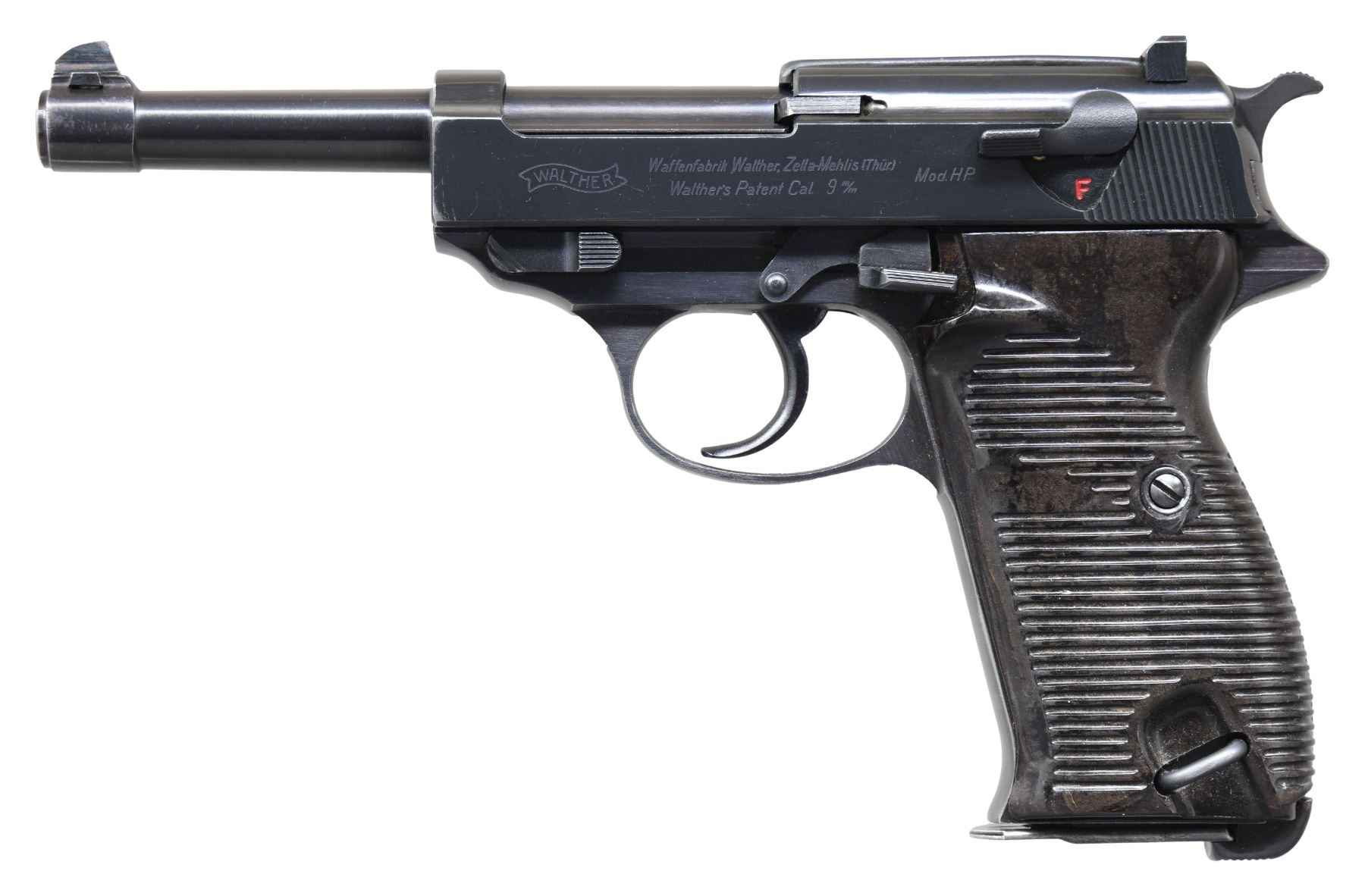 SEMI-AUTOMATIC PISTOL. Cal. 9x19mm. S# 15509. Bbl. 4 7/8". Model HP (Heerespistole "Army Pistol") semi-automatic pistol mfg. by Walther for commercial sales. The left side of the slide is marked with the Walther banner logo, followed by markings stipulating Walther's mfg. information, as well as the model and cal. designations. Right side of the slide, bbl., and locking block exhibit a German Eagle/N commercial nitro proof. Metal components exhibit a lustrous high polish blue finish overall. Frame is mounted with 2-piece grooved brown pressed resin grips. Dovetailed blade front sight, with U-notch rear sight. All serialized parts are matching and include the frame, slide (top), bbl., as well as the locking block. Hammer is a post-war phosphate finished replacement and safety lever is an aftermarket replacement. MAGS: 1 late war 8-rd. UNATTACHED ACCESSORIES: blued hammer, safety lever, and safety hammer lowering lever (all possibly original to the HP pistol series). CONDITION: excellent, with metal components retaining the vast majority of their original high polish factory blue finish, exhibiting some areas of light to mild wear, as well as some superficial handling marks overall. Very bright bore exhibiting what appears to be light to mild pitting and/or hardened grease, while retaining well defined rifling throughout. Grips show some superficial marks from handling and storage, but otherwise remain sturdy and serviceable. A very attractive example of a Walther HP pistol. (24-7096/MLW). CURIO. $3,000-5,000.