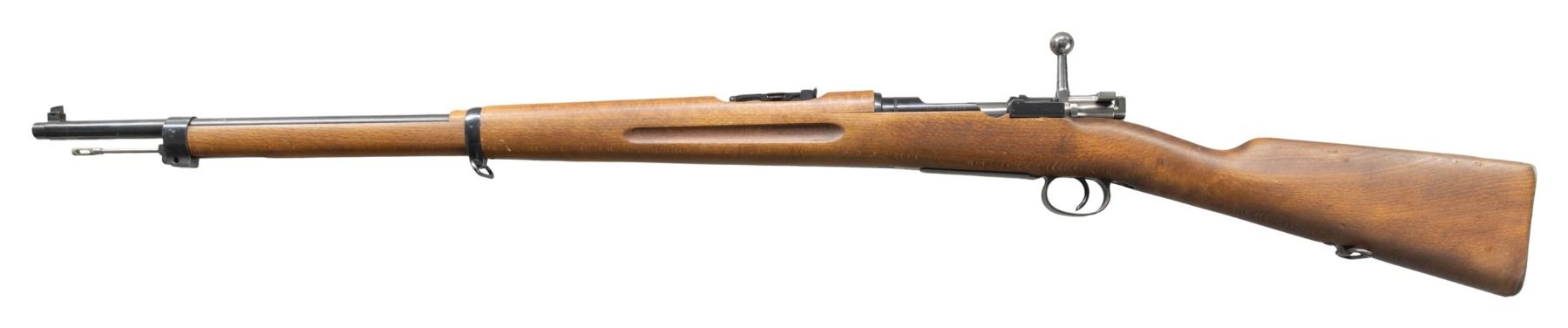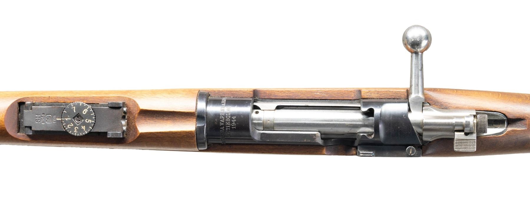Cal. 6.5x55. S# 699955. Bbl. 29" with Samco import marking. Tall blade front sight. SM sikte micrometer rear sight. Matching numbers on receiver, buttplate, bolt knob & safety. Other visible parts are unnumbered with titled crown proofs. Scarce Husqvarna made M96 long rifle with less than 18,000 made during WW2 for private Swedish use. Receiver ring has Husqvarna markings & 1944 date. Blued finish. Beech stock set with bottom mounted sling swivels. No stock disc present. Underside of wrist has strong Swedish crown proof. CONDITION: stock set shows some handling wear & light scratches. Metal retains 90% original blue with some light handling marks, fading & a few spots of oxidation. Action functions properly when hand cycled. Bright near excellent bore. (25-3850/MJC). CURIO. $300-500.