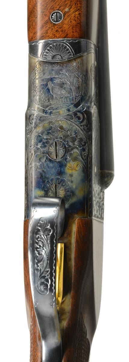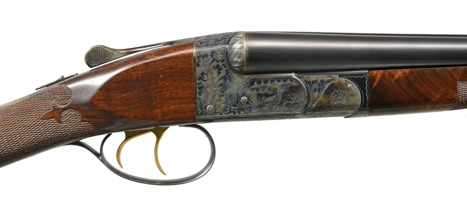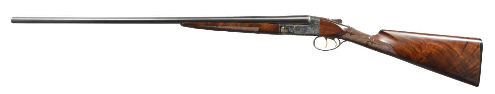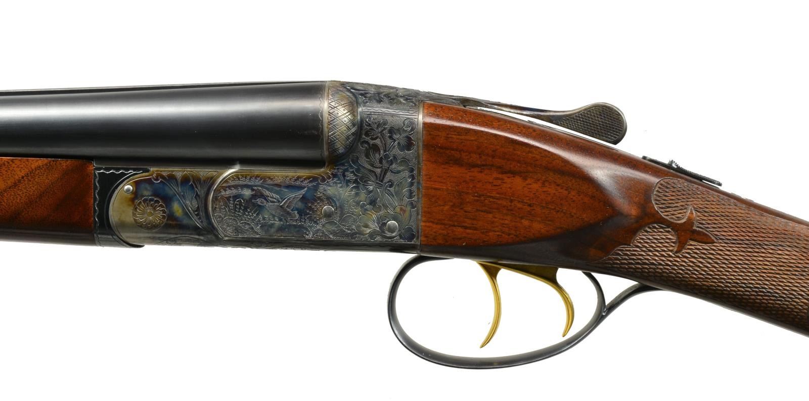 W/ CASE. Cal. 28 Ga. S# 470184. Bbls. 28". Steve Lamboy reintroduced the Ithaca NID & made it in a number of grades, calibers, & configurations between the late '90s & early 2000s. Estimated total production is 500 units. This gun is of the early American assembled series & has all correct ICD nomenclature on water table. This gun has 28" bbls. w/ slightly swamped matted concave rib & fixed chokes. Scaled down Ithaca boxlock type action w/ rotary locking bolt features automatic safety & gold plated dbl. triggers. Action engraved in usual "4E" style w/ 80% coverage lg. shaded acanthus surrounding scenes of birds on sides; duck on left & pheasant on right. Bottom of action engraved "ITHACA CLASSIC DOUBLES" "VICTOR NY" in oval band surrounding scene of standing woodcock. Blued trigger guard w/ scroll on bow & S# on tang. Nicely crotch figured American walnut, straight grip buttstock measures 14 7/8" over hard rubber ICD buttplate. Fancy pattern checkering w/ fleur-de-lis ribbons through pattern is at grip. Matching splinter ejector forend w/ inlet ebony tip has "J" spring & secondary Deely type release. MEASUREMENTS: BARRELS: Bore diameter: R .552 L .553. Restriction: R .007 (LIGHT MOD) L .023 (FULL) STOCK: LOP: 14 7/8". DAC: 1 3/8+". DAH: 2 5/16". Cast: Neutral. WEIGHT: 6 lbs. 2 oz. UNATTACHED ACCESSORIES: original cardboard shipping box w/ this gun's S# on end label. CONDITION: very fine w/ evidence of some light field use. Bbls. w/ some silvering along top rib, action showing some hand carry wear at bottom front. Case colors remain at over 90%. There are a few minor marks in original stock finish. Bores are excellent, mechanically excellent. These guns are quite hard to find today & are quite desirable, especially in 28 Ga. (20-1660/MGM74). MODERN. $3,000-6,000.