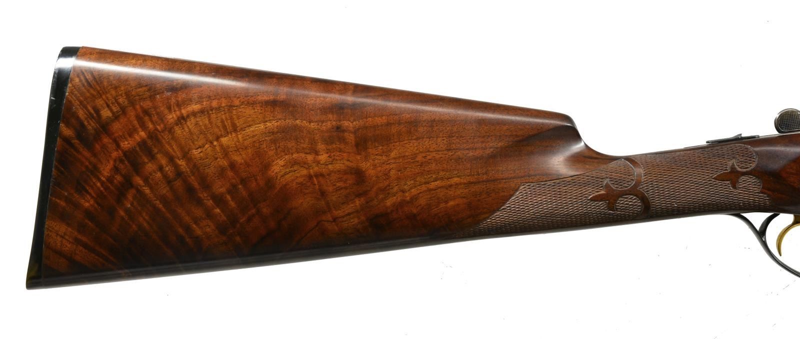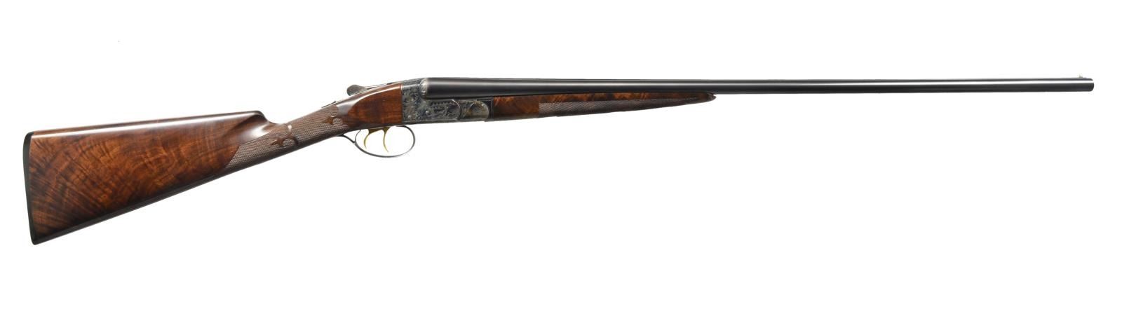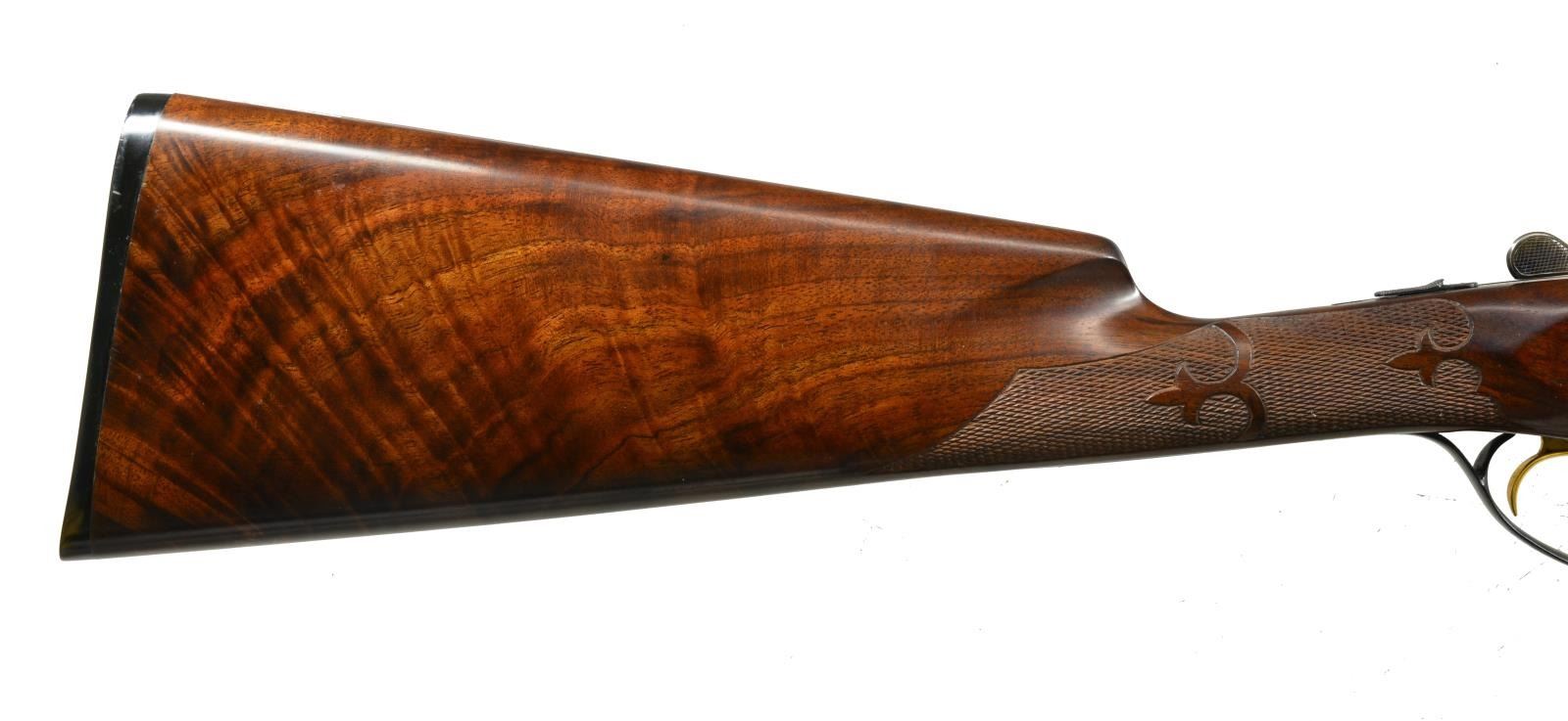 W/ CASE. Cal. 28 Ga. S# 470184. Bbls. 28". Steve Lamboy reintroduced the Ithaca NID & made it in a number of grades, calibers, & configurations between the late '90s & early 2000s. Estimated total production is 500 units. This gun is of the early American assembled series & has all correct ICD nomenclature on water table. This gun has 28" bbls. w/ slightly swamped matted concave rib & fixed chokes. Scaled down Ithaca boxlock type action w/ rotary locking bolt features automatic safety & gold plated dbl. triggers. Action engraved in usual "4E" style w/ 80% coverage lg. shaded acanthus surrounding scenes of birds on sides; duck on left & pheasant on right. Bottom of action engraved "ITHACA CLASSIC DOUBLES" "VICTOR NY" in oval band surrounding scene of standing woodcock. Blued trigger guard w/ scroll on bow & S# on tang. Nicely crotch figured American walnut, straight grip buttstock measures 14 7/8" over hard rubber ICD buttplate. Fancy pattern checkering w/ fleur-de-lis ribbons through pattern is at grip. Matching splinter ejector forend w/ inlet ebony tip has "J" spring & secondary Deely type release. MEASUREMENTS: BARRELS: Bore diameter: R .552 L .553. Restriction: R .007 (LIGHT MOD) L .023 (FULL) STOCK: LOP: 14 7/8". DAC: 1 3/8+". DAH: 2 5/16". Cast: Neutral. WEIGHT: 6 lbs. 2 oz. UNATTACHED ACCESSORIES: original cardboard shipping box w/ this gun's S# on end label. CONDITION: very fine w/ evidence of some light field use. Bbls. w/ some silvering along top rib, action showing some hand carry wear at bottom front. Case colors remain at over 90%. There are a few minor marks in original stock finish. Bores are excellent, mechanically excellent. These guns are quite hard to find today & are quite desirable, especially in 28 Ga. (20-1660/MGM74). MODERN. $3,000-6,000.