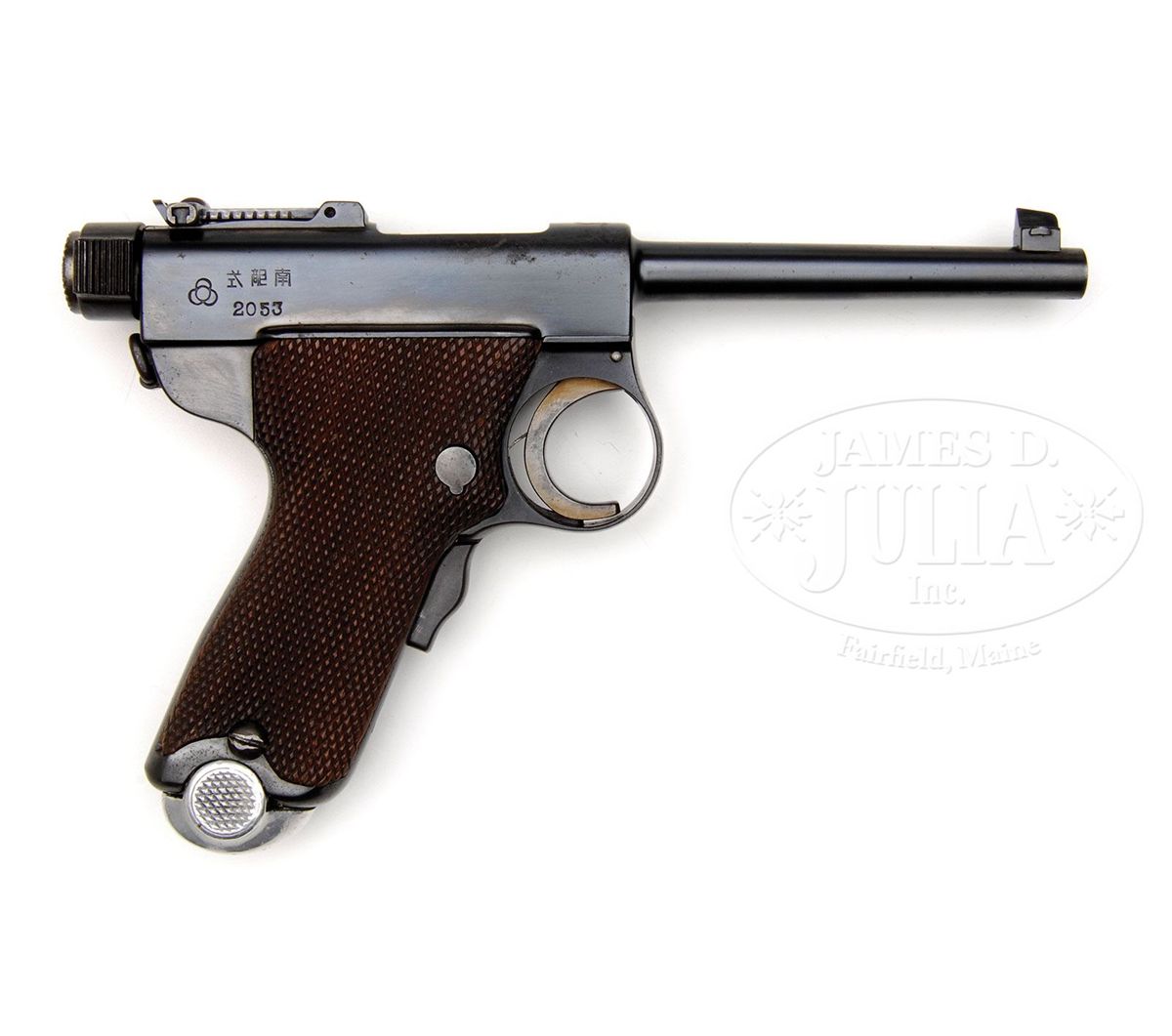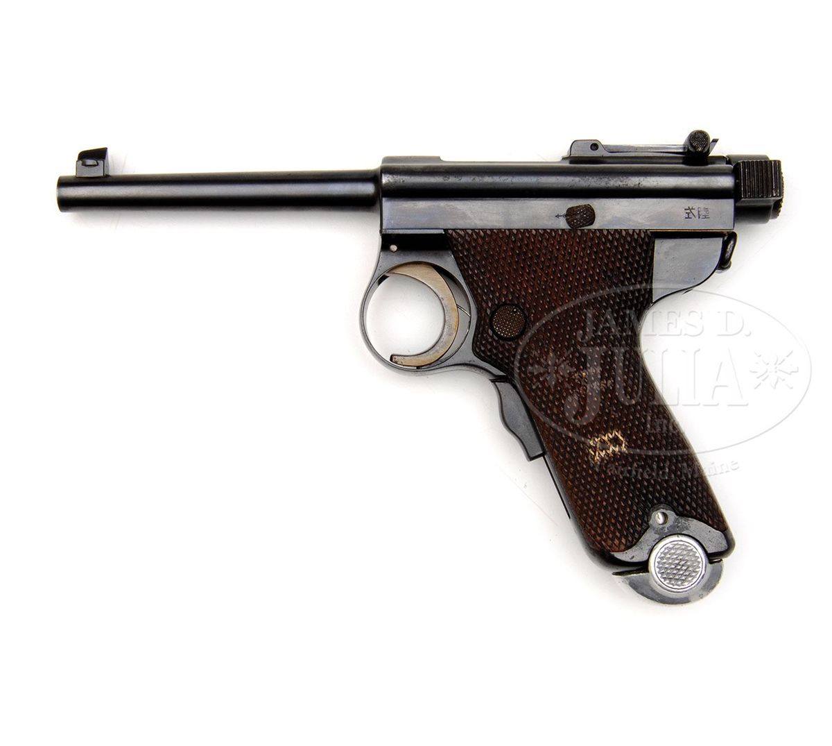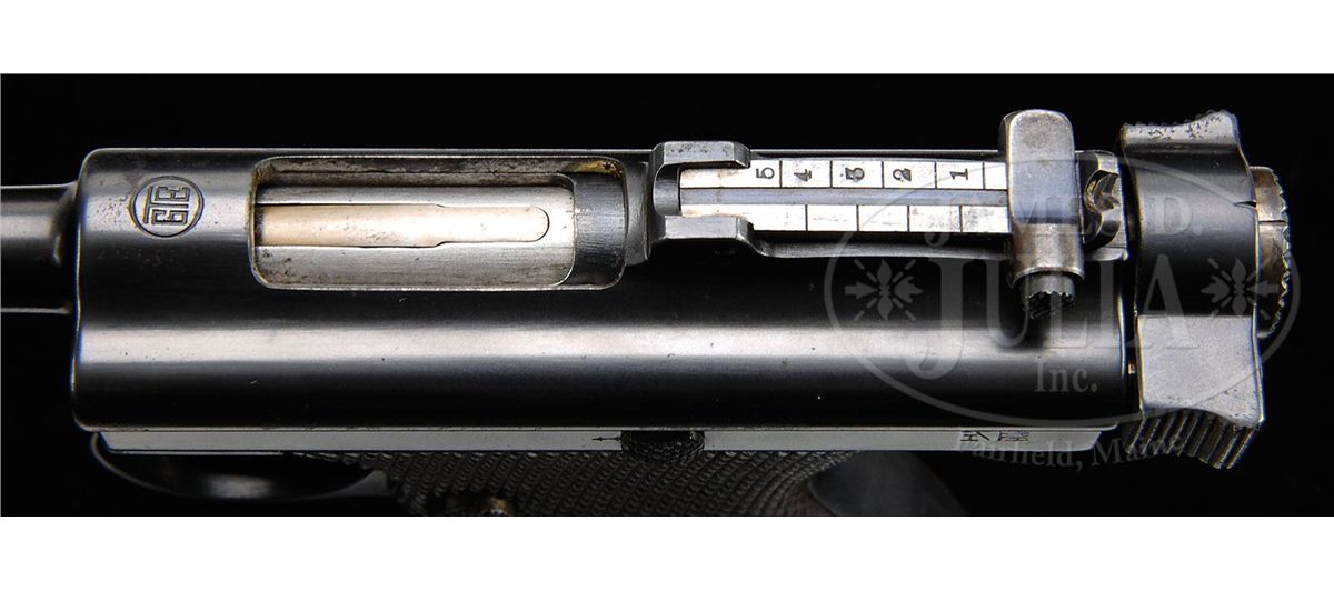 SN 2053. Cal. 8 mm Nambu. Blue finish with 4-1/2" tapered rnd bbl, pedestal mounted barleycorn front sight and 500 yard tangent rear sight. Mounted with full checkered walnut stocks that have white paint and a couple of spots on left grip. Top of frame over chamber area is marked with the "TGE" (Tokyo Gas & Electric) cartouche and right rear side of frame is stamped with the Tokyo Arsenal cartouche of four interconnected circles. Pistol has a front grip safety and an articulated lanyard loop on the back of the frame. Frame is 2-pc type. Accompanied by an aluminum base magazine numbered "2752". Backstrap has a filled stock slot. It seems that the Japanese Navy had ordered pistols with stock slots but later canceled that requirement and ordered the slot filled. Later versions of this pistol did not have a stock slot. According to Japanese Military Cartridge Handguns 1893-1945, Derby & Brown, there were only about 5,700 Papa Nambus produced by Tokyo Gas & Electric with a large number of those purchased by the Japanese Navy which bear the Navy anchor at the right rear of the frame. CONDITION: Very fine. Overall retains 95-96% strong orig blue with some light rust freckles on top right edge of frame and recoil spring housing. Magazine is fine. Grips are sound with light to moderate wear. Mechanics are fine, bright shiny bore. 4-48359