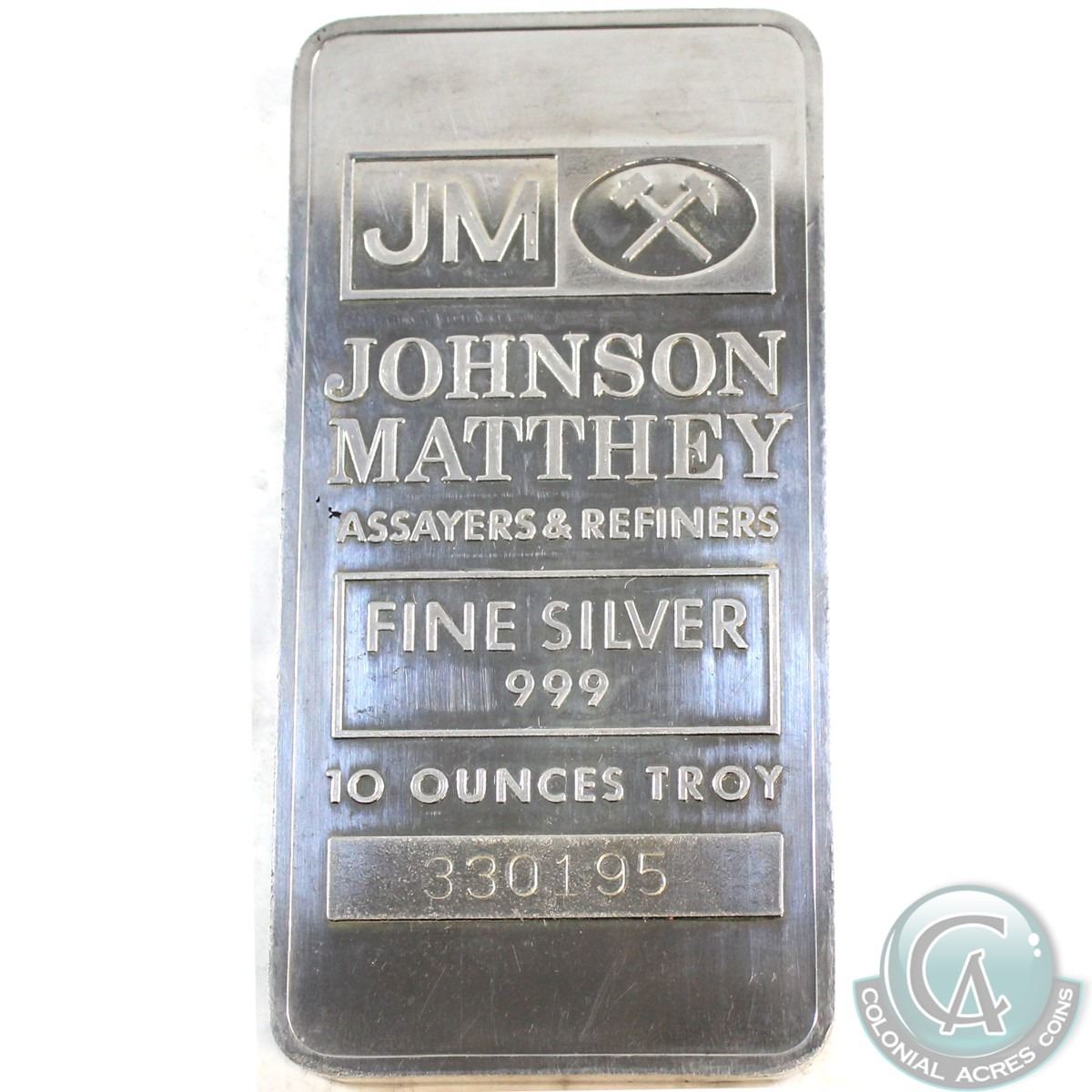 SCARCE Johnson Matthey 10oz Fine Silver Bar (Tax Exempt). Although similar to other examples, This bar contains the scarce 3 Full 'JM Logo' reverse instead of the more common 6 Full Logo.