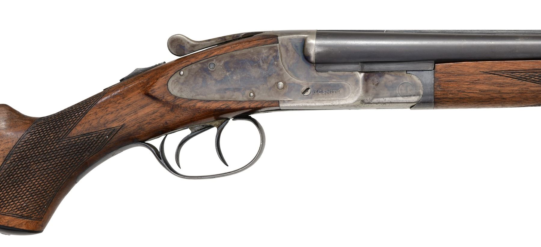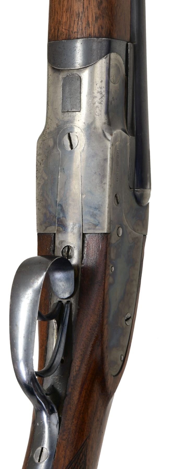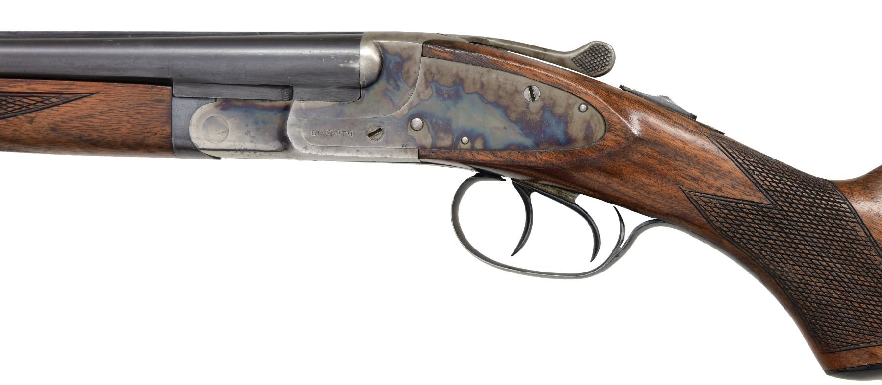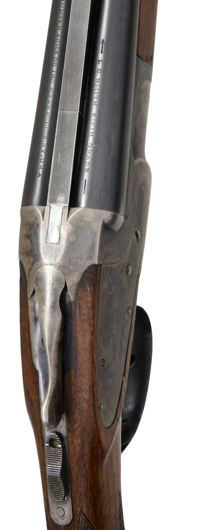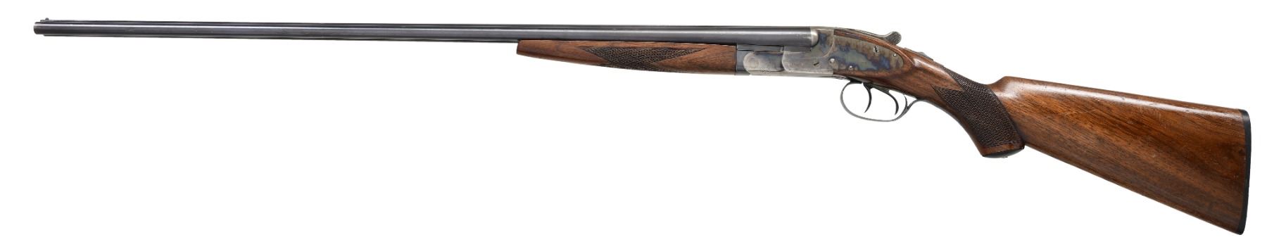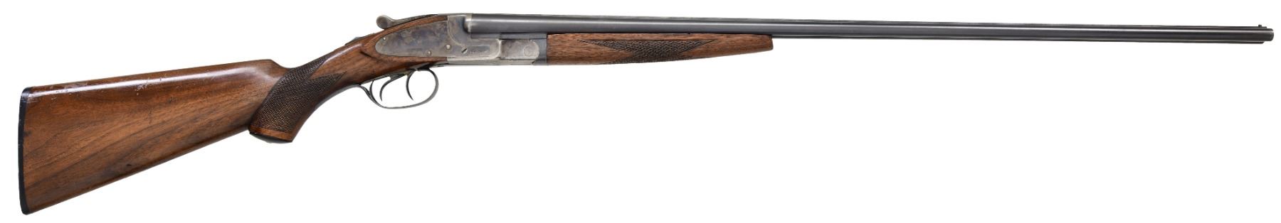 28" BARRELS. Cal. 410, 2 1/2". S# FW94970. Bbl. 28" w/ fixed full & full chokes. Case colored sidelock action. Double triggers, extractors w/ 2 position top tang safety. Splinter forearm & hard rubber capped pistol grip stock w/ hand checkering. LOP: shortened to 13 1/2" over reinstalled buttplate. Only 2,509 field grade 410 shotguns were mfg. between 1926-50. Of those, only 1,076 had 28" bbls. CONDITION: 90% bbl. blue showing light muzzle & carry wear. Action retains 80% nicely visible case colors. Original wood finish shows wear w/ scattered scratches & marks. Stock has small chips on either side of trigger plate. The forearm has a deep gouge in the rear portion of the checkering. Action is tight & crisp. Bright bores. (24-936). CURIO. $5,000-7,000.