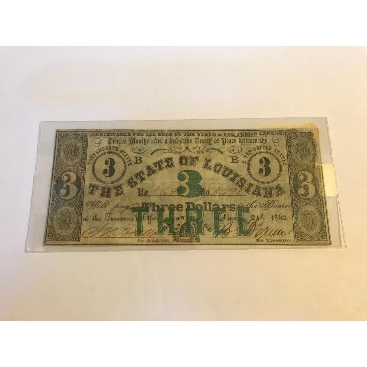 Scarce 1862 State issue State of Louisiana $3 Confederate bill, printed on the backs on former Mississippi Exchange Bank notes, displaying part of the town named "Holly Springs" & over-printed with a green "3 & THREE" displaying full small margins.Â