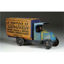 SCARCE MARX MOVING VAN. U.S.A. A hard-to-find all-tin wind-up “LINCOLN” Transfer and Storage Co. moving and packing van. Large Mack “C” cab design with original tin driver and radiator mascot. Great graphics throughout. SIZE: 13” l. CONDITION: Needs front bumper; otherwise good to very good and working. WP 1-3402 (450-650)