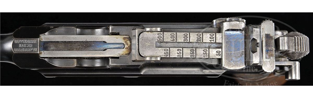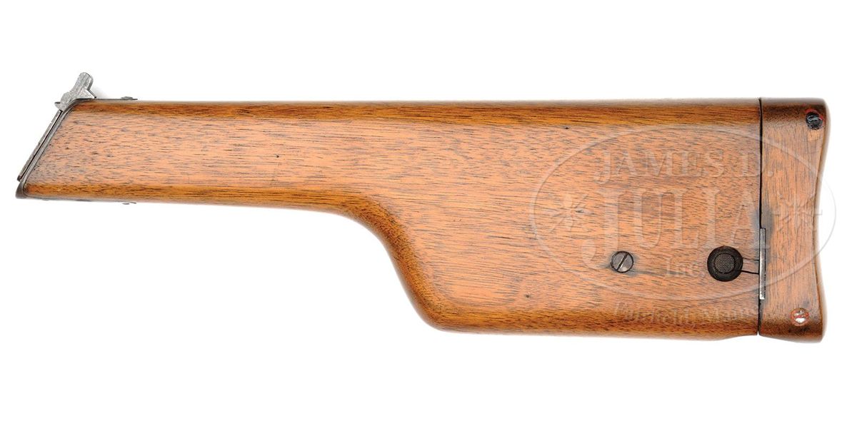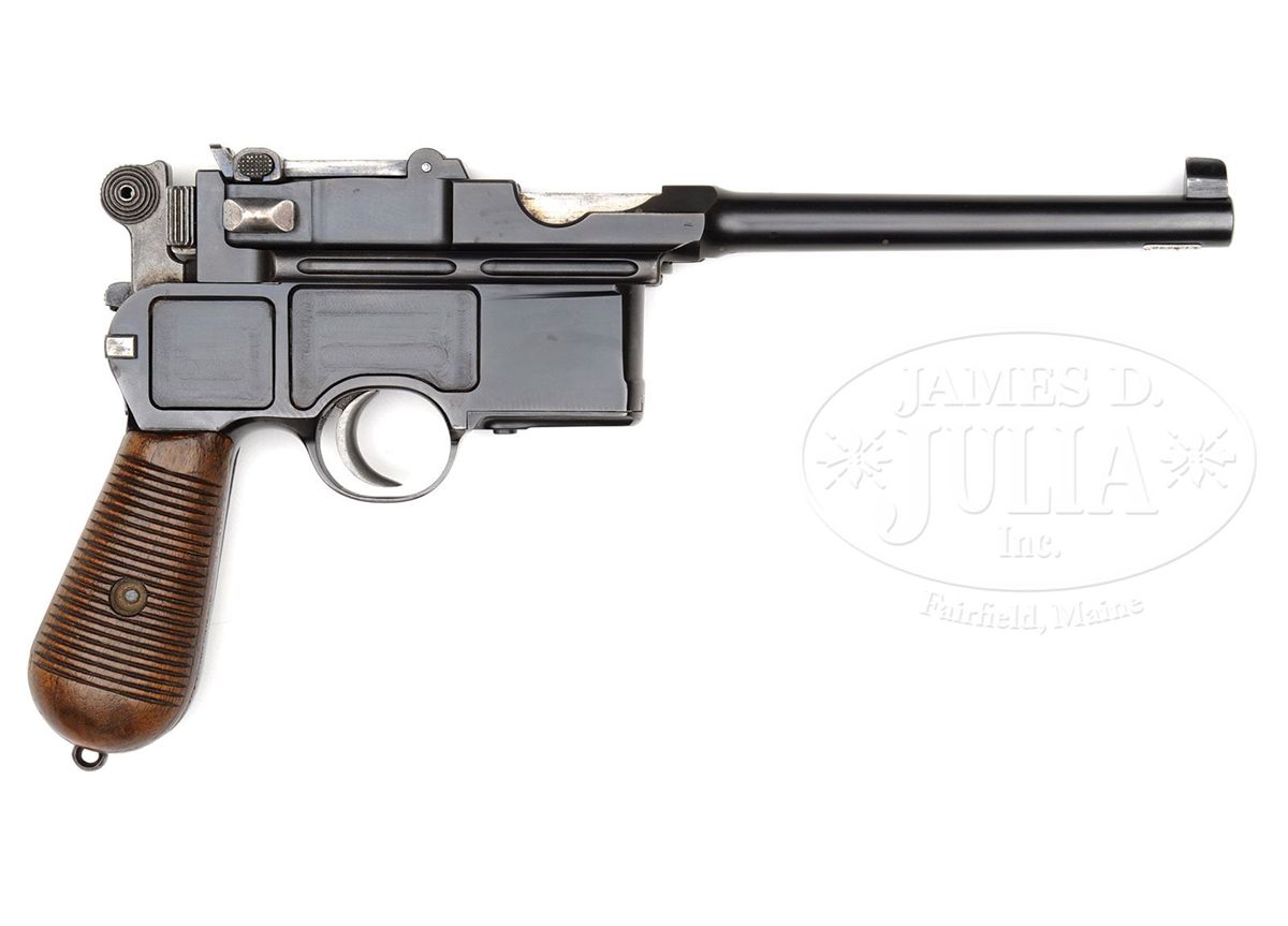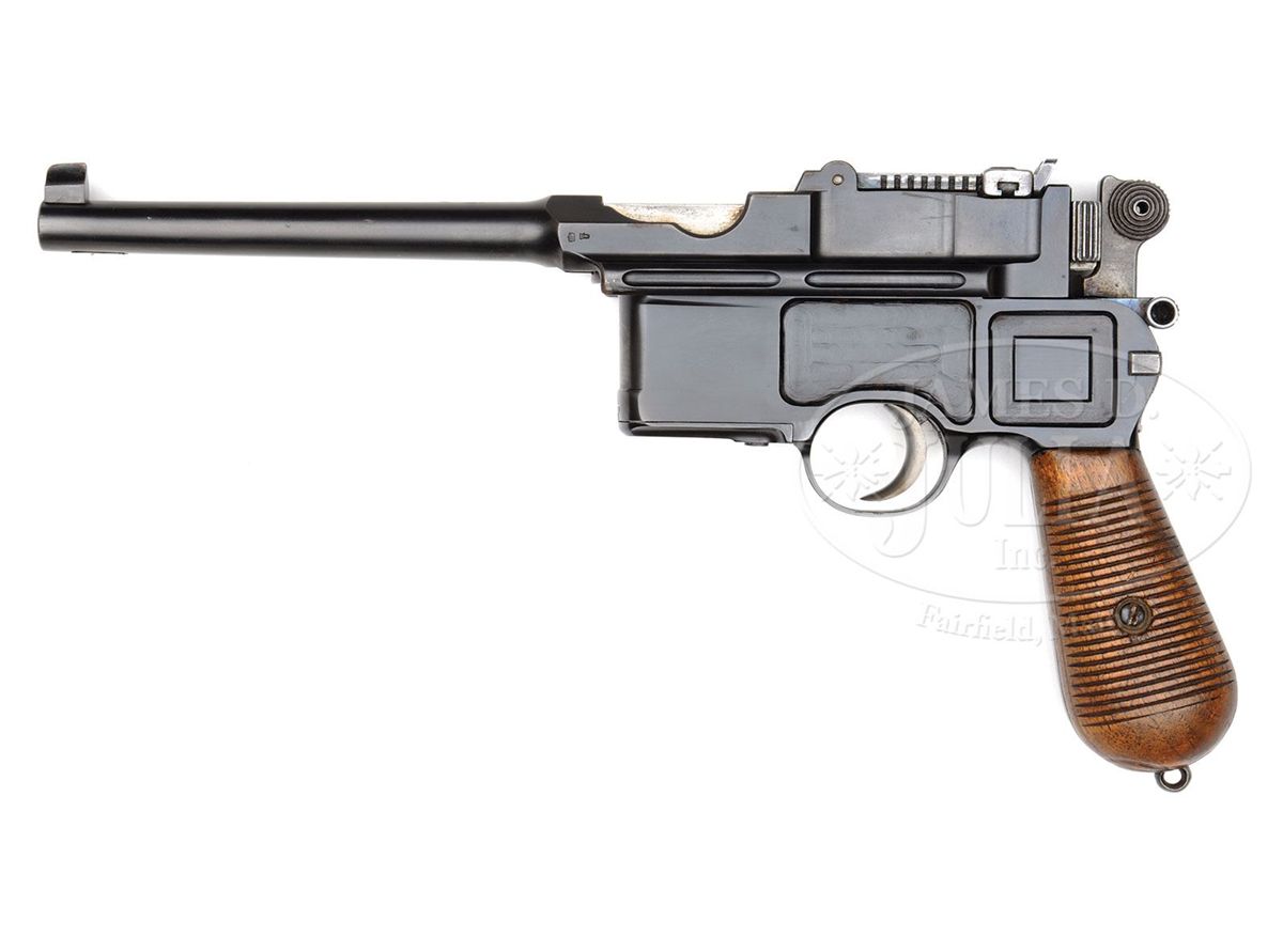 SN 12134. Cal. 7.63mm. This scarce and rarely encounter C96 six shot has a 5.5" barrel with a pinned 50-500 rear sight. Usual chamber address and Crown/Crown/U marking on the left chamber. Antler proof on the right. The full or matching serial number is externally visible on the bolt stop, firing pin retainer, under the floor plate and on the frame just below the locking lever. Disassembly shows all matching parts (including the firing pin) with repairs to the locking lug and sear. Original Conehammer grips. No lanyard ring. Correct Conehammer shoulder stock whose lid has a single notch for the safety and lug numbered 134. PROVENANCE: Dr. Geoffrey Sturgess Collection. CONDITION: 98% restored finish with panels on the left side of the gun noticeably deeper than the panels on the right side. The button on the sight cursor is stuck (probably needs oil) preventing cursor movement. Fire blue on the small parts has not been touched and is appropriate for a pistol with 70% original finish. Grips still have some of their original varnish, are sharply serrated and fully factory number to the pistol. The shoulder stock has been sanded and refinished. Two cracks in the body have been repaired. A crack that has split the lid in two has been repaired with a pair of transverse dowels whose ends appear as darker stains. The lid opposite the hammer has been fitted with a rectangle of replaced wood measuring 5/8" x 1/2". Though the lug has the same three last numbers of the pistol, it has been renumbered with the large font for much later production. Although restored and accompanied by heavily repaired stock, this is still a very unusual Conehammer. 4-53016 LMA84