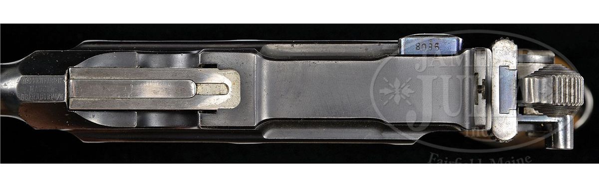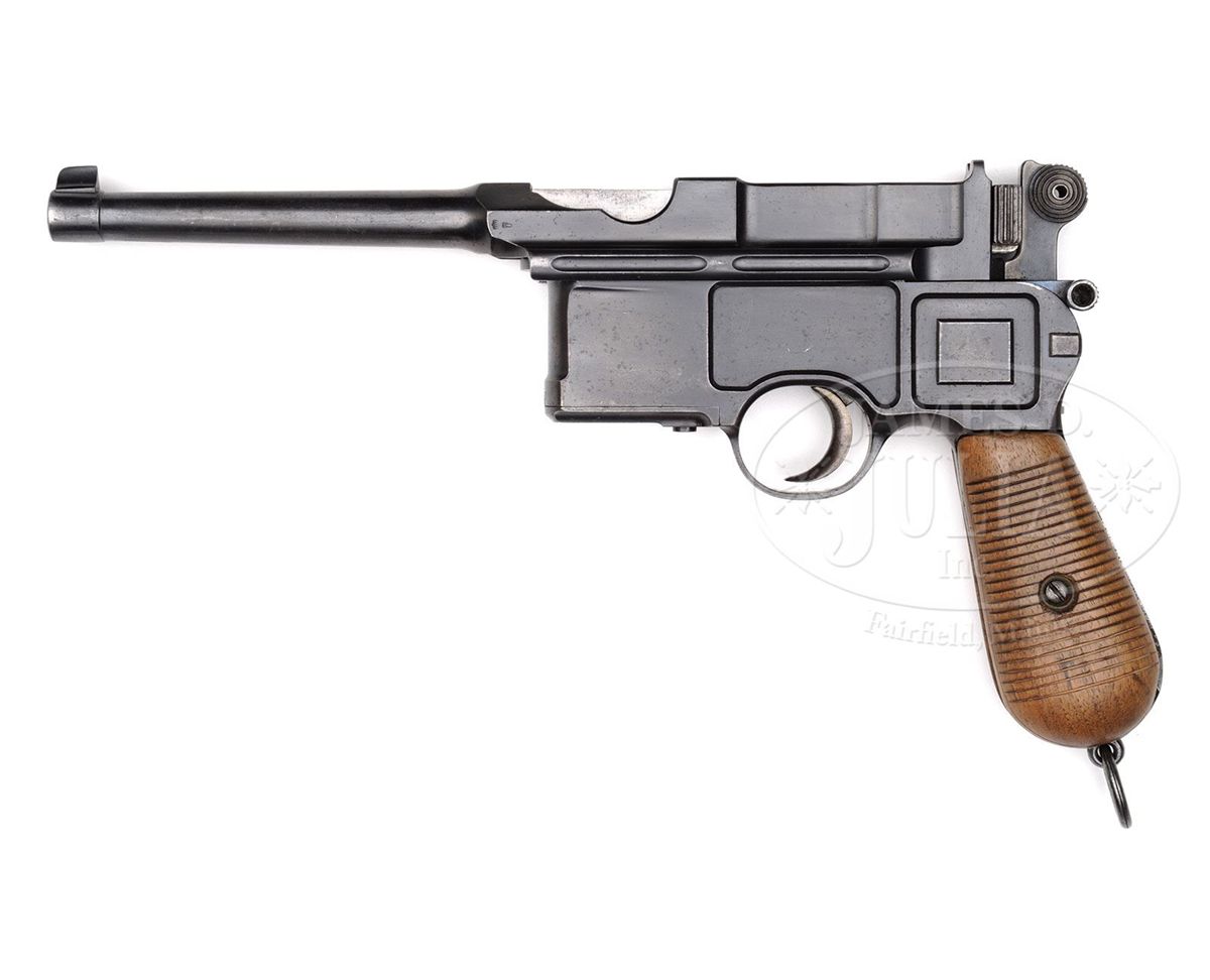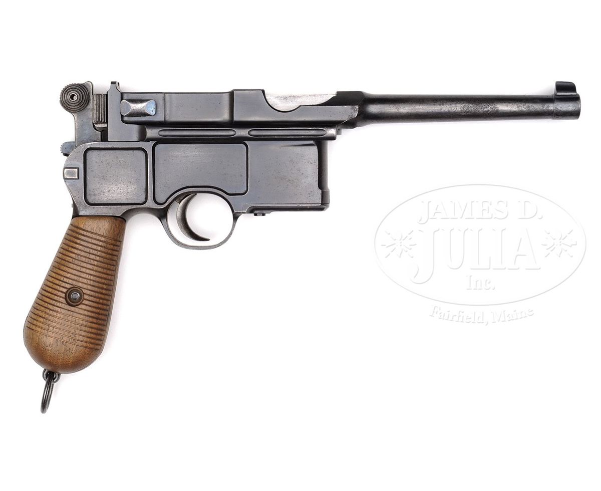 SN 8086. Cal. 7.63mm. Mauser made relatively few 6-shot pistols, Conehammer variations being the earliest and most desirable. This gun has a 4.75" bbl with a fixed front and rear sight. Usual chamber address with Crown/Crown/U marking on the left side of the barrel extension and no marking on the right side. Externally, the full serial number appears under the floorplate, on the bolt stop, on the firing pin retainer, the back of the hammer and the back of the frame just below the locking lever. Detailed disassembly shows all matching numbers (including the firing pin) and fully numbered grips. The rear part of the extractor, the tapered tip, has broken off. Orig grips and lanyard ring. PROVENANCE: Dr. Geoffrey Sturgess Collection. CONDITION: Approximately 90% of slightly faded restored blue. There is no fire blue on the extractor that now appears as bare metal. Bolt stop has 50% blue, mainly in protected areas, and the fire blue of the firing pin retainer has been restored to about 95%. Hammer is color case hardened and trigger is in the white. Grips appear pale as varnish was likely chemically stripped as part of the refurbishment. Bright bore with sharp rifling and only minimal oxidation. Perfect mechanics. 4-53011 LMA103