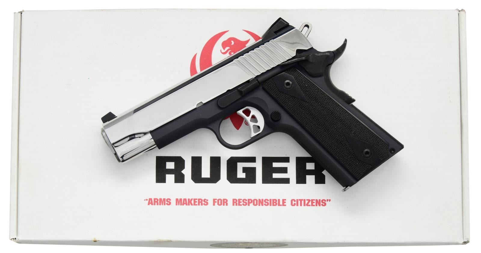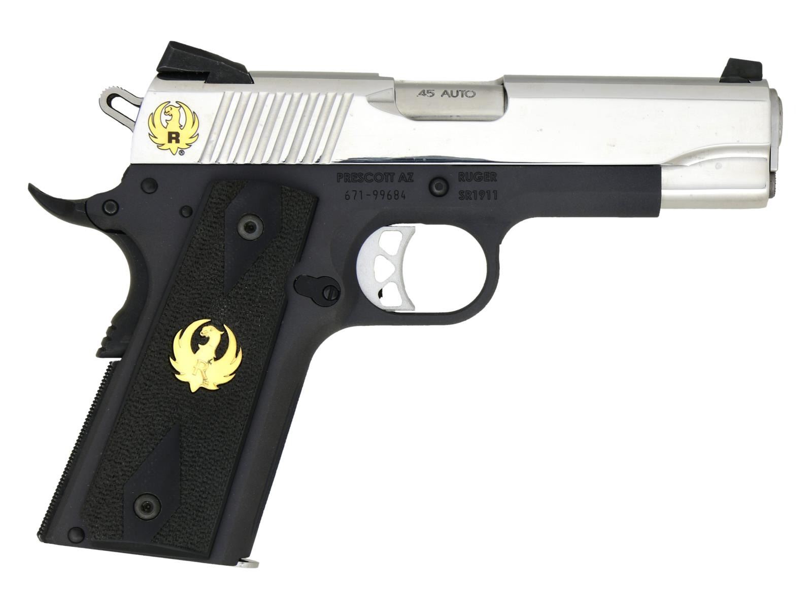 DELUXE COMMANDER CARRY COMBO SEMI-AUTOMATIC PISTOL WITH MATCHING FACTORY BOX. Cal. 45 ACP. S# 671-99684. Bbl. 4 1/8". One of only 100 Talo Exclusive Model SR1911 Deluxe Commander Carry Combo (Model #06716) semi-automatic pistols mfg. by Ruger in 2015. Right side of the slide is engraved with a 24k gold Ruger logo. Right side of the frame is marked with Ruger's mfg. information above the S#, followed by "RUGER/ SR1911". Aluminum frame exhibits a matte gray finish, with the slide exhibiting a highly polished stainless steel finish. Frame is mounted with 2-piece black textured polymer grips, with the right grip being inlaid with a gold Ruger logo. Novak 3-dot iron sights. Knife is not present. MAGS: 2 7-rd. UNATTACHED ACCESSORIES: matching factory box containing factory paperwork, spare mag., and a Ruger soft case. CONDITION: near new, with metal components retaining virtually all of their original factory finishes overall. Factory zip tie is still wrapped around the trigger, blocking the hammer. Mirror bore, exhibiting well-defined rifling throughout. Grips are excellent. Box shows some light exterior wear but otherwise remains sturdy and serviceable. (23-6925/MLW). MODERN. $1,400-1,700.