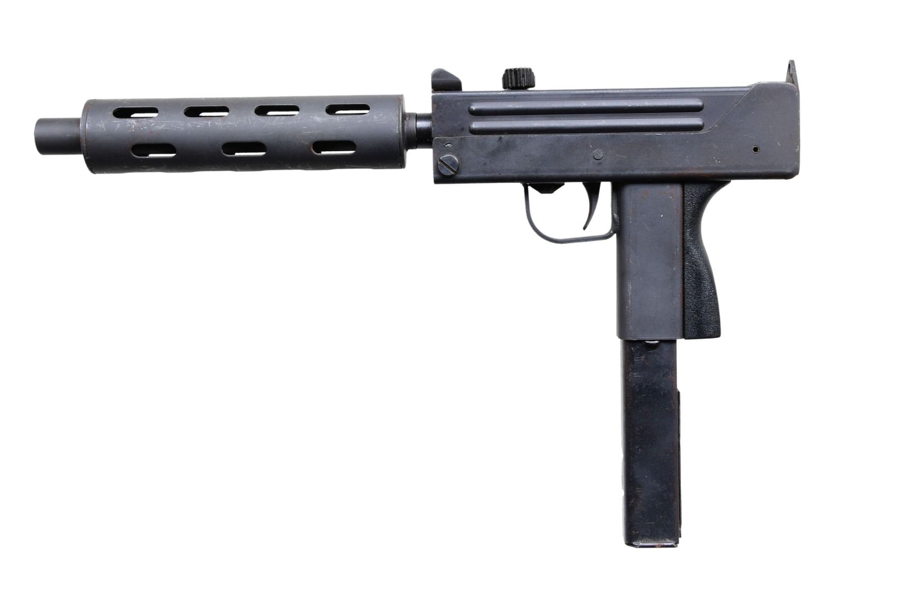 Cal. 380. S# SAP3806230. Bbl. 5". RPB's entry into the "Micro Mac" semiautomatic pistol market was the tiny M11-A1, open bolt pistol, chambered in .380 ACP. It was designated the M11-A1 so as not to be confused w/ their popular 9mm, M11 Submachine Gun. RPB M11-A1 serial numbers range from 380006 - 38011661. The semiautomatic variants were marked w/ the prefix SAP (semi auto pistol) or SAC (Semiautomatic carbine). While the traditional MAC 10 or even the 9mm M-11 were generally considered "boxey or chunky" in design, the M11-A1 was similar in size to the Colt 1911, though not quite as ergonomic in design. The suppressor users enjoyed the M11-A1s since the 380 ammo was already subsonic, just like the 45ACP and provided a very low sound signature when fired. Black parkerized finish. Protected post front sight. Rear peep sight is a hole drilled in the rear receiver extension to coincide w/ the front sight. Slotted charging knob provides an unobstructed view. The action is locked by rotating the charging knob 90-degrees in the closed position. Safety is located on the right side of the receiver, inside the trigger guard. Threaded barrel. MAGS: (2 total) 1 steel 15 rd. & 1 steel 30 rd. UNATTACHED ACCESSORIES: 7.5" slotted barrel extension & mag loader. CONDITION: Finish is complete & consistent w/ some light thinning on high spots & in areas of mechanical intervention as well as typical rub marks & drag lines usually associated w/ stacking. Some areas of gentle patina. Bright bore w/ strong rifling. Fire control mechanism appears to function correctly when cycled by hand. PROVENANCE: Lifelong Collection of Terrance McCarty. (24-139/JZ). MODERN. $500-900.