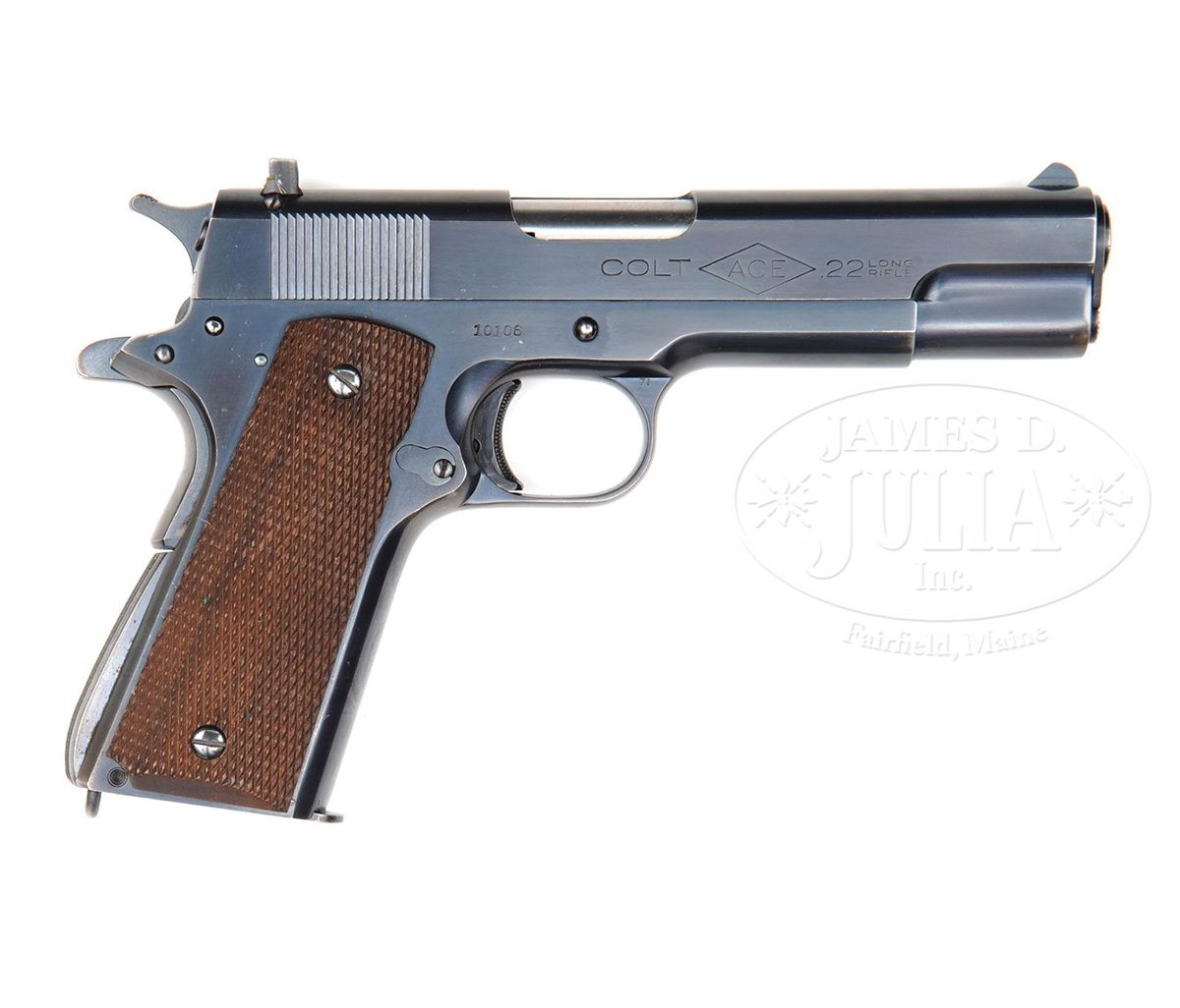 SN 10106. Cal. 22LR. Blue finish with 4-3/4" solid bbl. Adjustable rear sight and usual markings on the slide with rampant Colt at the left rear end. It is mounted with full checkered walnut grips and accompanied by one orig. all blue magazine with marked base plate. Accompanied by its orig dark burgundy, hinged lid cardboard box, matching numbered to this pistol. Accompanied by an orig bi-fold owners pamphlet, a shooting suggestions pamphlet and its orig target. According to The Book of Colt Firearms, Wilson there were about 11,000 of these pistols produced from 1931 to 1947, 10,500 of which were made through 1941. This pistol was produced in 1939. CONDITION: Extremely fine. Overall retains about 97-99% crisp orig factory blue with only faint muzzle edge wear on the slide from laying in the box. Grips are crisp and show faint diamond point wear. Magazine is very fine with thinning on both sides. Mechanics are crisp. Brilliant shiny bore. Box is fine with 3 or 4 small edge nicks and a small tear in the paper covering on the bottom. End label has a couple small wear spots, but is sharp and clear. Pamphlets and target are fine. 4-48318 JR96