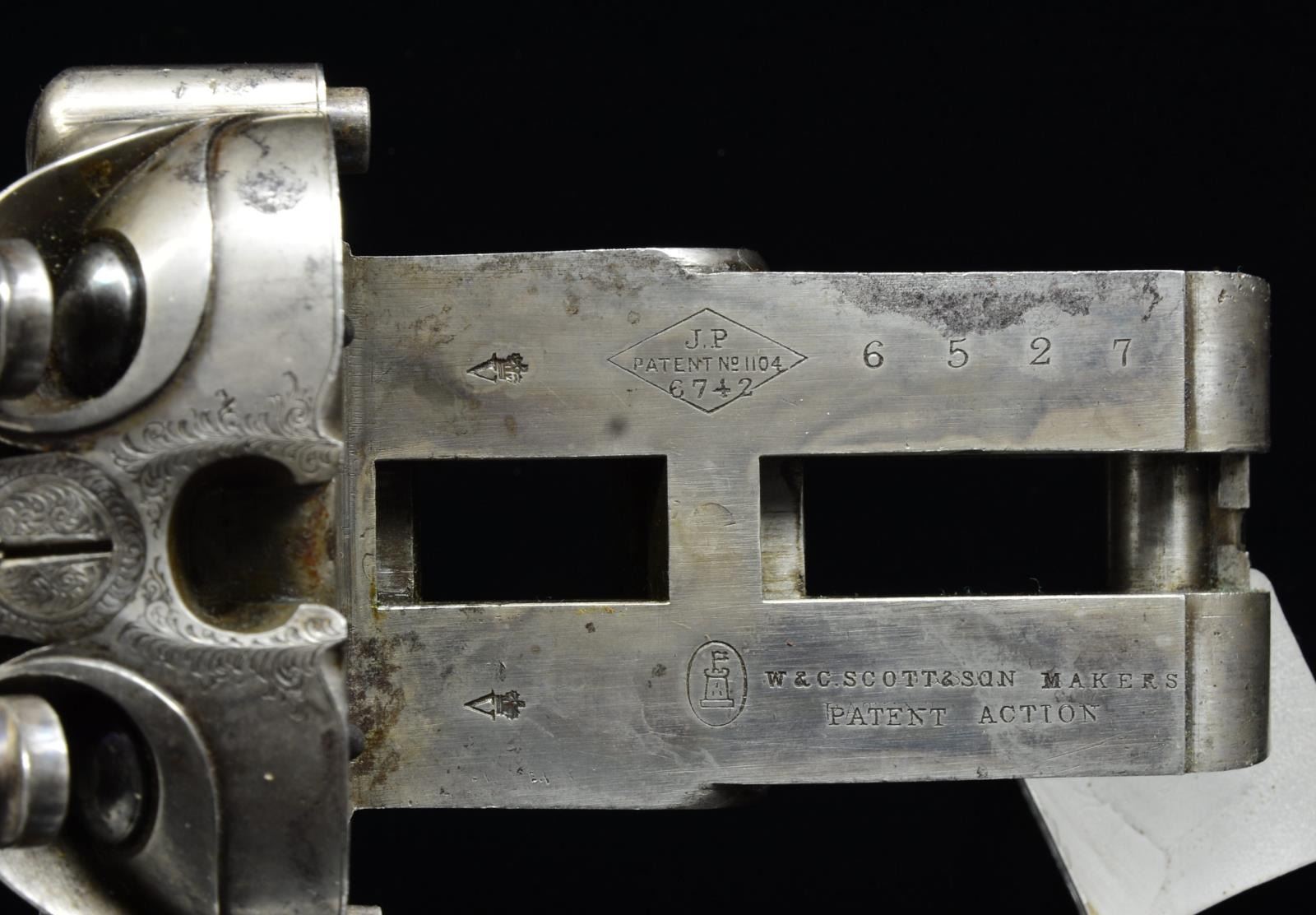 "QUINTUPLE BOLT" HAMMER SHOTGUN. Cal. 12 Ga. (2 5/8"). S# 6527. (1875). With attempts at the perfection of the breech loading system, many companies vied for ways to make the strongest possible gun action, some utilizing as many as six different bolts. W. & C. Scott came up w/ this interesting system to compete w/ W. W. Greener's very popular cross bolt. While the principal is sound, the amount of work entailed in building these guns was prohibitive & this system was abandoned upon Greener's patent expiring. This gun is fitted w/ 29 3/4" fine 3 stripe damascus bbls., w/ slightly raised game rib engraved "Scott's Patent Quintuple Bolt" w/ maker's name & "Regent Circus" London address. Bbls. have doll's head rib extension & flats are stamped w/ London black powder proofs for "13" bore. Case hardened action is fitted w/ front spring, rebounding locks w/ rnd. bodied serpentine hammers. Top lever retracts both standard Purdey underbolts & dual rnd. locking bolts on sides. Action & locks are engraved w/ sm. scroll borders w/ setter & duck scenes on sides of locks. Maker's name is on each lockplate under hammers. Stump figured & somewhat marbled dense European walnut capped pistol grip buttstock measures 14 1/4" over checkered horn buttplate. Stock features horn grip cap, point pattern checkering, drop points & silver oval. Matching splinter forend w/ shaped steel tip has Scott's patent push button release. MEASUREMENTS: BARRELS: bore diameter: R .721, L .719. Restriction: R 0 (PRE CHOKE), L 0 (PRE CHOKE). Min. Wall Thickness: R .032, L .035. STOCK: LOP: 14 1/4". DAC: 1 3/4". DAH: 2 15/16". Cast: 1/4" off. WEIGHT: 8 lbs. 5 oz. UNATTACHED ACCESSORIES: gun is housed in what appears to be its original leather case w/ cartridge mag. in top closed by lg. nickel plated brass lock marked "EXCELSIOR LOCK" & w/ patent date of 1864. Top of case is set w/ relief brass badge for the "Connaught Rangers." Interior is lined in blue green cloth & has lift out tray for action & contains key. CONDITION: very good as partially refinished. Bbls. retaining over 95% of a very fine rebrown over some fairly deep pitting toward breech end. Definition to pattern is very distinct & attractive. Action retains 10-20% original case hardening color where protected, lock plates retain 40-50% original color. Stocks retain most of what appears to be their original oil finish w/ numerous marks & dents, checkering somewhat worn. Bores are good w/ scattered pitting. Action is tight. Locks are fine. Case leather has deteriorated. Some stitching parted, interior cloth good. (01-18403/MGM88). ANTIQUE. $1,250-2,000.