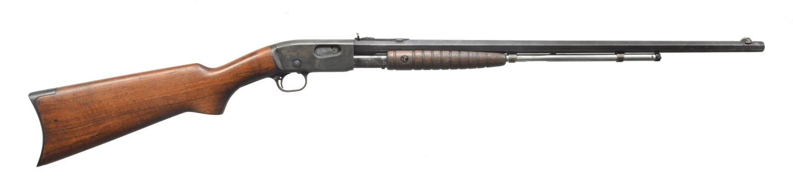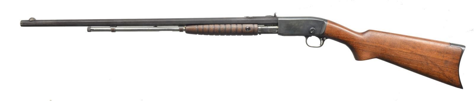 SPECIAL. Cal. 22 Rem. Special. S# 303549. Bbl. 24" tapered oct. w/ semi buckhorn rear sight & ivory bead front sight. Cal. marking is at left rear. Takedown slide action has tubular mag. under bbl. Pistol grip stock w/ American walnut has crescent steel buttplate. Forend has 10 grooves. CONDITION: good as partially refinished. Bbl. retaining most of its original blue w/ scattered flecking & light pitting. Action w/ considerable cleaning & added cold blue. Stocks w/ finish removed & some light marks. Bore is bright w/ some scattered light pits. Mechanically good. (20-3623/MGM). MODERN. $500-800.