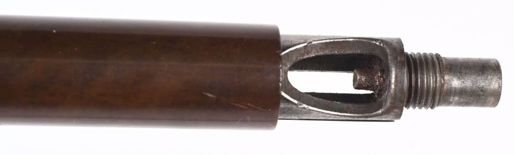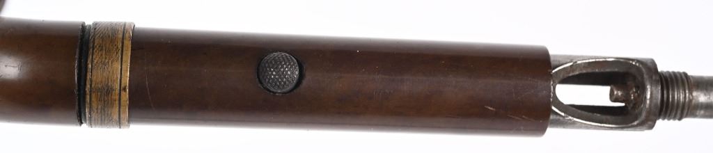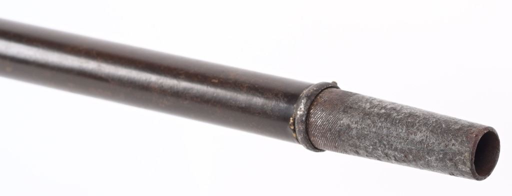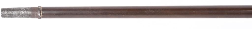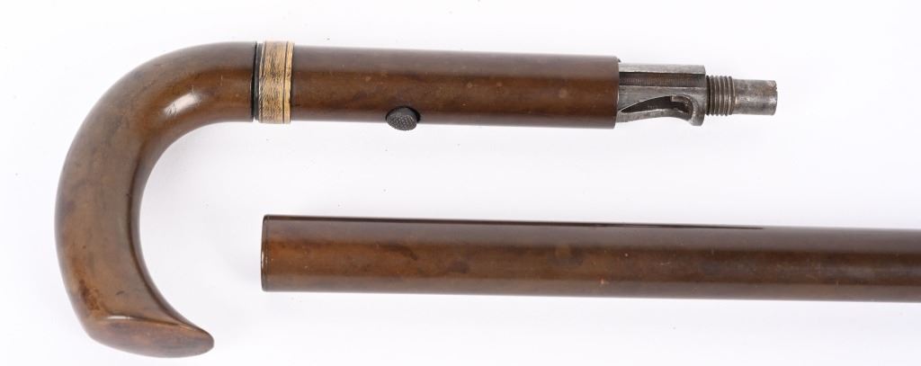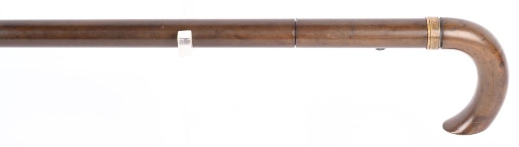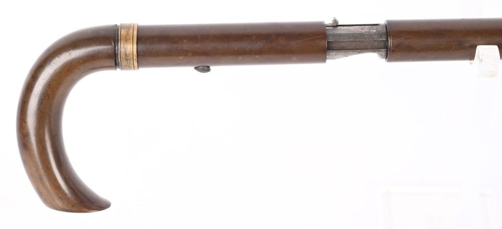 BARREL 27.5" RIFLED. CALIBER 44 percussion. Bronze toned metal shaft. Partially readable address on metal tip, horn handle, push button. Remington introduced the cane gun with a percussion version patented by John F. Thomas in 1858. Most examples feature a dog head handle, this one does not. Remington’s updated to metallic cartridges in 1866 so this gun was made from 1858-1865. Overall excellent nicely toned finish. Bore is rough. ANTIQUE