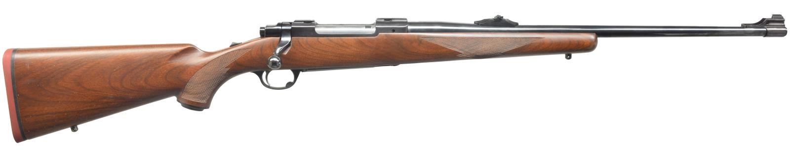 Cal. 35 Whelen. S# 772-43190. Bbl. 22” rnd. Banded ramp front w/ peep sight & screw on island rear w/ flip up adj. sight. Mfg. 1989 (1989-1992; 1912 units). Receiver cut for Ruger rings, not included. Rnd. bolt w/ tang safety. Checkered stock & checkered pistol grip. Black grip cap w/ Ruger emblem. Red Ruger recoil pad. Sling swivel studs installed. Bolt has etched matching number. UNATTACHED ACCESSORIES: original box & paperwork. CONDITION: bbl. retains most of its original blue w/ a minor scratch near muzzle. Receiver retains most of its original blue w/ minor thinning on edges. Trigger guard & floorplate retain its original finish. Stock has original finish w/ a few handling marks. Good checkering. Gun appears nearly unfired. Bore is bright. (20-4181/BT). MODERN. $600-900.